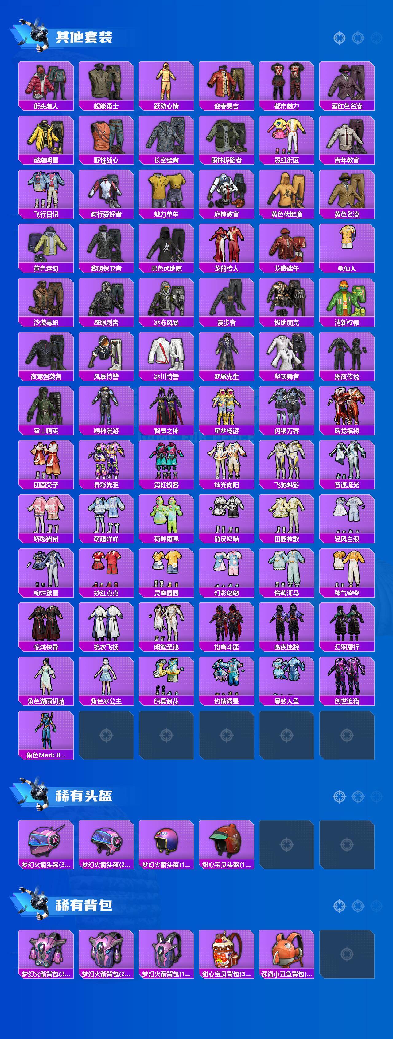 【稀有套装】:套装-龟仙人,套装-巳巳如意,玩偶服-小熊虫,套装-马上有钱,套装-雏菊兔兔,套装-萝兰蝴蝶,套装-小熊娃娃,角色-达芬奇,角色-狂花道·雅典娜,套装-糖糖葫芦,套装-青团波波,套装-棉花软糖,角色-摩登魅猫,套装-裁决天象,角色-俏兔智灵,角色-光矢逐梦,套装-燕燕于飞,套装-鱼渊荷华,角色-糖霜甜心,套装-橘猫汽水,角色-月烬之祷,角色-拉面少女,套装-雨过天青,套装-红釉青花,角色-极夜星羊