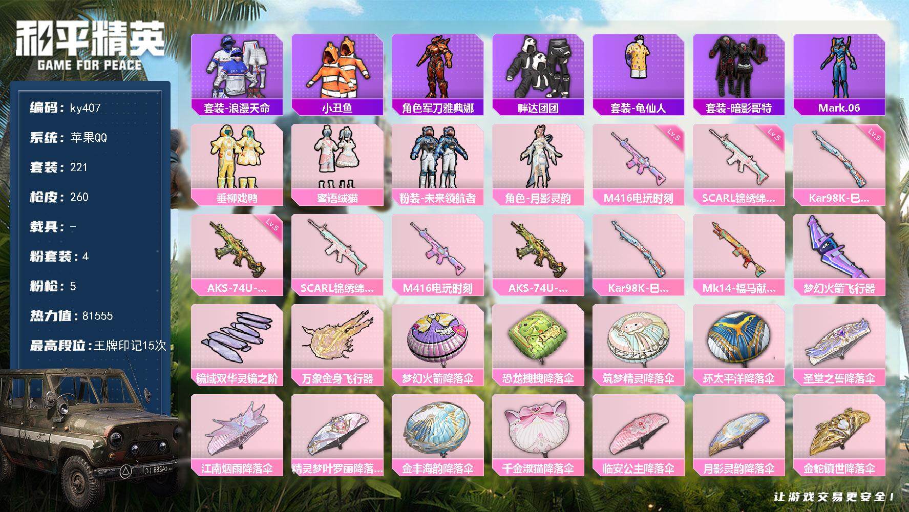 [17082272]苹果 手Q-4粉装-5特效枪-0载具-3粉色飞行器-81555热力值-15王牌印记-221套装-260枪皮