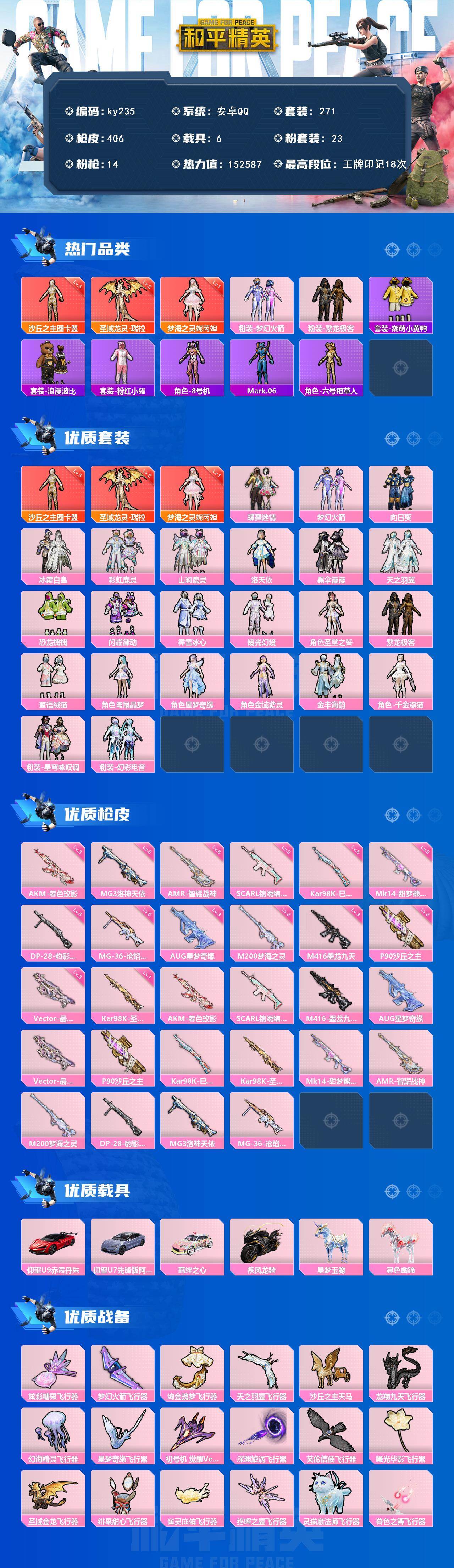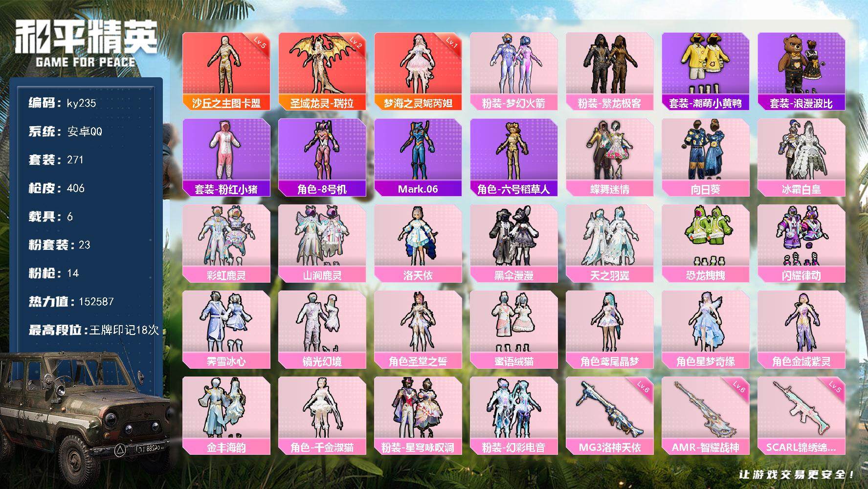 [17082433]安卓 手Q-3神装-23粉装-14特效枪-6载具-18粉色飞行器-152587热力值-18王牌印记-271套装-406枪皮
