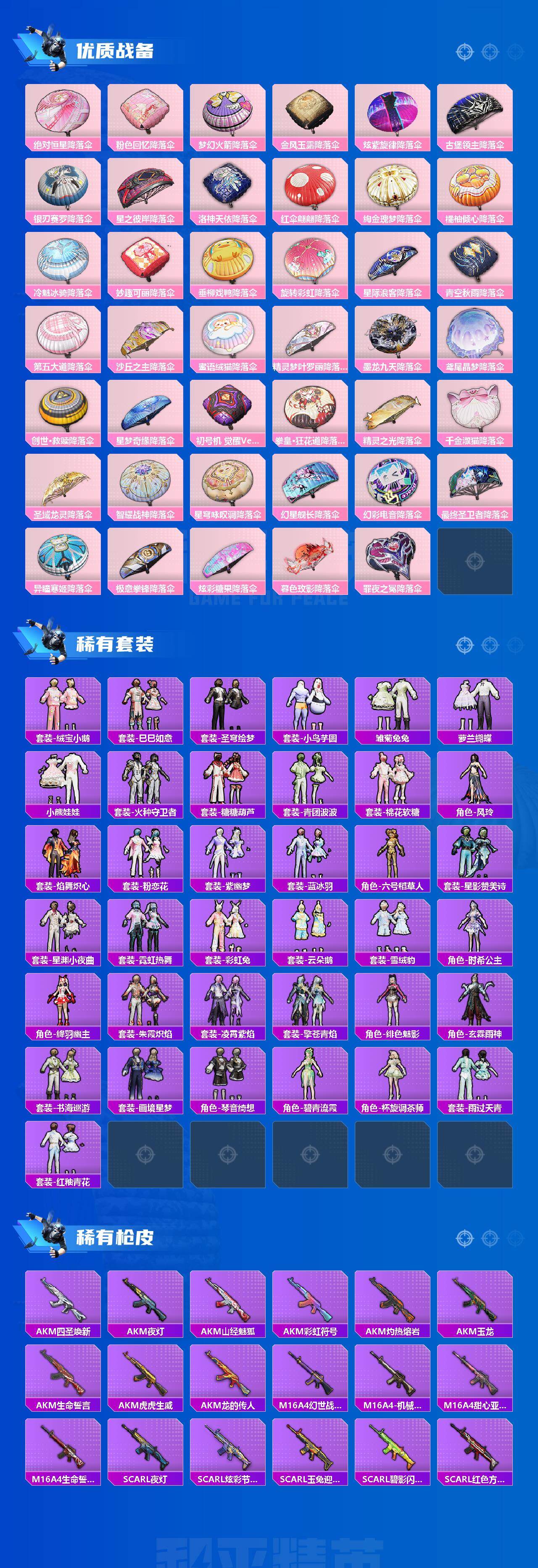 - [16817911]【店主推荐捡漏号!可直接换绑】安卓 手Q-2粉装-5特效枪-0载具-1粉色飞行器-50076热力值-8王牌印记-131套装-170枪皮 【热门品类】:套装-浪漫天命,套装-龟仙人 【粉色套装】:套装-创世·救赎,角色-绯穹魔姬 【粉色枪皮等级】:AUG-暖羊咩咩(五级),UMP45-量子极限(五级),P90-金丰海韵(七级),Kar98K-巳巳如意(五级),DP-28-豹影疾电(五级) 【粉色枪皮】:AUG-暖羊咩咩,UMP45-量子极限,P90-金丰海韵,Kar98K-巳巳如意,DP-28-豹影疾电 【粉色降落伞】:洛神天依降落伞,音爆索尼克降落伞,第五大道降落伞,创世·救赎降落伞,临安公主降落伞,月影灵韵降落伞,樱桃泡泡降落伞,荧海星豚降落伞,异瞳寒姬降落伞,炫彩糖果降落伞 【稀有套装】:套装-龟仙人,套装-绒宝小鹅,套装-雪国风尚,角色-临安公主,套装-燕燕于飞,套装-鱼渊荷华,套装-霓虹热舞,套装-朱霞炽焰,套装-凌霄紫焰,套装-擎苍青焰,角色-紫俏灵猫,套装-画境星梦,套装-琴音绮想,套装-炫彩糖果 【稀有枪皮】:AKM-彩虹符号,AKM-破晓战魂,AKM-虎虎生威,AKM-龙的传人,M16A4-幻世战舞者,M16A4-红色方程式,M16A4-蓝色火焰,SCAR-L-夜灯,SCAR-L-玉兔迎春,SCAR-L-红色方程式,SCAR-L-小狗蛇点点,M416-糯团青竹,M416-红色方程式,M416-绯红前夜,M416-蓝色火焰,GROZA-彩虹符号,GROZA-田园牧歌,AUG-天降萌叽,AUG-耀粉歌者,QBZ-彩虹符号,M762-天降萌叽,M762-彩虹符号,M762-绯红前夜,M762-萌物绒绒,AC-VAL-天降萌叽,蜜獾-垂柳戏鸭,蜜獾-天降萌叽,ACE32-画境星梦,ARX-凌霄紫焰,UZI-啾咪啾咪,UZI-天降萌叽,UZI-炫彩节奏,UZI-红色方程式,UMP45-夜灯,UMP45-炫光之旅,UMP45-生命誓言,UMP45-蓝色火焰,Vector-生命誓言,Vector-田园牧歌,汤姆逊-天降萌叽,汤姆逊-炫彩节奏,汤姆逊-耀粉歌者,MP5K-画境星梦,JS9-凌霄紫焰,Kar98K-彩虹符号,Kar98K-洛神天依,Kar98K-红色方程式,SKS-金玉无双,VSS-彩虹符号,VSS-田园牧歌,VSS-绿野极光,Mini14-旋转彩虹