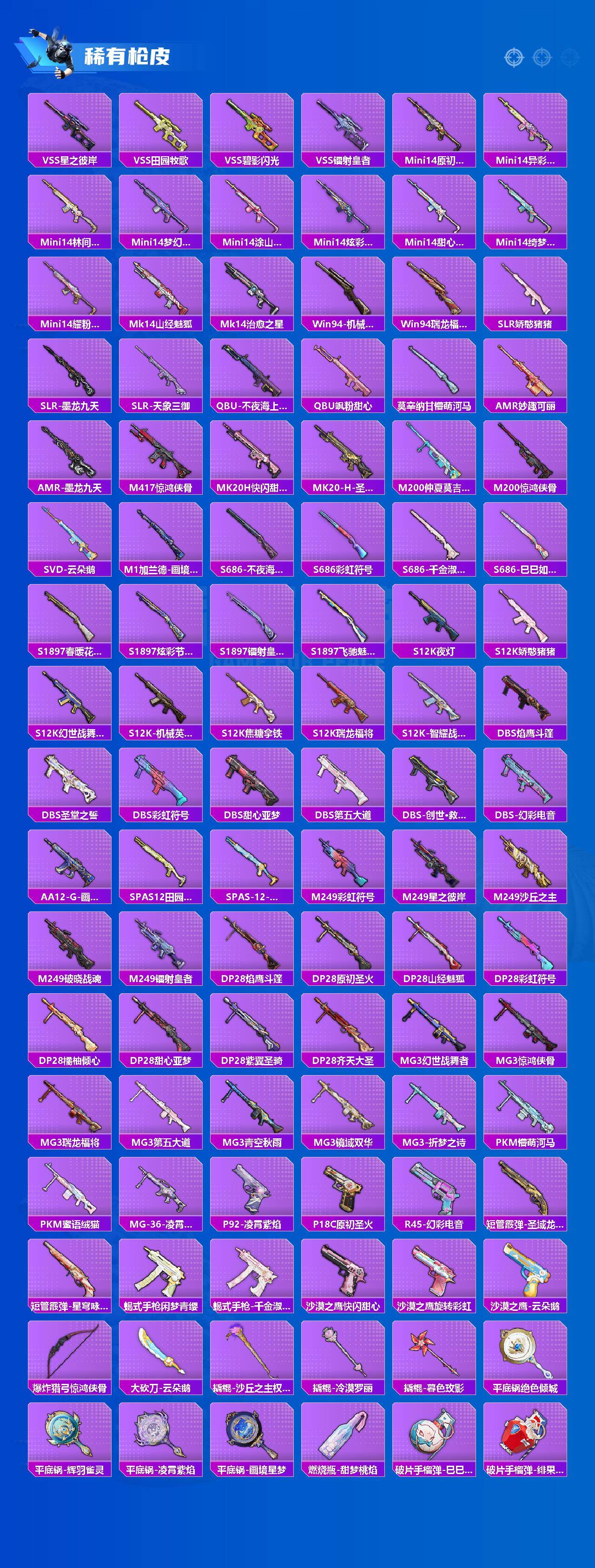 【粉色枪皮】:AKM-暮色玫影,SCAR-L-锦绣绵绵,M416-墨龙九天,AUG-星梦奇缘,Vector-最终圣卫者,P90-沙丘之主,Kar98K-巳巳如意,Kar98K-圣域龙灵,Mk14-甜梦熊击,AMR-智耀战神,M200-梦海之灵,DP-28-豹影疾电,MG3-洛神天依,MG-36-沧焰双生