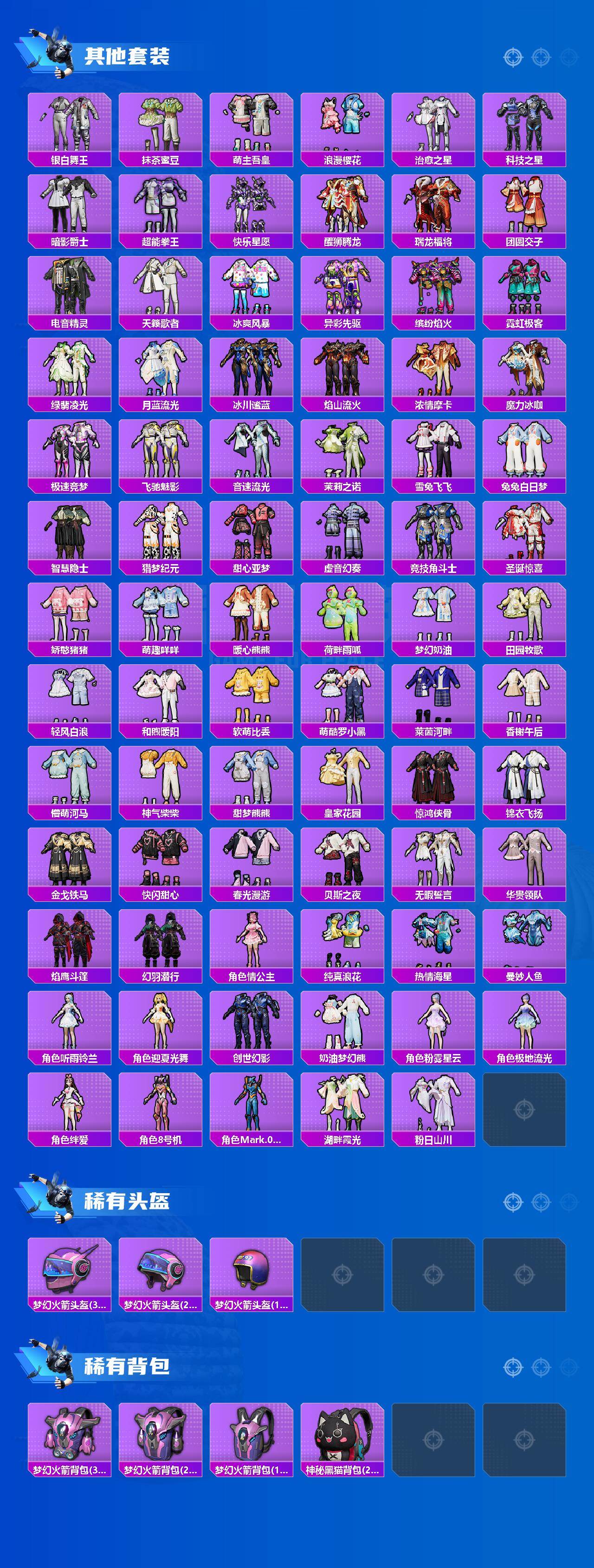 【粉色套装】:粉装-蝶舞迷情,粉装-梦幻火箭,粉装-向日葵,粉装-冰霜白皇,粉装-彩虹鹿灵,粉装-山涧鹿灵,角色-洛天依,粉装-黑伞漫漫,粉装-天之羽翼,粉装-恐龙拽拽,粉装-闪耀律动,粉装-霁雪冰心,粉装-镜光幻境,角色-圣堂之誓,粉装-繁龙极客,粉装-蜜语绒猫,角色-鸢尾晶梦,角色-星梦奇缘,角色-金域紫灵,粉装-金丰海韵,角色-千金淑猫,粉装-星穹咏叹调,粉装-幻彩电音
