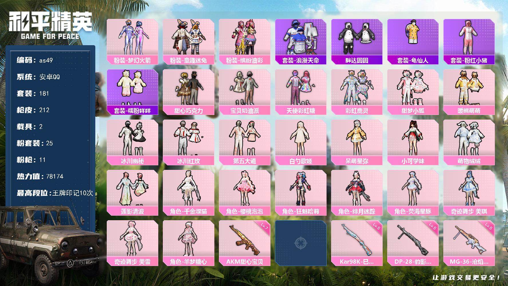 [17082838]安卓 手Q-25粉装-11特效枪-2载具-5粉色飞行器-78174热力值-10王牌印记-181套装-212枪皮