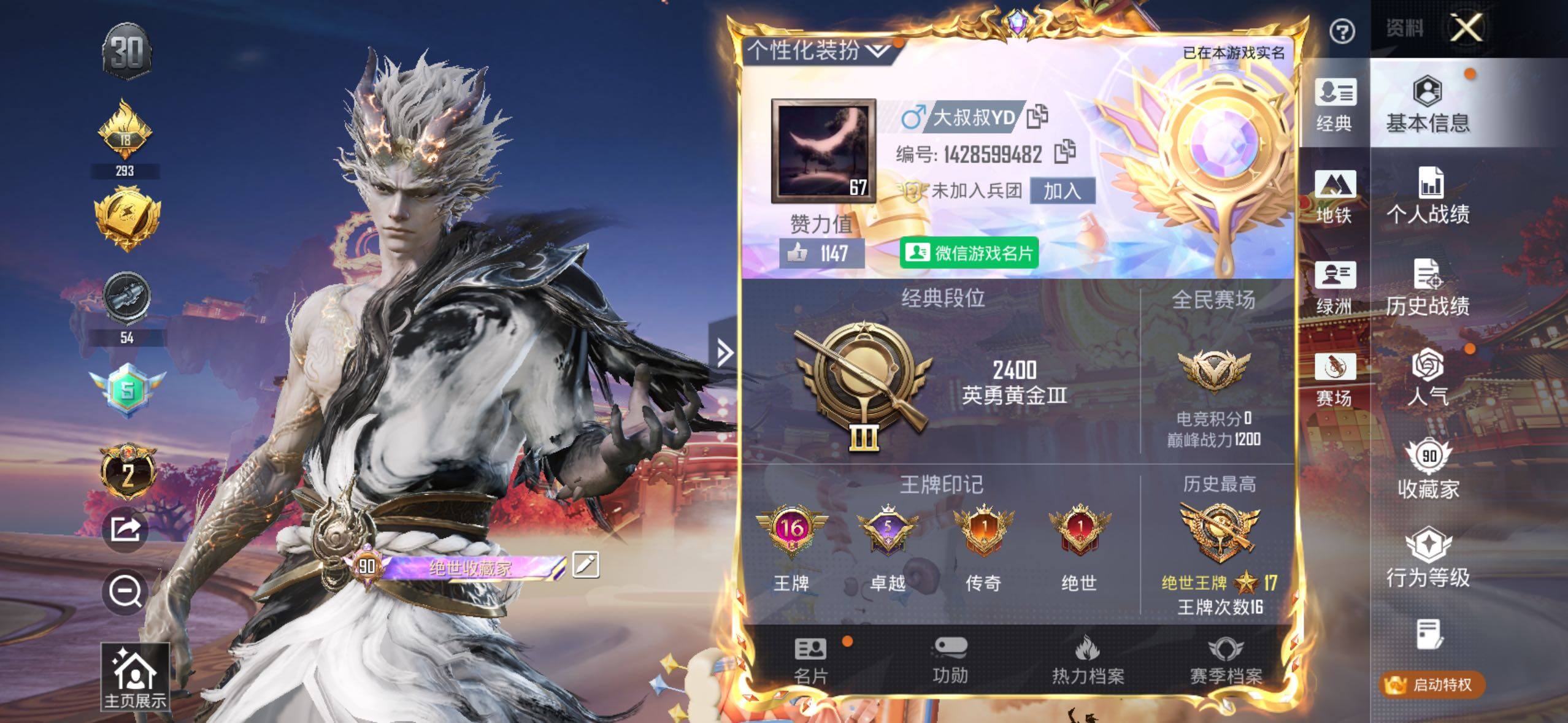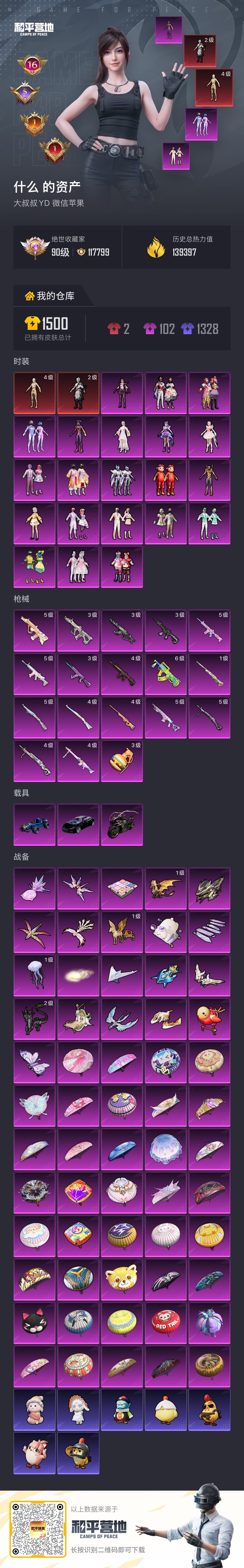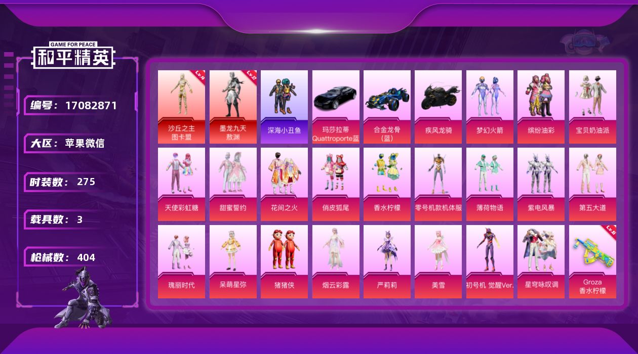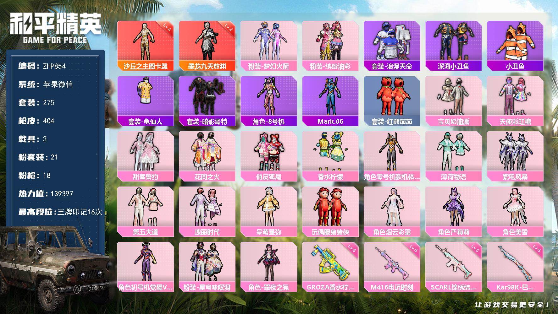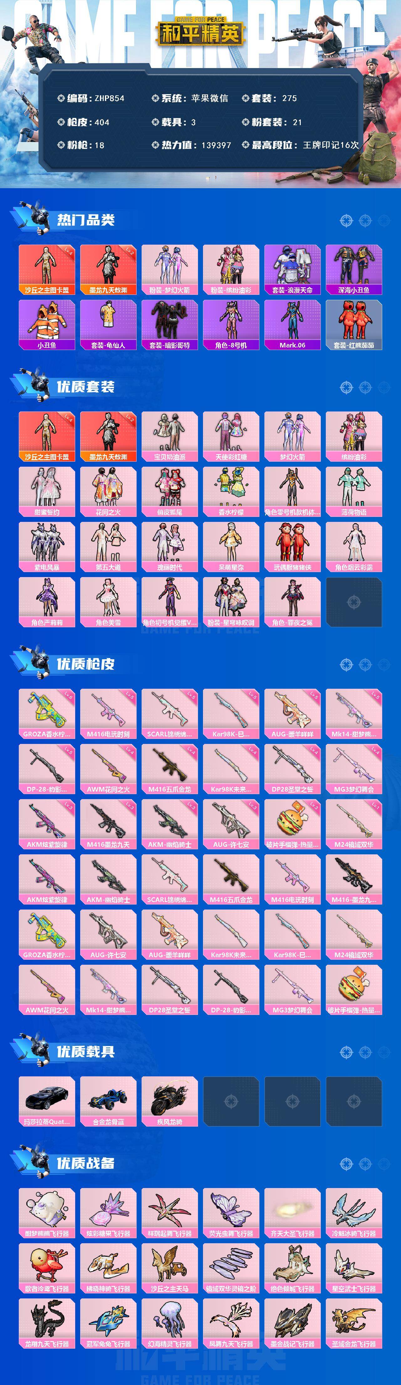 [17082871]苹果 微信-2神装-21粉装-18特效枪-3载具-21粉色飞行器-139397热力值-16王牌印记-275套装-404枪皮