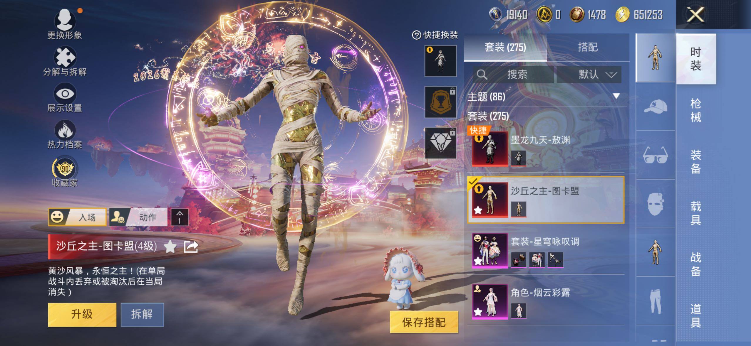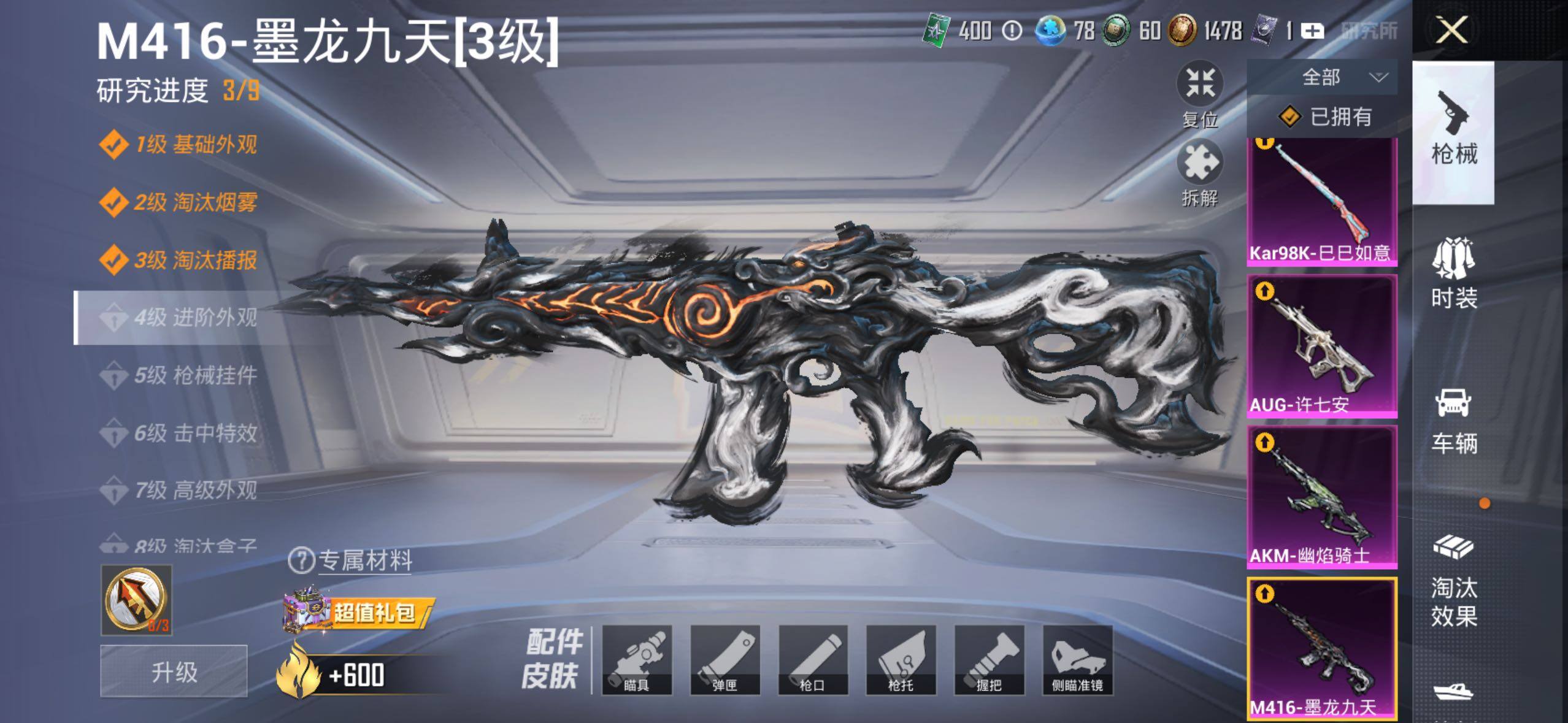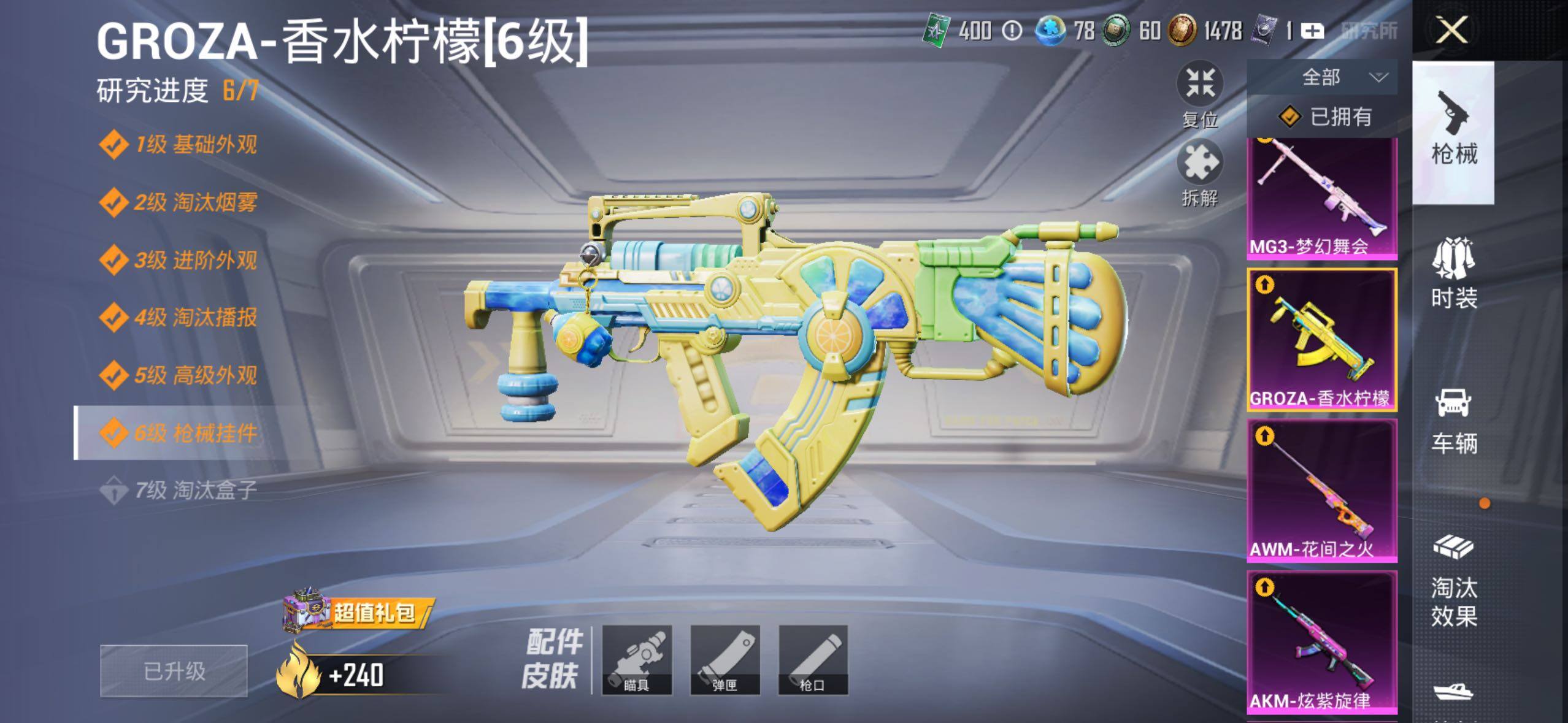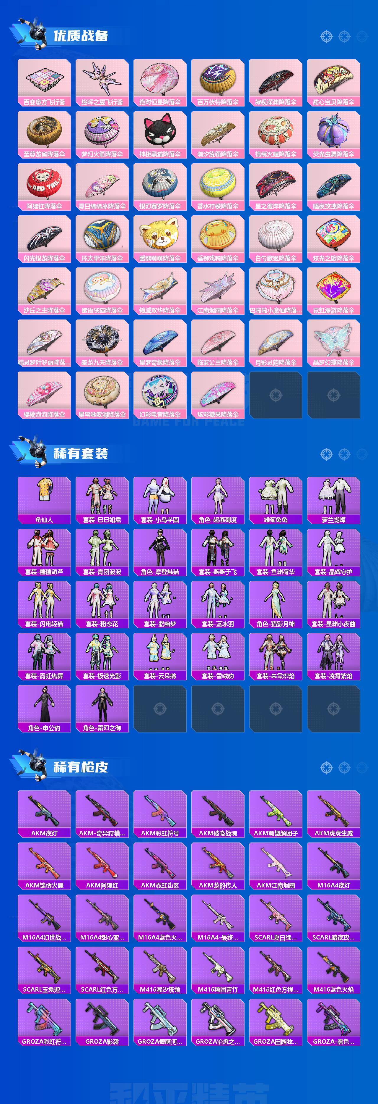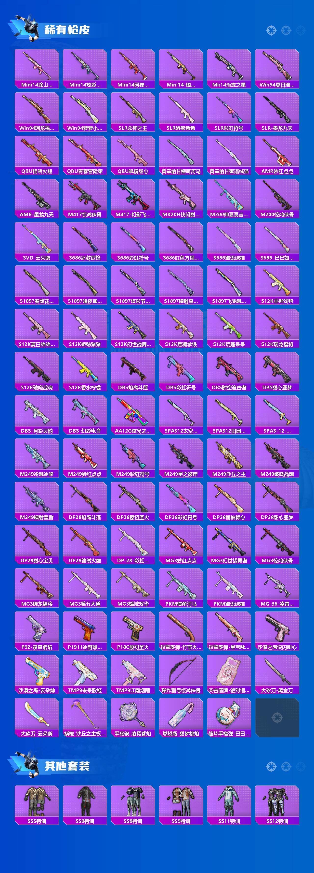 AKM-炫紫旋律,AKM-幽焰骑士,SCAR-L-锦绣绵绵,M416-五爪金龙,M416-电玩时刻,M416-墨龙九天,GROZA-香水柠檬,AUG-许七安,AUG-暖羊咩咩,Kar98K-未来歌姬,Kar98K-巳巳如意,M24-镜域双华,AWM-花间之火,DP-28-圣堂之誓,MG3-梦幻舞会,破片手榴弹-热量炸弹