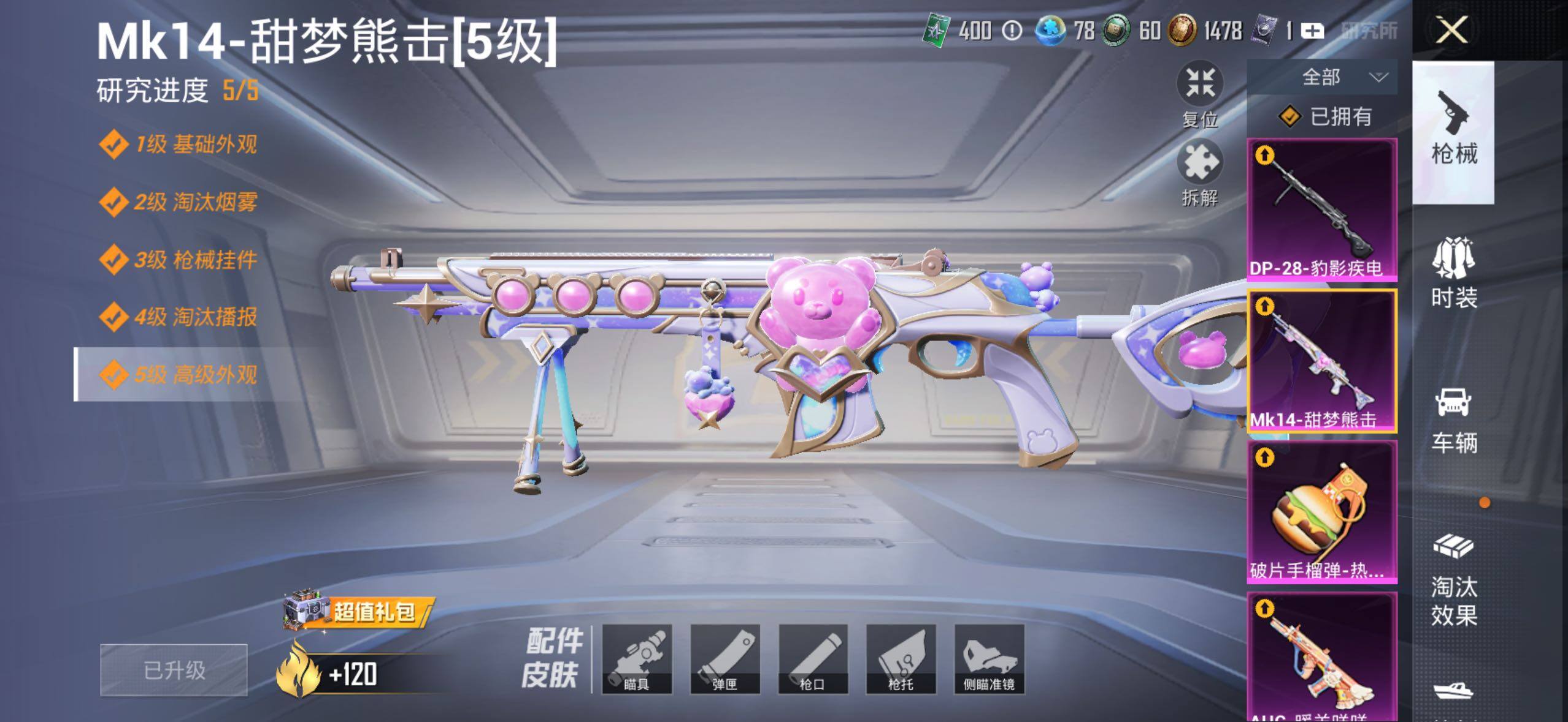 【粉色枪皮等级】:AKM-炫紫旋律(三级),AKM-幽焰骑士(三级),SCAR-L-锦绣绵绵(五级),M416-五爪金龙(四级),M416-电玩时刻(五级),M416-墨龙九天(三级),GROZA-香水柠檬(六级),AUG-许七安(三级),AUG-暖羊咩咩(五级),Kar98K-未来歌姬(四级),Kar98K-巳巳如意(五级),M24-镜域双华(一级),AWM-花间之火(四级),Mk14-甜梦熊击(五级),DP-28-圣堂之誓(四级),DP-28-豹影疾电(五级),MG3-梦幻舞会(四级),破片手榴弹-热量炸弹(三级)