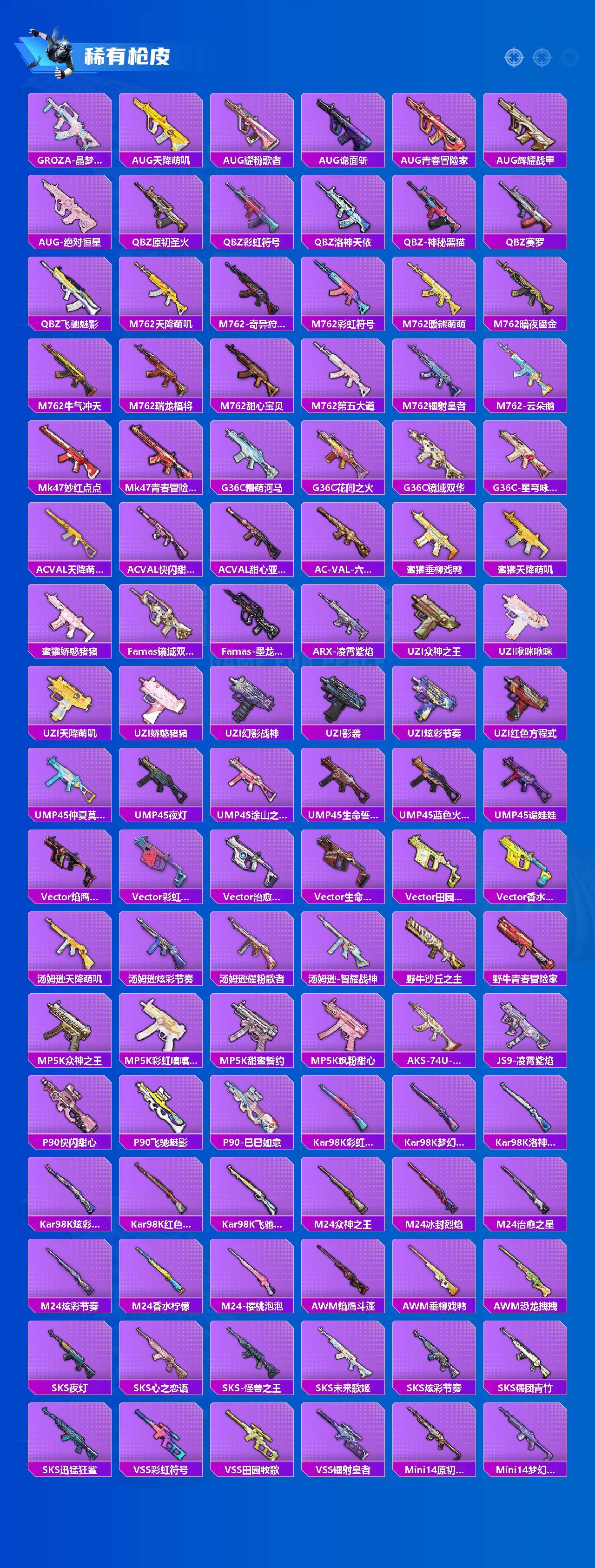 【粉色枪皮】:AKM-炫紫旋律,AKM-幽焰骑士,SCAR-L-锦绣绵绵,M416-五爪金龙,M416-电玩时刻,M416-墨龙九天,GROZA-香水柠檬,AUG-许七安,AUG-暖羊咩咩,Kar98K-未来歌姬,Kar98K-巳巳如意,M24-镜域双华,AWM-花间之火,Mk14-甜梦熊击,DP-28-圣堂之誓,DP-28-豹影疾电,MG3-梦幻舞会,破片手榴弹-热量炸弹