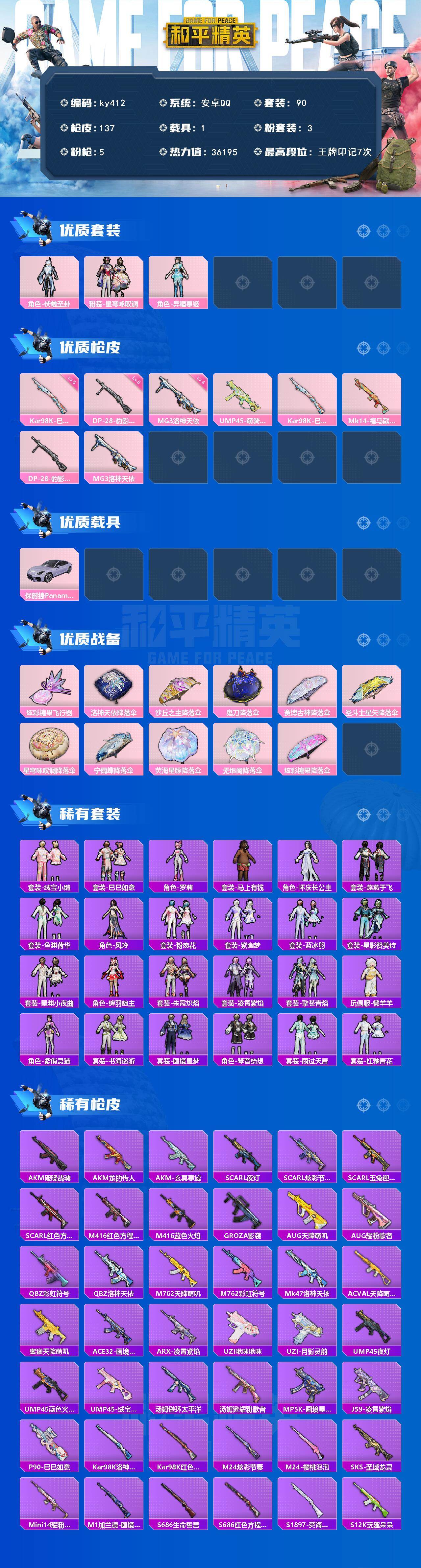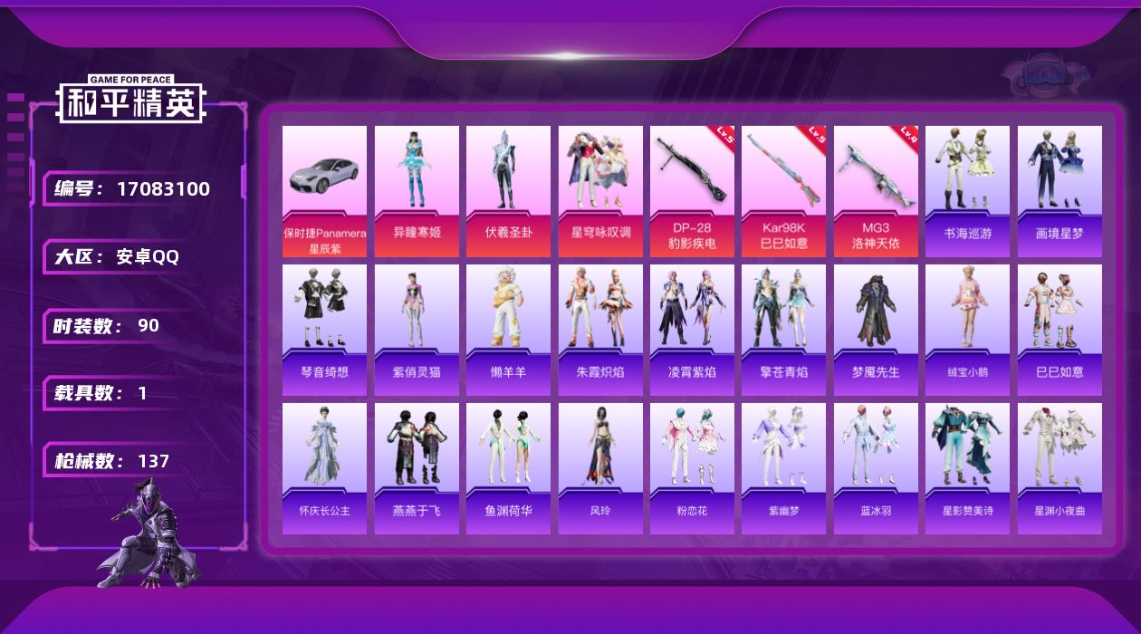[17083100]安卓 手Q-3粉装-5特效枪-1载具-1粉色飞行器-36195热力值-7王牌印记-90套装-137枪皮 【粉色套装】:角色-伏羲圣卦,粉装-星穹咏叹调,角色-异瞳寒姬 【粉色枪皮等级】:Kar98K-巳巳如意(五级),DP-28-豹影疾电(五级),MG3-洛神天依(四级) 【粉色载具】:保时捷Panamera(星辰紫) 【粉色枪皮】:UMP45-萌骑冒险,Kar98K-巳巳如意,Mk14-福马献瑞,DP-28-豹影疾电,MG3-洛神天依 【粉色飞行器】:炫彩糖果飞行器 【粉色降落伞】:洛神天依降落伞,沙丘之主降落伞,鬼刀降落伞,赛博古神降落伞,圣斗士星矢降落伞,星穹咏叹调降落伞,宁雨蝶降落伞,荧海星豚降落伞,无垠阁降落伞,炫彩糖果降落伞 【稀有套装】:套装-绒宝小鹅,套装-巳巳如意,套装-炫彩糖果,角色-罗莉,套装-马上有钱,角色-怀庆长公主,套装-燕燕于飞,套装-鱼渊荷华,角色-风玲,套装-粉恋花,套装-紫幽梦,套装-蓝冰羽,套装-星影赞美诗,套装-星渊小夜曲,角色-绛羽幽主,套装-朱霞炽焰,套装-凌霄紫焰,套装-擎苍青焰,玩偶服-懒羊羊,角色-紫俏灵猫,套装-书海巡游,套装-画境星梦,套装-琴音绮想,套装-雨过天青,套装-红釉青花 【稀有枪皮】:AKM-破晓战魂,AKM-龙的传人,AKM-玄冥寒域,SCAR-L-夜灯,SCAR-L-炫彩节奏,SCAR-L-玉兔迎春,SCAR-L-红色方程式,M416-红色方程式,M416-蓝色火焰,GROZA-影袭,AUG-天降萌叽,AUG-耀粉歌者,QBZ-彩虹符号,QBZ-洛神天依,M762-天降萌叽,M762-彩虹符号,Mk47-洛神天依,AC-VAL-天降萌叽,蜜獾-天降萌叽,ACE32-画境星梦,ARX-凌霄紫焰,UZI-啾咪啾咪,UZI-月影灵韵,UMP45-夜灯,UMP45-蓝色火焰,UMP45-绒宝小鹅,汤姆逊-环太平洋,汤姆逊-耀粉歌者,MP5K-画境星梦,JS9-凌霄紫焰,P90-巳巳如意,Kar98K-洛神天依,Kar98K-红色方程式,M24-炫彩节奏,M24-樱桃泡泡,SKS-圣域龙灵,Mini14-耀粉歌者,M1加兰德-画境星梦,S686-生命誓言,S686-红色方程式,S1897-荧海星豚,S12K-玩趣呆呆,S12K-破晓战魂,S12K-极意拳锋,AA12-G-画境星梦,M249-彩虹符号,M2