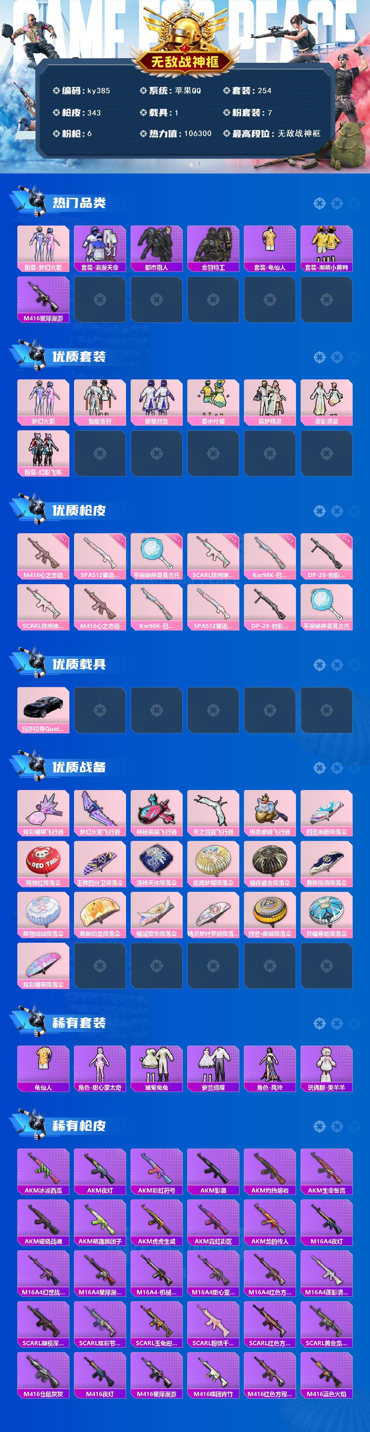 [17083930]苹果 手Q-无敌战神框-7粉装-6特效枪-1载具-5粉色飞行器-106300热力值-22王牌印记-254套装-343枪皮 【热门品类】:粉装-梦幻火箭,套装-浪漫天命,套装-都市猎人,套装-金羽特工,套装-龟仙人,套装-潮萌小黄鸭,M416-星际漫游 【粉色套装】:粉装-梦幻火箭,粉装-智能音符,粉装-新星烈龙,粉装-香水柠檬,粉装-筑梦精灵,粉装-莲影清波,粉装-幻影飞狐 【粉色枪皮等级】:SCAR-L-锦绣绵绵(五级),M416-心之恋语(七级),Kar98K-巳巳如意(五级),SPAS-12-蜜语绒猫(七级),DP-28-豹影疾电(五级),平底锅-仲夏莫吉托(七级) 【粉色载具】:玛莎拉蒂Quattroporte(夜幕蓝) 【粉色枪皮】:SCAR-L-锦绣绵绵,M416-心之恋语,Kar98K-巳巳如意,SPAS-12-蜜语绒猫,DP-28-豹影疾电,平底锅-仲夏莫吉托 【粉色飞行器】:炫彩糖果飞行器,梦幻火箭飞行器,神秘黑猫飞行器,天之羽翼飞行器,极意拳锋飞行器 【粉色降落伞】:四圣焕新降落伞,阿狸红降落伞,王牌四分卫降落伞,洛神天依降落伞,庄周梦蝶降落伞,暗夜鎏金降落伞,黄族统领降落伞,萌物绒绒降落伞,萌酷奶龙降落伞,镜域双华降落伞,精灵梦叶罗丽降落伞,创世·救赎降落伞,异瞳寒姬降落伞,炫彩糖果降落伞 【稀有套装】:套装-龟仙人,角色-甜心蒙太奇,套装-雪国风尚,套装-炫彩糖果,套装-雏菊兔兔,套装-萝兰蝴蝶,角色-风玲,玩偶服-美羊羊 【稀有枪皮】:AUG-冰晶雪宝,AKM-冰凉西瓜,AKM-夜灯,AKM-彩虹符号,AKM-影袭,AKM-灼热熔岩,AKM-生命誓言,AKM-破晓战魂,AKM-萌趣颜团子,AKM-虎虎生威,AKM-霓虹街区,AKM-龙的传人,M16A4-夜灯,M16A4-幻世战舞者,M16A4-星际漫游,M16A4-机械英豪,M16A4-甜心亚梦,M16A4-红色方程式,M16A4-莲影清波,SCAR-L-凝视深渊,SCAR-L-炫彩节奏,SCAR-L-玉兔迎春,SCAR-L-粉锦千层,SCAR-L-红色方程式,SCAR-L-黄金龙骨,M416-仓鼠灰灰,M416-夜灯,M416-星际漫游,M416-糯团青竹,M416-红色方程式,M416-蓝色火焰,GROZA-异彩先驱,GROZA-彩虹符号,GROZA-影袭,GROZA-懵萌河马,GR