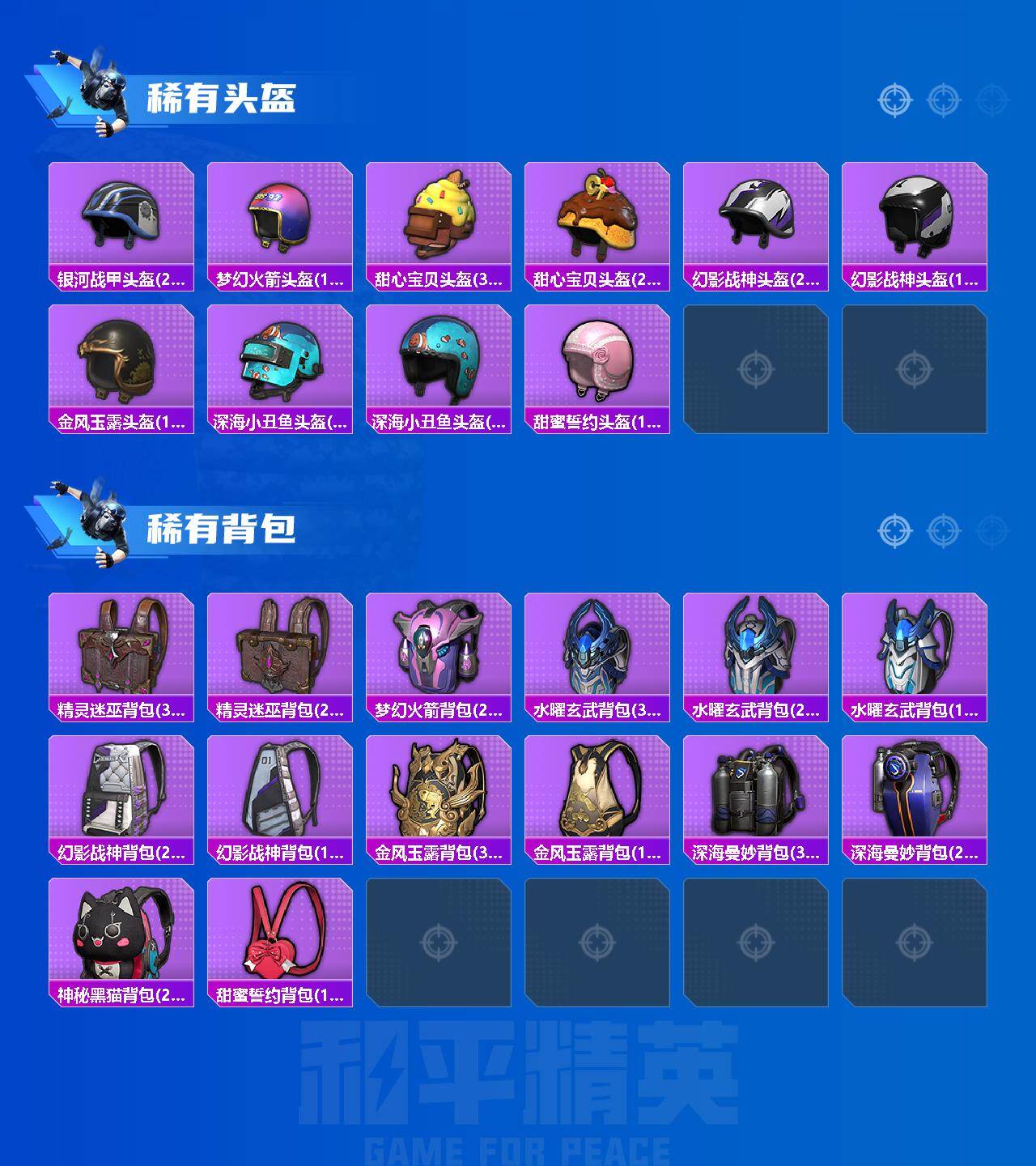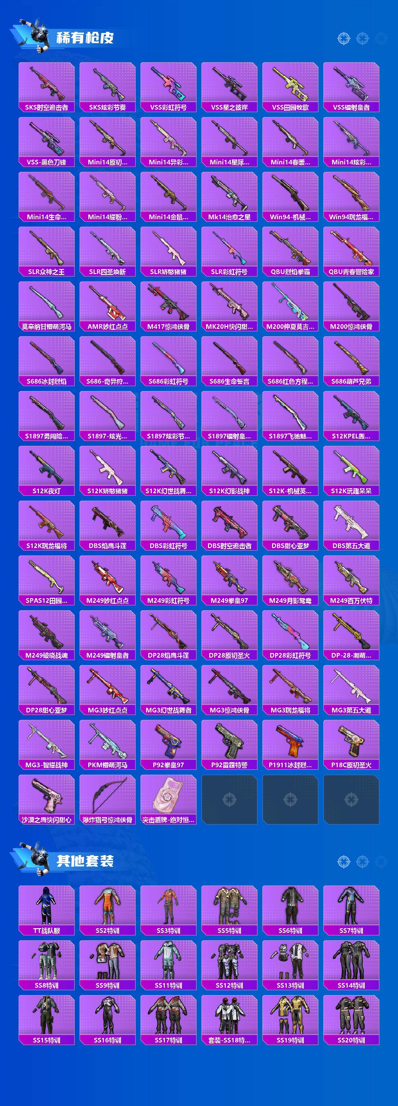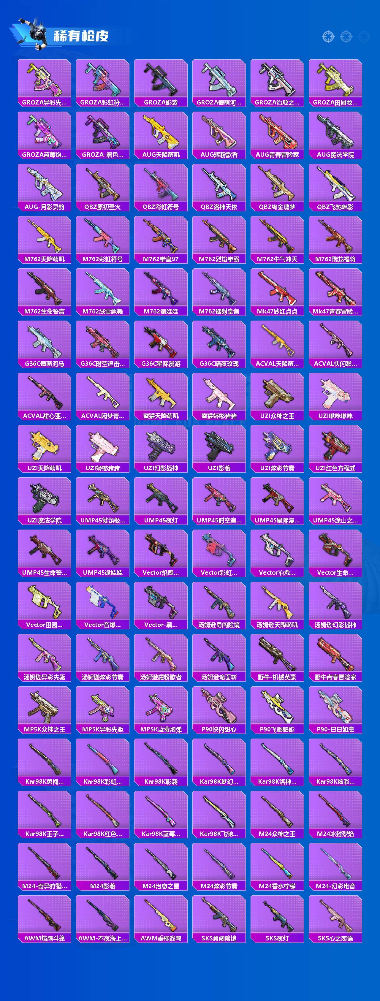 【稀有枪皮】:AUG-冰晶雪宝,AKM-冰凉西瓜,AKM-夜灯,AKM-彩虹符号,AKM-影袭,AKM-灼热熔岩,AKM-生命誓言,AKM-破晓战魂,AKM-萌趣颜团子,AKM-虎虎生威,AKM-霓虹街区,AKM-龙的传人,M16A4-夜灯,M16A4-幻世战舞者,M16A4-星际漫游,M16A4-机械英豪,M16A4-甜心亚梦,M16A4-红色方程式,M16A4-莲影清波,SCAR-L-凝视深渊,SCAR-L-炫彩节奏,SCAR-L-玉兔迎春,SCAR-L-粉锦千层,SCAR-L-红色方程式,SCAR-L-黄金龙骨,M416-仓鼠灰灰,M416-夜灯,M416-星际漫游,M416-糯团青竹,M416-红色方程式,M416-蓝色火焰,GROZA-异彩先驱,GROZA-彩虹符号,GROZA-影袭,GROZA-懵萌河马,GR