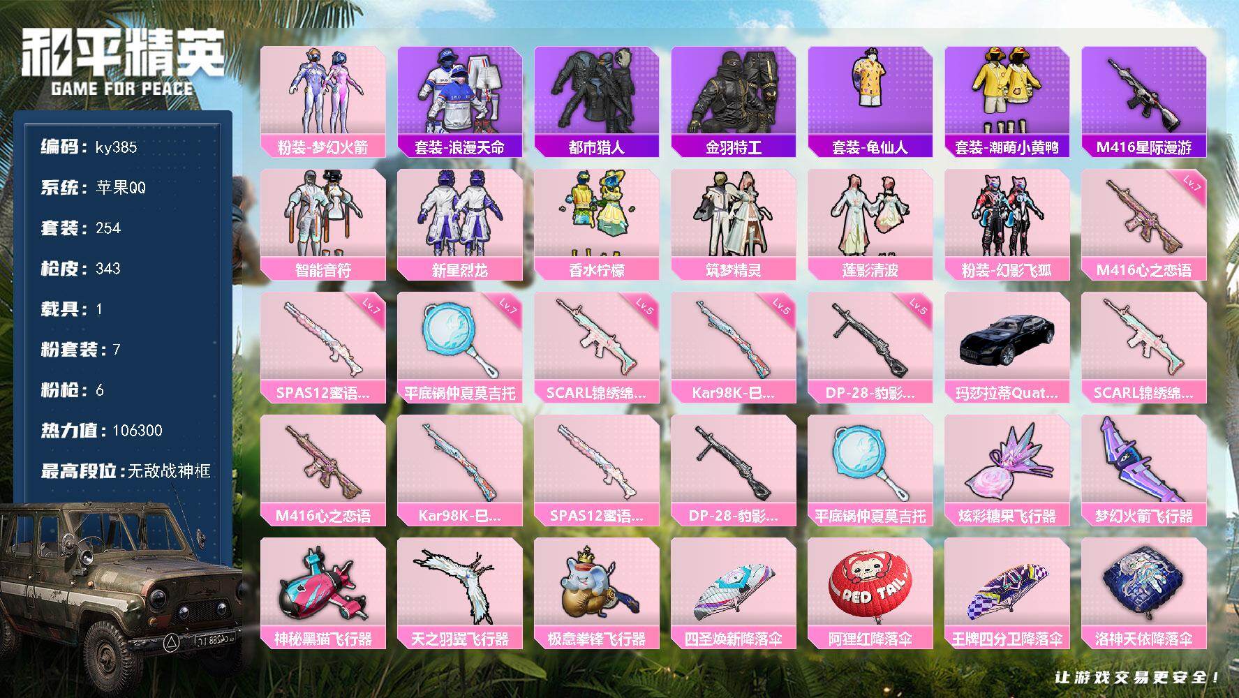 [17083930]苹果 手Q-无敌战神框-7粉装-6特效枪-1载具-5粉色飞行器-106300热力值-22王牌印记-254套装-343枪皮