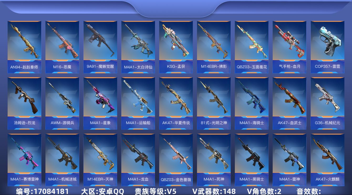 [17084181]专家S-2英雄角色数-146英雄武器数 【热门武器】:KSG-孟获,81式-光明之神,M4A1-星象,AWM-游骑兵*2,COP 357-雷霆 【角色】:葵,零-新生 【英雄武器】:AK47-火麒麟,AK47-血武士,AK47-华夏传说,AK47-木兰*2,AK47-谜城烟火,M4A1-雷神,M4A1-黑骑士,M4A1-死神*2,M4A1-星象,M4A1-龙血,M4A1-机械迷城,M4A1-赛博雷神,M4A1-海骑士,M4A1-运输船,M4A1-太白诗仙,SCAR-探星者,SCAR-心动PICK,AN94-赳赳秦师,FAMAS-湮灭,9A91-天神,9A91-魔蜥觉醒,M14EBR-天神,M14EBR-拂影,M16-恶魔,QBZ03-金色蔷薇,QBZ03-玉面羞花,81式-光明之神,G36-机械纪元,QBZ191-封神榜,AWM-游骑兵*2,AWM-裁决,AWM-指南针觉醒,AWM-指南针,AWM-大湾溢彩,巴雷特-毁灭*2,巴雷特-极光*2,09式狙-天神,QBB95-极光,汤姆逊-烈龙,CZS2-心动次元,PP19野牛-造纸术,地狱火,KSG-孟获,USP-机械迷城,沙鹰-修罗*2,沙鹰-火麒麟,沙鹰-天神,气手枪-血月,沙鹰-宇航兔兔,改装GLOCK-木兰*2,双持GLOCK18-本初,GLOCK18-猎神,COP 357-雷霆,QSZ92-华夏传说,女皇利刃-铁胆虎魄,炽芒蝶刃,匕首-浩瀚征途,血阳,手斧-机械迷城,秋逸,屠龙,尼泊尔-竞界荣光,麒麟刺*3,马来剑-毁灭,唐刀-华夏传说*2,唐刀-大唐荣耀*2,擎天,斩魔刀,破邪蛇棍觉醒,马来剑-耀金伯爵,火麒麟手雷,手雷-竞界荣光*3,雷神手雷,高爆手雷-无限,闪光弹-游骑兵*2,黑骑士闪光弹,火麒麟闪光弹,雷神闪光弹,烟雾弹-游骑兵*2,火麒麟烟雾弹,雷神烟雾弹,烟雾弹-星际宇航,燃烧弹-游骑兵
