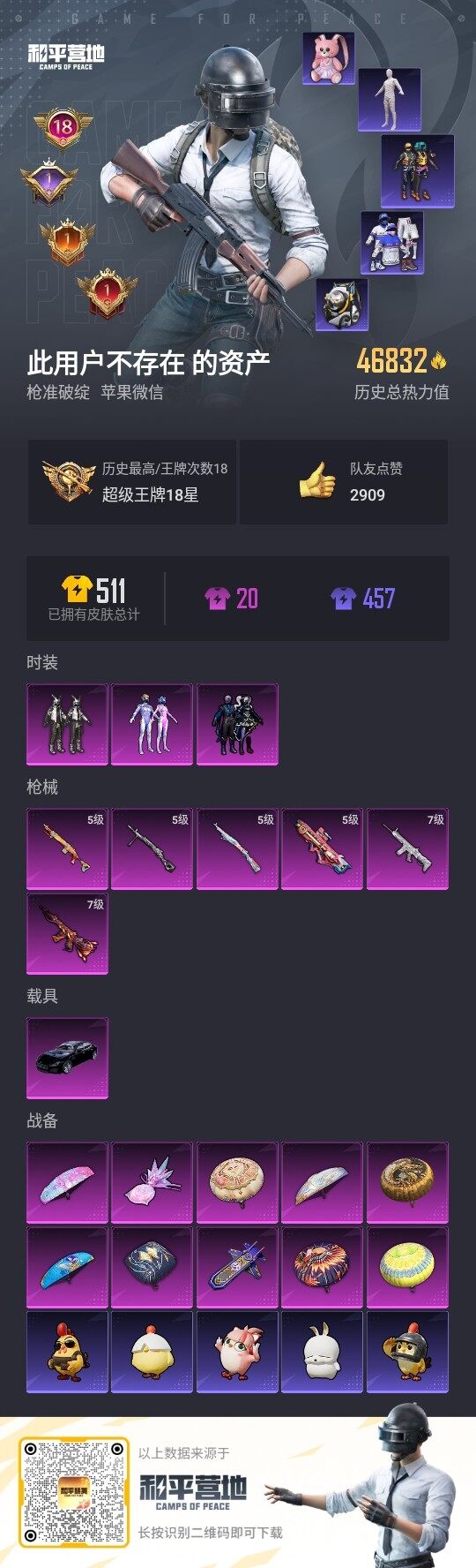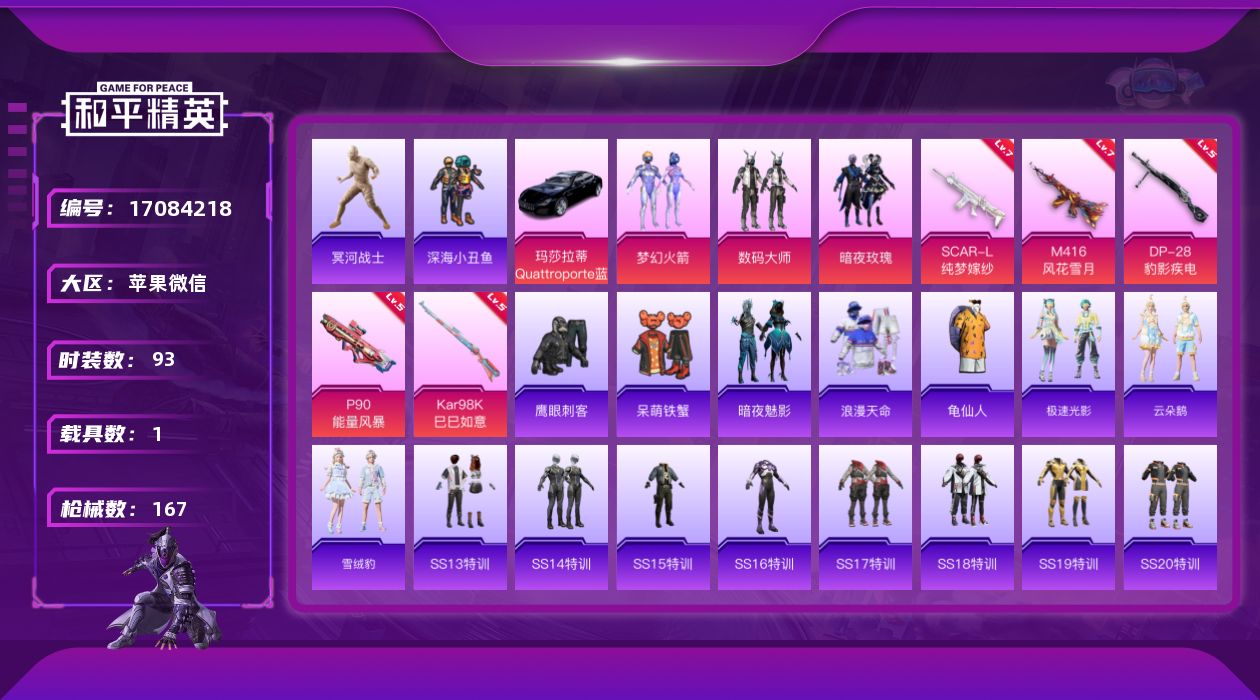 [17084218]苹果 微信-3粉装-6特效枪-1载具-2粉色飞行器-46832热力值-18王牌印记-93套装-167枪皮