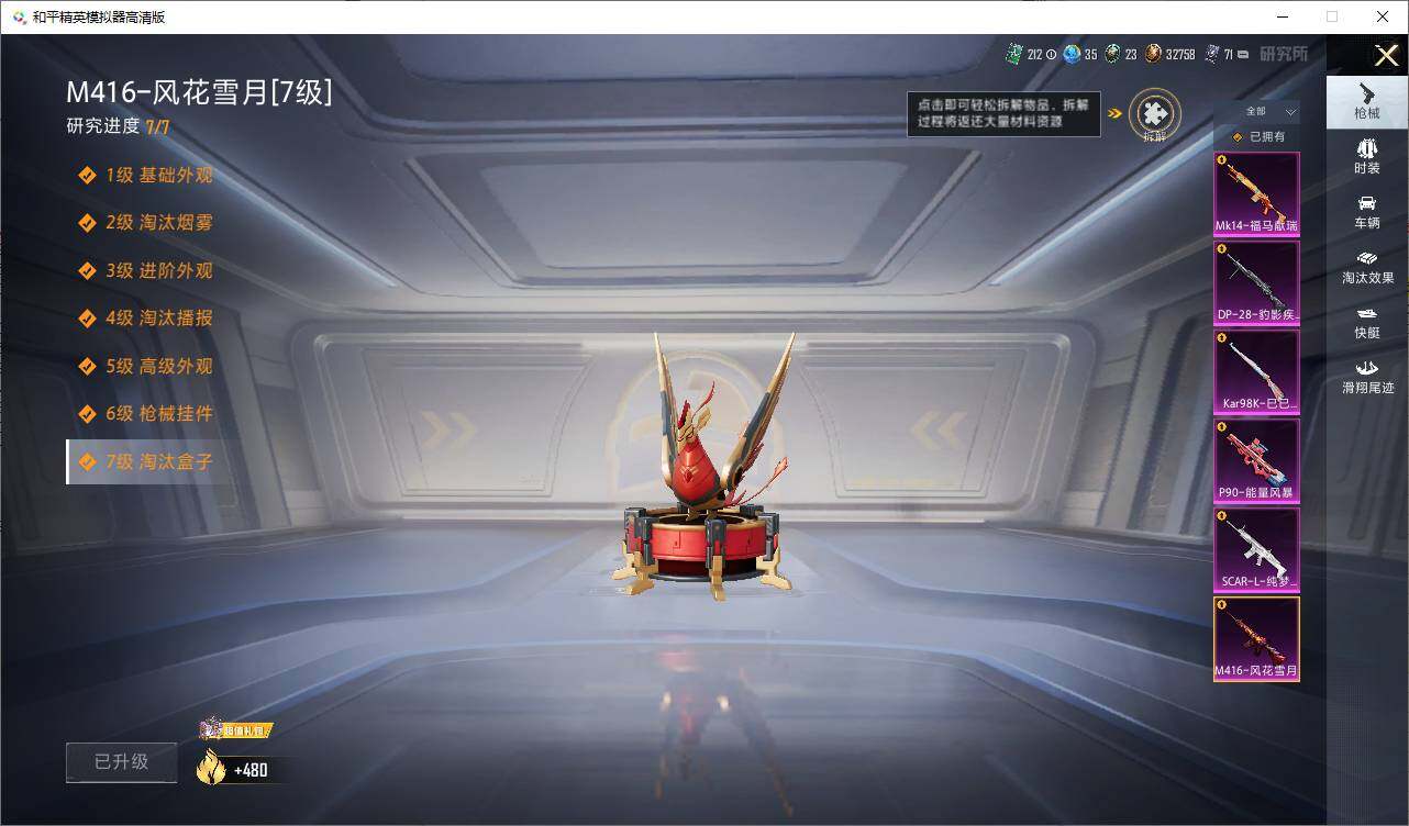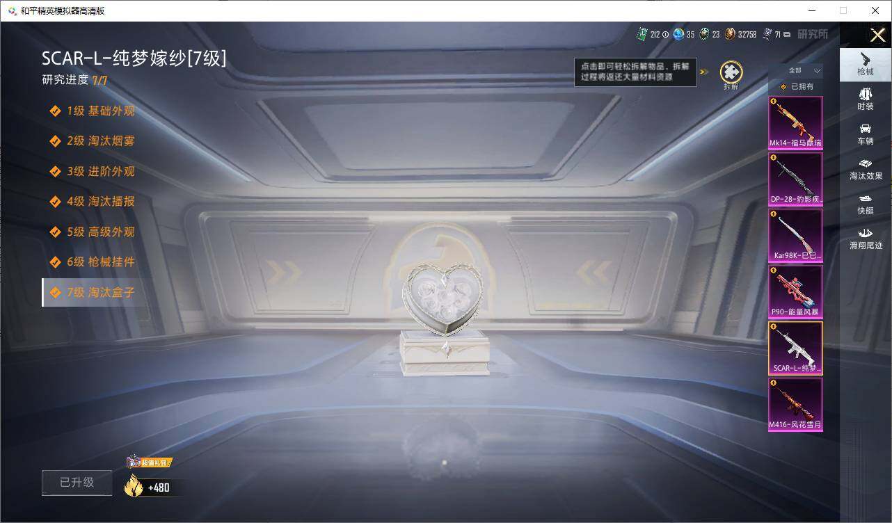 【粉色枪皮等级】:SCAR-L-纯梦嫁纱(七级),M416-风花雪月(七级),P90-能量风暴(五级),Kar98K-巳巳如意(五级),DP-28-豹影疾电(五级)