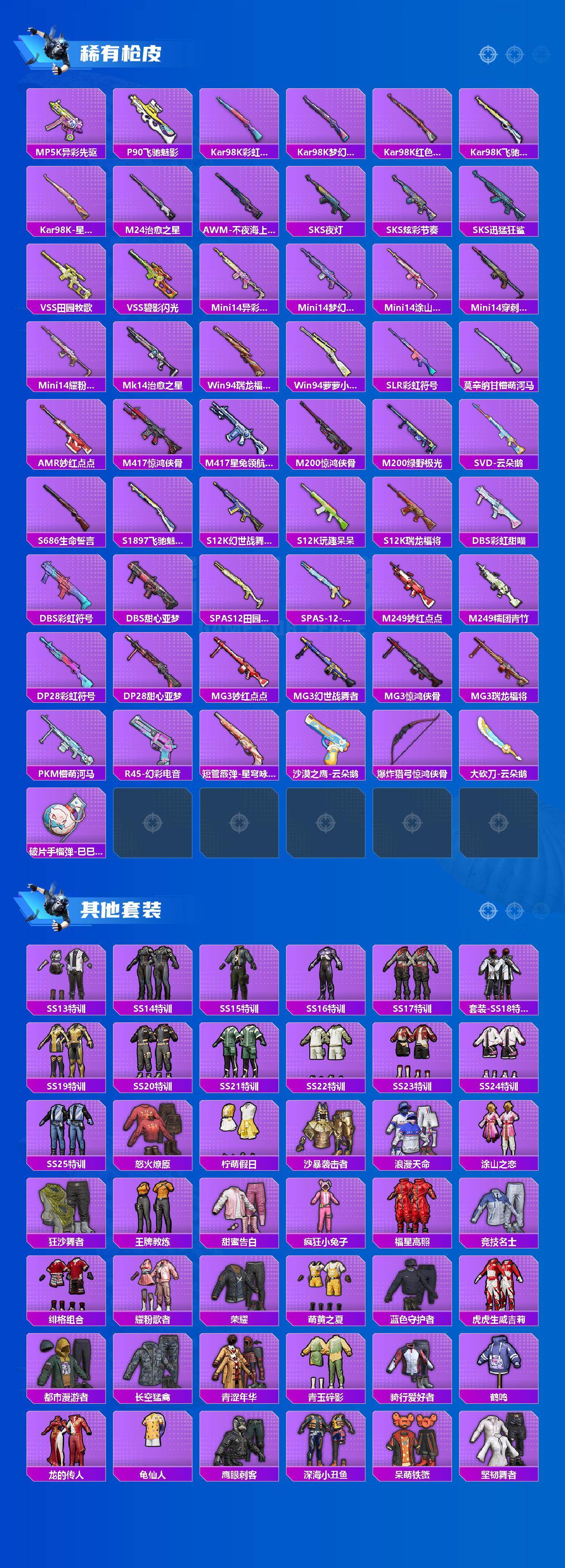 【稀有枪皮】:AUG-冰晶雪宝,AKM-夜灯,AKM-春暖花开,AKM-破晓战魂,AKM-缤纷海域,AKM-虎虎生威,AKM-龙的传人,M16A4-冥河战士,M16A4-甜心亚梦,SCAR-L-炫彩节奏,SCAR-L-玉兔迎春,SCAR-L-甜蜜旋律,SCAR-L-黄金龙骨,M416-滑板小狐,M416-糯团青竹,M416-红色方程式,GROZA-异彩先驱,GROZA-懵萌河马,GROZA-春暖花开,GROZA-治愈之星,GROZA-田园牧歌,GROZA-蓝莓炮弹,AUG-天降萌叽,AUG-耀粉歌者,AUG-青春冒险家,QBZ-银碳小老虎,QBZ-飞驰魅影,M762-天降萌叽,M762-瑞龙福将,M762-第五大道,M762-云朵鹅,M762-幻影飞狐,Mk47-妙红点点,Mk47-洛神天依,Mk47-炫光之旅,G36C-懵萌河马,AC-VAL-天降萌叽,AC-VAL-甜心亚梦,蜜獾-垂柳戏鸭,蜜獾-天降萌叽,UZI-啾咪啾咪,UZI-天降萌叽,UZI-炫彩节奏,UMP45-涂山之恋,UMP45-蓝色火焰,Vector-彩虹符号,Vector-暗夜玫瑰,Vector-治愈之星,Vector-田园牧歌,Vector-音爆索尼克,汤姆逊-天降萌