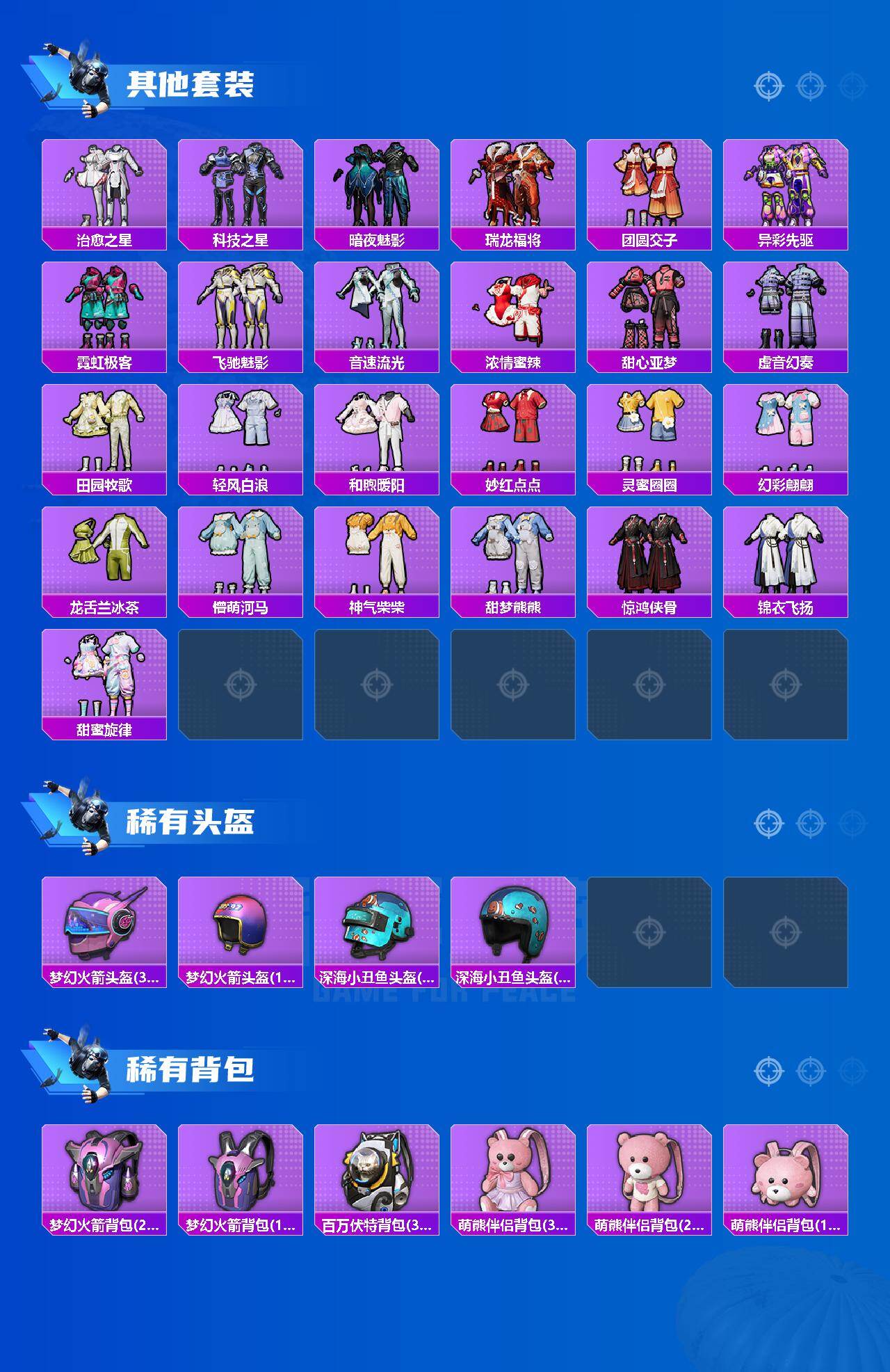 套装-梦幻火箭,套装-冥河战士,套装-深海小丑鱼,套装-数码大师,套装-暗夜玫瑰,套装-鹰眼刺客,套装-呆萌铁蟹