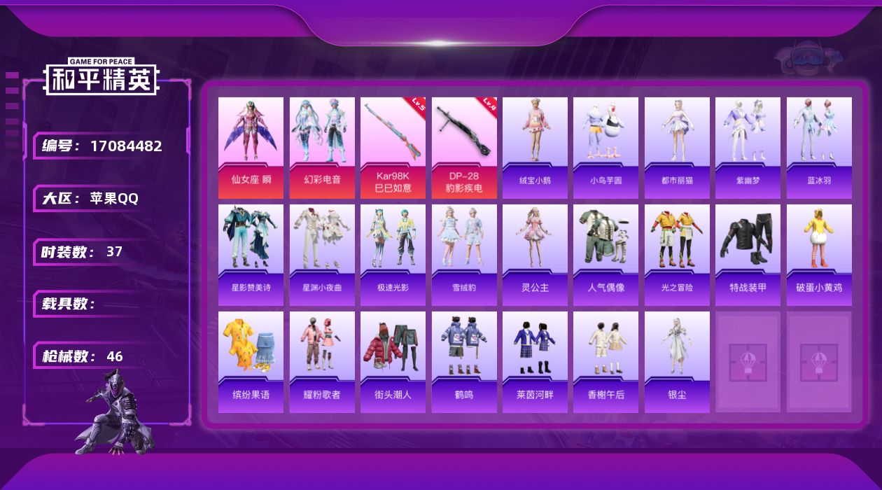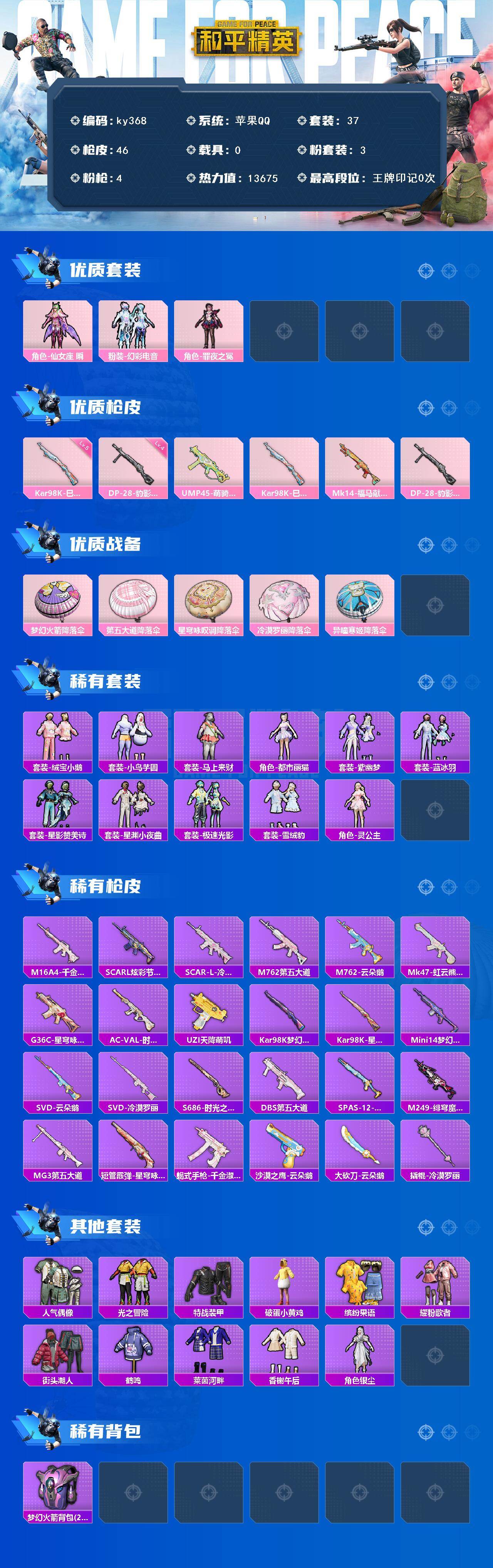 [17084482]苹果 手Q-3粉装-4特效枪-0载具-0粉色飞行器-13675热力值-1王牌印记-37套装-46枪皮 【粉色套装】:角色-仙女座 瞬,粉装-幻彩电音,角色-罪夜之冕 【粉色枪皮等级】:Kar98K-巳巳如意(五级),DP-28-豹影疾电(四级) 【粉色枪皮】:UMP45-萌骑冒险,Kar98K-巳巳如意,Mk14-福马献瑞,DP-28-豹影疾电 【粉色降落伞】:梦幻火箭降落伞,第五大道降落伞,星穹咏叹调降落伞,冷漠罗丽降落伞,异瞳寒姬降落伞 【稀有套装】:套装-绒宝小鹅,套装-小鸟芋圆,套装-马上来财,角色-都市丽猫,套装-紫幽梦,套装-蓝冰羽,套装-星影赞美诗,套装-星渊小夜曲,套装-极速光影,套装-雪绒豹,角色-灵公主 【稀有枪皮】:M16A4-千金淑猫,SCAR-L-炫彩节奏,SCAR-L-冷漠罗丽,M762-第五大道,M762-云朵鹅,Mk47-虹云熊熊,G36C-星穹咏叹调,AC-VAL-时光之吻,UZI-天降萌叽,Kar98K-梦幻火箭,Kar98K-星穹咏叹调,Mini14-梦幻火箭,SVD-云朵鹅,SVD-冷漠罗丽,S686-时光之誓,DBS-第五大道,SPAS-12-云朵鹅,M249-绯穹魔姬,MG3-第五大道,短管霰弹-星穹咏叹调,蝎式手枪-千金淑猫,沙漠之鹰-云朵鹅,大砍刀-云朵鹅,撬棍-冷漠罗丽 【其他套装】:套装-人气偶像,套装-光之冒险,套装-特战装甲,套装-破蛋小黄鸡,套装-缤纷果语,套装-耀粉歌者,套装-街头潮人,套装-鹤鸣,套装-莱茵河畔,套装-香榭午后,角色-银尘 【稀有背包】:梦幻火箭背包(2级) 【营地ID】:996450931