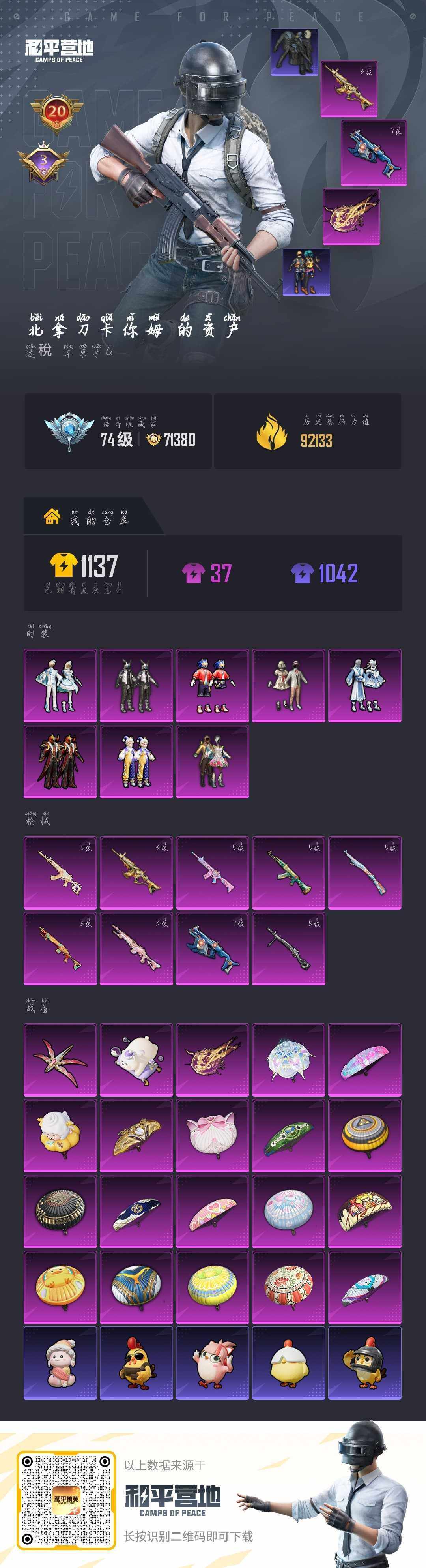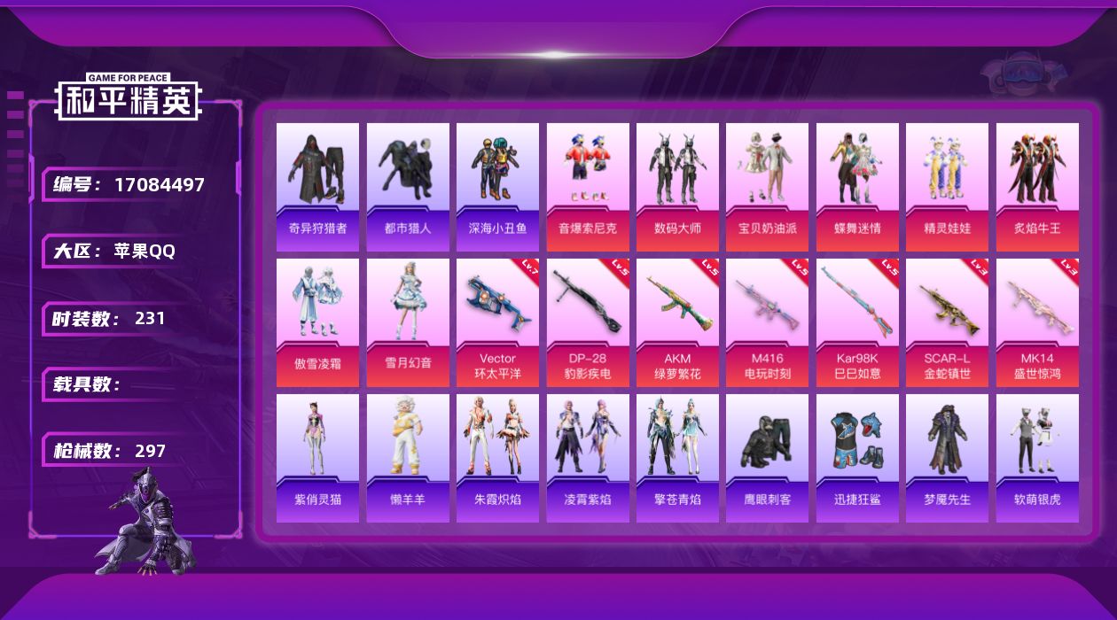 [17084497]苹果 手Q-8粉装-9特效枪-0载具-3粉色飞行器-92133热力值-20王牌印记-231套装-297枪皮