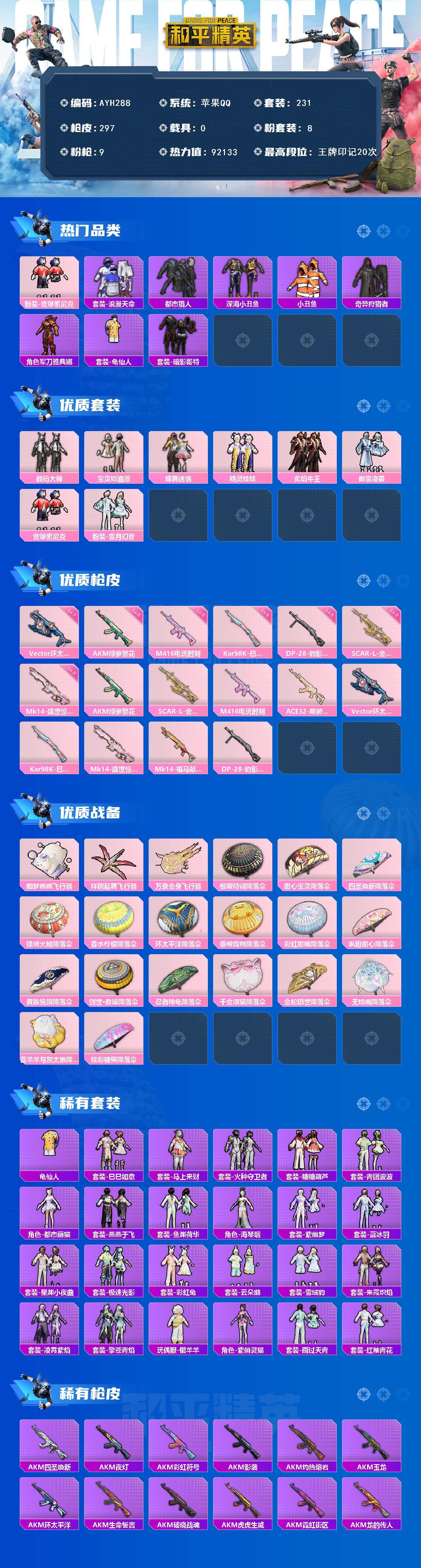 [17084497]苹果 手Q-8粉装-9特效枪-0载具-3粉色飞行器-92133热力值-20王牌印记-231套装-297枪皮 【热门品类】:粉装-音爆索尼克,套装-浪漫天命,套装-都市猎人,套装-深海小丑鱼,套装-小丑鱼,套装-奇异狩猎者,角色-军刀雅典娜,套装-龟仙人,套装-暗影哥特 【粉色套装】:粉装-数码大师,粉装-宝贝奶油派,粉装-蝶舞迷情,粉装-精灵娃娃,粉装-炙焰牛王,粉装-傲雪凌霜,粉装-音爆索尼克,粉装-雪月幻音 【粉色枪皮等级】:AKM-绿萝繁花(五级),SCAR-L-金蛇镇世(三级),M416-电玩时刻(五级),Vector-环太平洋(七级),Kar98K-巳巳如意(五级),Mk14-盛世惊鸿(三级),DP-28-豹影疾电(五级) 【粉色枪皮】:AKM-绿萝繁花,SCAR-L-金蛇镇世,M416-电玩时刻,ACE32-萌骑漫游,Vector-环太平洋,Kar98K-巳巳如意,Mk14-盛世惊鸿,Mk14-福马献瑞,DP-28-豹影疾电 【粉色飞行器】:酣梦熊熊飞行器,祥瑞起舞飞行器,万象金身飞行器 【粉色降落伞】:极限特训降落伞,甜心宝贝降落伞,四圣焕新降落伞,锦绣火鲤降落伞,香水柠檬降落伞,环太平洋降落伞,垂柳戏鸭降落伞,彩虹甜喵降落伞,飒粉甜心降落伞,黄族统领降落伞,创世·救赎降落伞,忍者神龟降落伞,千金淑猫降落伞,金蛇镇世降落伞,无垠阁降落伞,喜羊羊与灰太狼降落伞,炫彩糖果降落伞 【稀有套装】:套装-龟仙人,套装-巳巳如意,套装-马上来财,套装-火种守卫者,套装-糖糖葫芦,套装-青团波波,角色-都市丽猫,套装-燕燕于飞,套装-鱼渊荷华,角色-海琴烟,套装-紫幽梦,套装-蓝冰羽,套装-星渊小夜曲,套装-极速光影,套装-彩虹兔,套装-云朵鹅,套装-雪绒豹,套装-朱霞炽焰,套装-凌霄紫焰,套装-擎苍青焰,玩偶服-懒羊羊,角色-紫俏灵猫,套装-雨过天青,套装-红釉青花 【稀有枪皮】:AKM-四圣焕新,AKM-夜灯,AKM-彩虹符号,AKM-影袭,AKM-灼热熔岩,AKM-玉龙,AKM-环太平洋,AKM-生命誓言,AKM-破晓战魂,AKM-虎虎生威,AKM-霓虹街区,AKM-龙的传人,M16A4-幻世战舞者,M16A4-甜心亚梦,M16A4-红色方程式,M16A4-蓝色火焰,SCAR-L-夜灯,SCAR-L-炫彩节奏,SCAR-L-玉兔迎春,SCAR-L-红色方程式