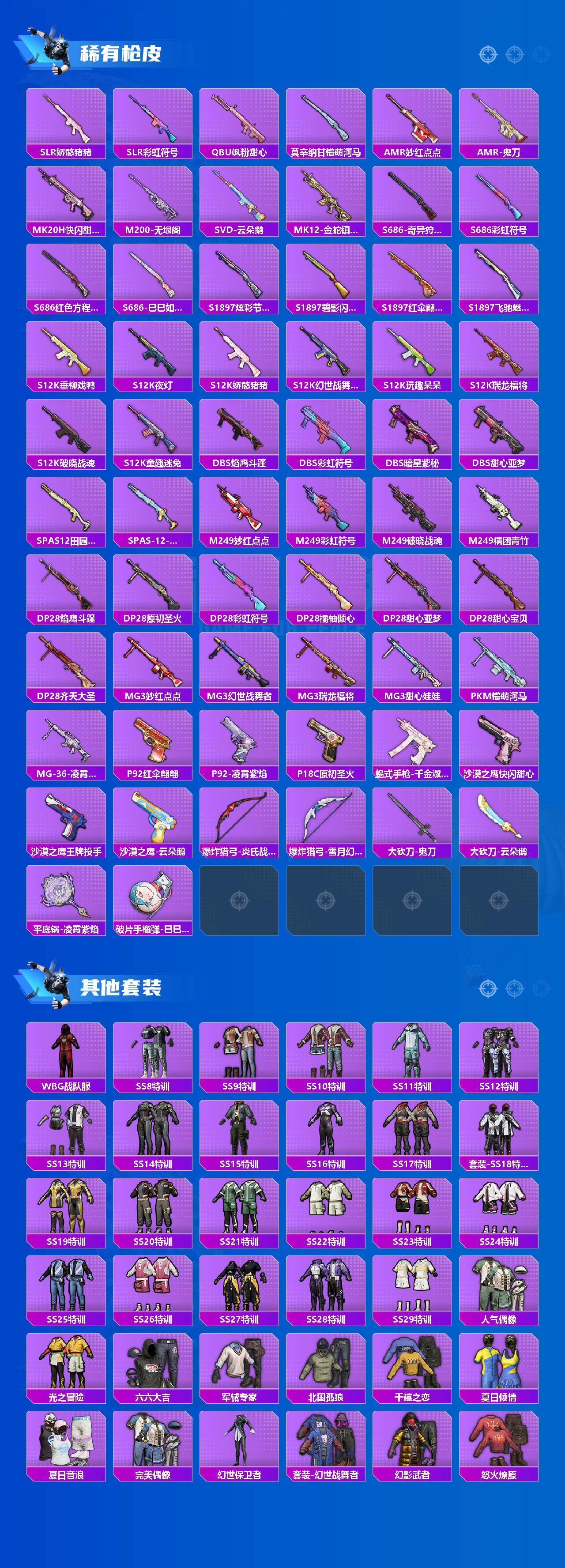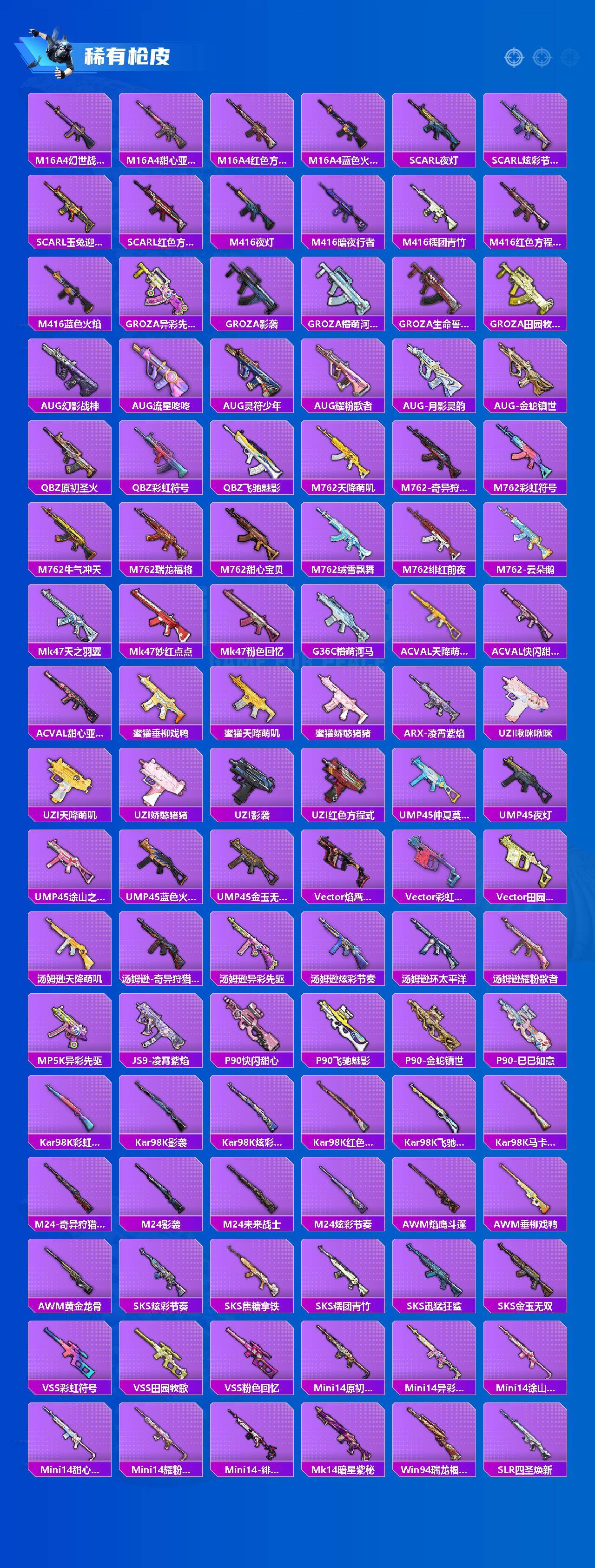 【稀有枪皮】:AKM-四圣焕新,AKM-夜灯,AKM-彩虹符号,AKM-影袭,AKM-灼热熔岩,AKM-玉龙,AKM-环太平洋,AKM-生命誓言,AKM-破晓战魂,AKM-虎虎生威,AKM-霓虹街区,AKM-龙的传人,M16A4-幻世战舞者,M16A4-甜心亚梦,M16A4-红色方程式,M16A4-蓝色火焰,SCAR-L-夜灯,SCAR-L-炫彩节奏,SCAR-L-玉兔迎春,SCAR-L-红色方程式