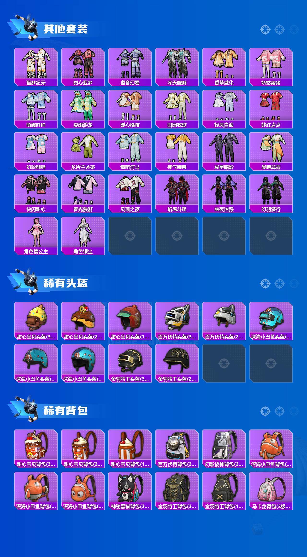 套装-音爆索尼克,套装-都市猎人,套装-深海小丑鱼,套装-奇异狩猎者,套装-数码大师,套装-宝贝奶油派,套装-蝶舞迷情,套装-精灵娃娃,套装-炙焰牛王,套装-傲雪凌霜,套装-雪月幻音,套装-鹰眼刺客,套装-迅捷狂鲨,套装-梦魇先生,套装-软萌银虎
