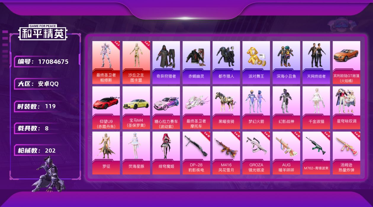 - [17226558]安卓 手Q-8粉装-5特效枪-1载具-3粉色飞行器-57699热力值-6王牌印记-137套装-173枪皮 【热门品类】:套装-忍者信条,套装-动感兔斯基人偶服 【粉色套装】:粉装-赤焰黑爵,粉装-炙焰牛王,粉装-霞光圣骑,粉装-寒光使者,角色-阿尔茜,角色-茉莉星,角色-圣堂之誓,角色-绯穹魔姬 【粉色枪皮等级】:M416-五爪金龙(六级),Vector-灵感创作师(七级),AKS-74U-森灵之息(三级),Kar98K-巳巳如意(三级),DP-28-豹影疾电(三级) 【粉色载具】:玛莎拉蒂Ghibli(粉) 【粉色枪皮】:M416-五爪金龙,Vector-灵感创作师,AKS-74U-森灵之息,Kar98K-巳巳如意,DP-28-豹影疾电 【粉色飞行器】:星夜魔法师飞行翼,沙丘之主天马 【粉色降落伞】:橘柚倾心降落伞,冷魅冰骑降落伞,沙丘之主降落伞,猪猪侠降落伞,绯穹魔姬降落伞,炫彩糖果降落伞 【稀有套装】:套装-炫彩糖果,套装-彩虹兔,套装-云朵鹅,套装-雪绒豹,套装-蓝海鲸歌,角色-绛羽幽主,套装-朱霞炽焰,套装-凌霄紫焰,角色-绯色魅影 【稀有枪皮】:AUG-冰晶雪宝,AKM-彩虹符号,AKM-影袭,AKM-春暖花开,AKM-灼热熔岩,AKM-王牌投手,AKM-破晓战魂,AKM-虎虎生威,AKM-霓虹街区,AKM-龙的传人,M16A4-凝视深渊,M16A4-幻世战舞者,M16A4-甜心亚梦,SCAR-L-暗夜玫瑰,SCAR-L-炫彩节奏,SCAR-L-红色方程式,SCAR-L-银河战甲,SCAR-L-青丘仙客,SCAR-L-冷漠罗丽,M416-月影鸳鸯,M416-神秘黑猫,M416-红色方程式,M416-蓝色火焰,GROZA-2B战斗服款,GROZA-异彩先驱,GROZA-影袭,GROZA-懵萌河马,GROZA-黑色刀锋,AUG-2P战斗服款,AUG-天降萌叽,AUG-灵符少年,QBZ-彩虹符号,QBZ-未来歌姬,QBZ-飞驰魅影,M762-拳皇97,M762-橘柚倾心,M762-瑞龙福将,M762-云朵鹅,G36C-冷魅冰骑,G36C-懵萌河马,G36C-青丘仙客,AC-VAL-天降萌叽,AC-VAL-甜心亚梦,蜜獾-绯穹魔姬,ARX-凌霄紫焰,UZI-天降萌叽,UZI-幻影战神,UZI-影袭,UMP45-炫光之旅,UMP45-猪猪侠,UMP45-生命誓言