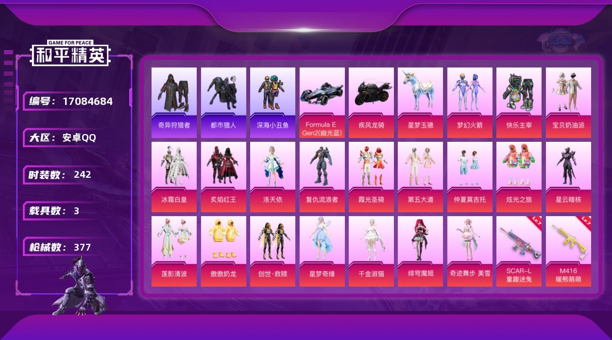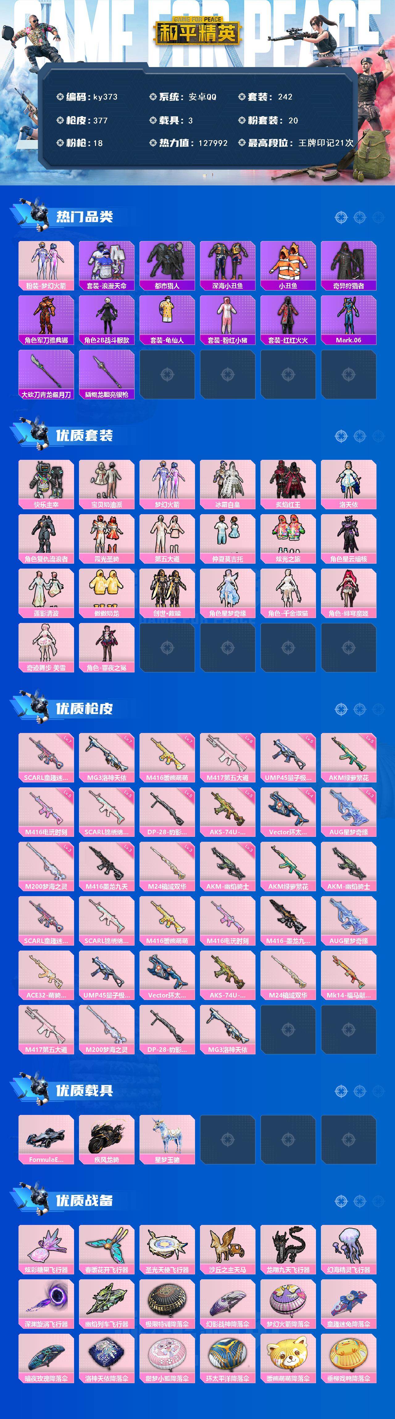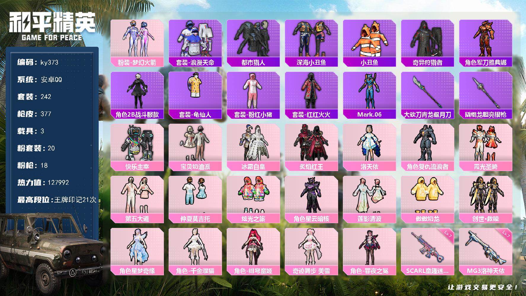[17084684]安卓 手Q-20粉装-18特效枪-3载具-9粉色飞行器-127992热力值-21王牌印记-242套装-377枪皮