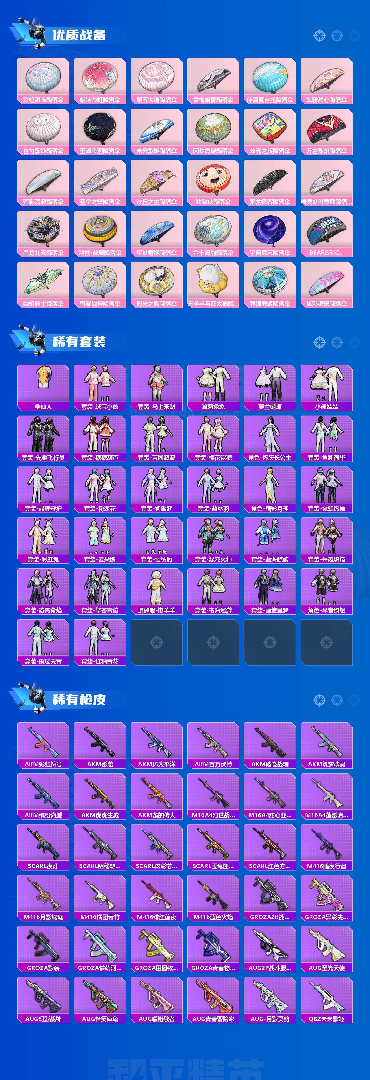 [17084684]安卓 手Q-20粉装-18特效枪-3载具-9粉色飞行器-127992热力值-21王牌印记-242套装-377枪皮 【热门品类】:粉装-梦幻火箭,套装-浪漫天命,套装-都市猎人,套装-深海小丑鱼,套装-小丑鱼,套装-奇异狩猎者,角色-军刀雅典娜,角色-2B战斗服款,套装-龟仙人,套装-粉红小猪,套装-红红火火,角色-Mark.06,大砍刀-青龙偃月刀,撬棍-龙胆亮银枪 【粉色套装】:粉装-快乐主宰,粉装-宝贝奶油派,粉装-梦幻火箭,粉装-冰霜白皇,粉装-炙焰红王,角色-洛天依,角色-复仇流浪者,粉装-霞光圣骑,粉装-第五大道,粉装-仲夏莫吉托,粉装-炫光之旅,角色-星云暗核,粉装-莲影清波,粉装-傲傲奶龙,套装-创世·救赎,角色-星梦奇缘,角色-千金淑猫,角色-绯穹魔姬,角色-奇迹舞步 美雪,角色-罪夜之冕 【粉色枪皮等级】:AKM-绿萝繁花(五级),AKM-幽焰骑士(三级),SCAR-L-童趣迷兔(七级),SCAR-L-锦绣绵绵(五级),M416-暖熊萌萌(七级),M416-电玩时刻(五级),M416-墨龙九天(三级),AUG-星梦奇缘(三级),UMP45-量子极限(五级),Vector-环太平洋(四级),AKS-74U-森灵之息(五级),M24-镜域双华(三级),M417-第五大道(六级),M200-梦海之灵(三级),DP-28-豹影疾电(五级),MG3-洛神天依(七级) 【粉色载具】:Formula E Gen2(幽光蓝),疾风龙骑,星梦玉骢 【粉色枪皮】:AKM-绿萝繁花,AKM-幽焰骑士,SCAR-L-童趣迷兔,SCAR-L-锦绣绵绵,M416-暖熊萌萌,M416-电玩时刻,M416-墨龙九天,AUG-星梦奇缘,ACE32-萌骑漫游,UMP45-量子极限,Vector-环太平洋,AKS-74U-森灵之息,M24-镜域双华,Mk14-福马献瑞,M417-第五大道,M200-梦海之灵,DP-28-豹影疾电,MG3-洛神天依 【粉色飞行器】:炫彩糖果飞行器,春暖花开飞行器,圣光天使飞行器,沙丘之主天马,龙翔九天飞行器,幻海精灵飞行器,深渊漩涡飞行器,幽焰列车飞行器 【粉色降落伞】:极限特训降落伞,幻影战神降落伞,梦幻火箭降落伞,童趣迷兔降落伞,暗夜玫瑰降落伞,洛神天依降落伞,甜梦小狐降落伞,环太平洋降落伞,暖熊萌萌降落伞,垂柳戏鸭降落伞,彩虹甜喵降落伞,旋转彩虹
