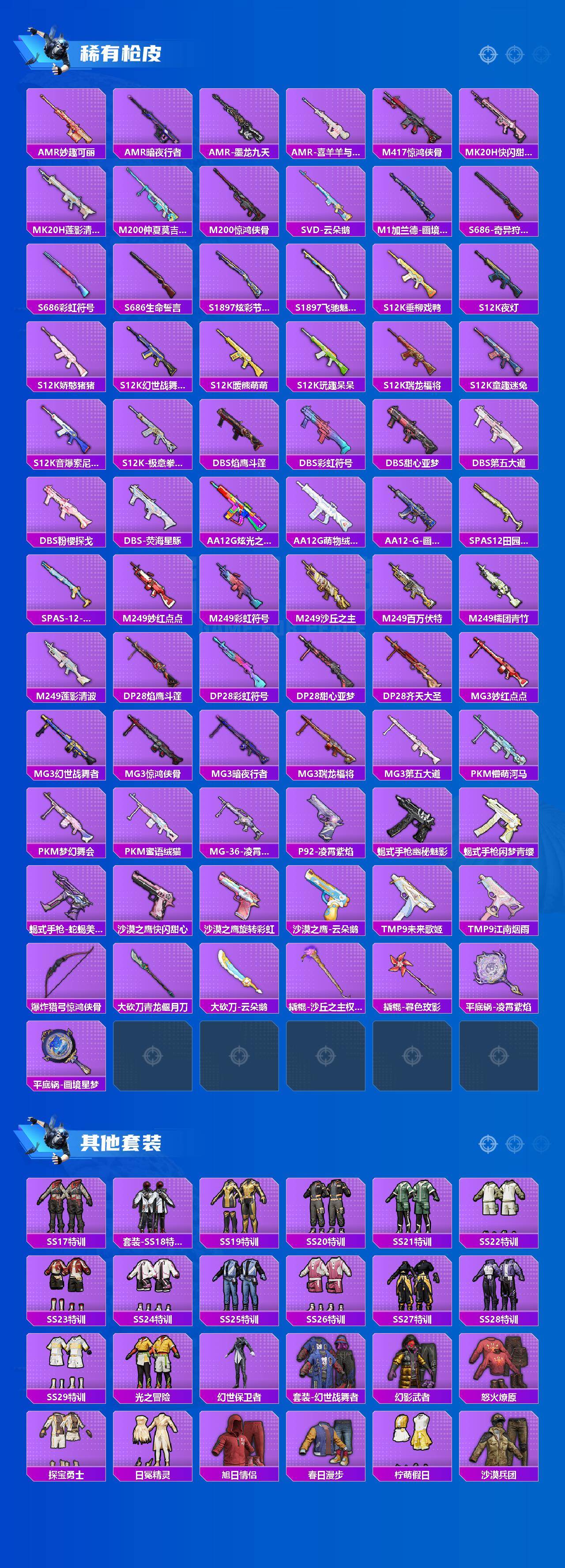 - [14259621]76351k哈伏币-168m流动资产-60烽火等级-青铜-17战场等级-列兵 【干员外观】:红狼-蚀金玫瑰,骇爪-维什戴尔,深蓝-不破誓约,红狼-电锯惊魂 【近战皮肤】:近战-信条,近战-黑鹰 【典藏外观】:K416突击步枪-暗鸦*2,AKM突击步枪-青纹,As Val突击步枪-星之彩,PTR-32突击步枪-黑潮*2,野牛冲锋枪-黑潮,AK-12突击步枪-极地勘察队 【传说级普通外观】:M4A1突击步枪-蚀金玫瑰,M4A1突击步枪-阿米娅,ASh-12战斗步枪-鹅鸭杀,SG552突击步枪-运动员,SCAR-H战斗步枪-水墨云图,SCAR-H战斗步枪-启航,G3战斗步枪-骑士,CAR-15突击步枪-阿米娅,KC17突击步枪-电锯惊魂,P90冲锋枪-信条,QCQ171冲锋枪-鹅鸭杀,M250通用机枪-骑士之心,QJB201轻机枪-鹅鸭杀,SR-25射手步枪-信条,R93狙击步枪-维什戴尔 【史诗级普通外观】:ASh-12战斗步枪-无极限,AUG突击步枪-蝮蛇,G3战斗步枪-流沙送葬,AS Val突击步枪-百步穿杨,腾龙突击步枪-猎鳄行动,K437突击步枪-守护者,MP5冲锋枪-战术竞备,Vector冲锋枪-异域战争,SR-3M紧凑突击步枪-战术竞备,勇士冲锋枪-深海恐惧,MP7冲锋枪-守护者,Mini-14射手步枪-守护者,SVD狙击步枪-阿萨拉工艺,AWM狙击步枪-无极限,复合弓-守护者 【稀有级普通外观】:AKM突击步枪-战术演练,ASh-12战斗步枪-繁盛,M7战斗步枪-捣蛋鬼,SCAR-H战斗步枪-荣耀列队,SCAR-H战斗步枪-黄昏,G3战斗步枪-战术演练,G3战斗步枪-主宰,腾龙突击步枪-前沿科技,腾龙突击步枪-冰天雪地,MP5冲锋枪-弄臣,MP5冲锋枪-哈夫克卫队,P90冲锋枪-黄昏,P90冲锋枪-捣蛋鬼,Vector冲锋枪-先锋,UZI冲锋枪-亚特兰蒂斯,SMG-45-行动开启,勇士冲锋枪-主宰,勇士冲锋枪-冰天雪地,MP7冲锋枪-钢铁之躯,M1014霰弹枪-幻影结构,S12K霰弹枪-战术演练,QJB201轻机枪-黄昏,QJB201轻机枪-哈夫克卫队,Mini-14射手步枪-荣耀列队,SKS射手步枪-弄臣,SR-25射手步枪-开拓 【普通级普通外观】:M4A1突击步枪-高雅黑,M4A1突击步枪-海色,QBZ95-1突击步枪-高雅黑,QBZ95-1突击步