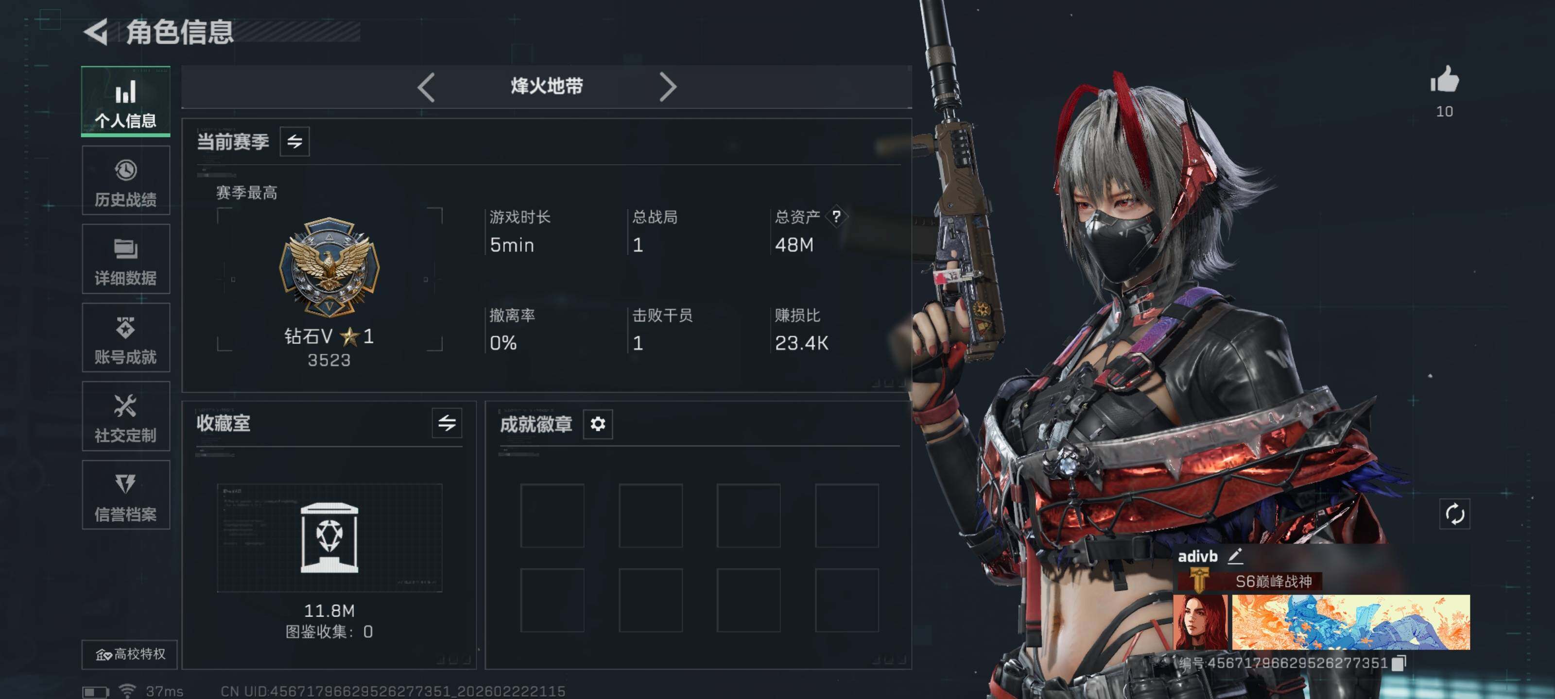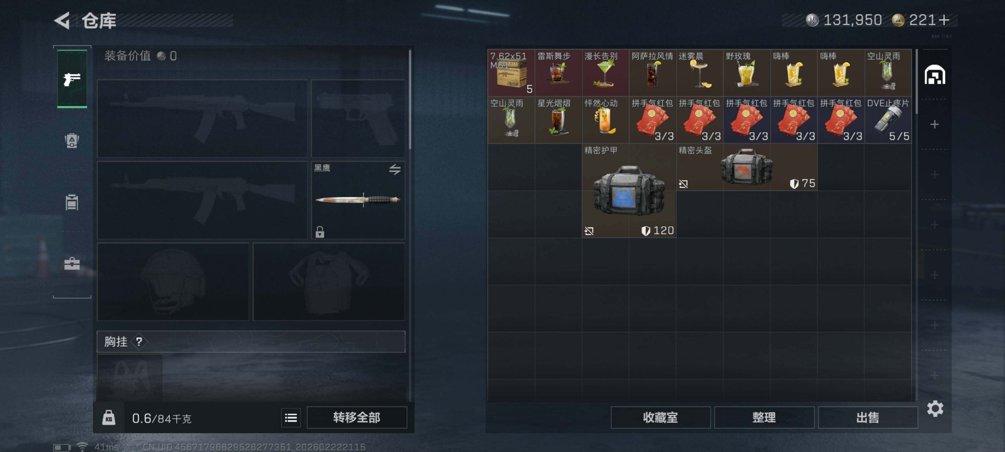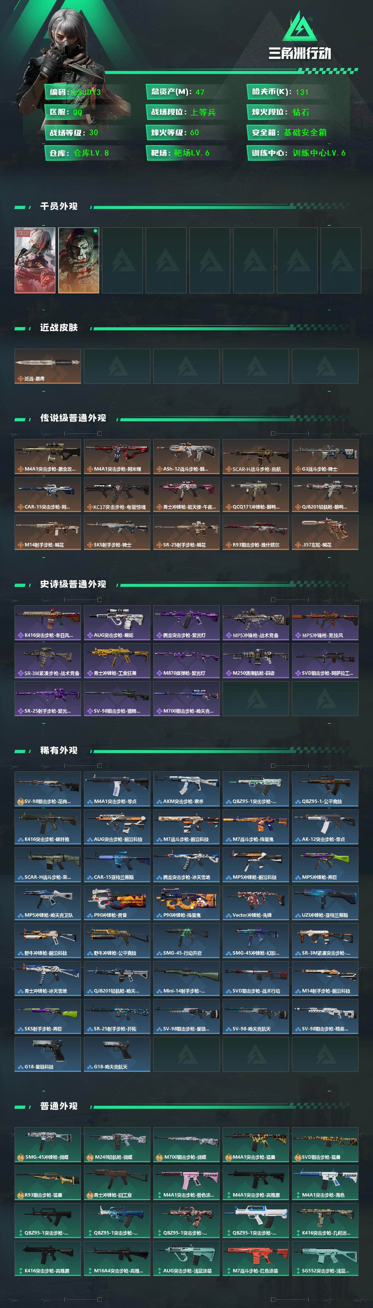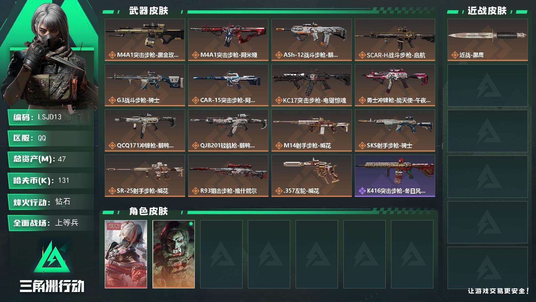 [17084730]【特价出售/店主推荐】47m总资产-131k哈伏币-60烽火等级-钻石-30战场等级-上等兵 【干员外观】:骇爪-维什戴尔,红狼-电锯惊魂 【近战皮肤】:近战-黑鹰 【传说外观】:M4A1突击步枪-蚀金玫瑰,M4A1突击步枪-阿米娅,ASh-12战斗步枪-鹅鸭杀,SCAR-H战斗步枪-启航,G3战斗步枪-骑士,CAR-15突击步枪-阿米娅,KC17突击步枪-电锯惊魂,勇士冲锋枪-能天使-午夜邮差,QCQ171冲锋枪-鹅鸭杀,QJB201轻机枪-鹅鸭杀,M14射手步枪-缄花,SKS射手步枪-骑士,SR-25射手步枪-缄花,R93狙击步枪-维什戴尔,.357左轮-缄花 【史诗外观】:K416突击步枪-冬日风情,AUG突击步枪-蝮蛇,腾龙突击步枪-聚光灯,MP5冲锋枪-战术竞备,MP5冲锋枪-竞技风,SR-3M紧凑突击步枪-战术竞备,勇士冲锋枪-工业狂潮,M870霰弹枪-聚光灯,M250通用机枪-囚徒,SVD狙击步枪-阿萨拉工艺,SR-25射手步枪-聚光灯,SV-98狙击步枪-猎鳄行动,M700狙击步枪-哈夫克警备 【稀有外观】:SV-98狙击步枪-花岗岩,M4A1突击步枪-零点,AKM突击步枪-肃杀,QBZ95-1突击步枪-医疗协议,QBZ95-1突击步枪-公平竞技,K416突击步枪-碳纤维,AUG突击步枪-前沿科技,M7战斗步枪-前沿科技,M7战斗步枪-捣蛋鬼,AK-12突击步枪-零点,SCAR-H战斗步枪-荣耀列队,CAR-15突击步枪-亚特兰蒂斯,腾龙突击步枪-冰天雪地,MP5冲锋枪-前沿科技,MP5冲锋枪-弄臣,MP5冲锋枪-哈夫克卫队,P90冲锋枪-黄昏,P90冲锋枪-捣蛋鬼,Vector冲锋枪-先锋,UZI冲锋枪-亚特兰蒂斯,野牛冲锋枪-前沿科技,野牛冲锋枪-公平竞技,SMG-45-行动开启,SMG-45冲锋枪-幻影结构,SR-3M紧凑突击步枪-前沿科技,勇士冲锋枪-冰天雪地,QJB201轻机枪-哈夫克卫队,Mini-14射手步枪-荣耀列队,SVD狙击步枪-战术行动,M14射手步枪-前沿科技,SKS射手步枪-弄臣,SR-25射手步枪-开拓,SV-98狙击步枪-星链科技,SV-98狙击步枪-哈夫克航天,SV-98狙击步枪-精英联盟,G18-星链科技,G18-哈夫克航天 【普通外观】:SMG-45冲锋枪-蝴蝶,M249轻机枪-蝴蝶,M700狙击步枪-蝴蝶,M4