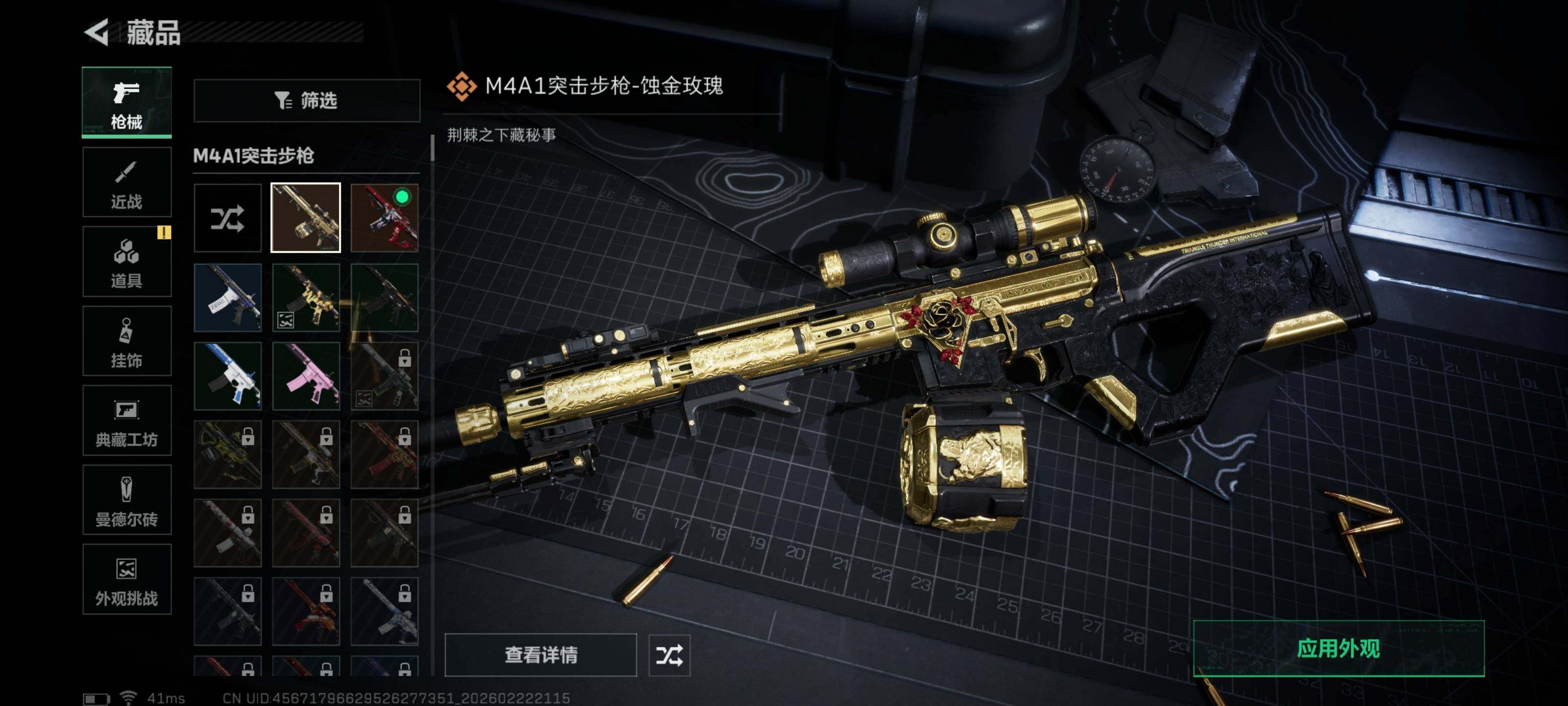 【传说外观】:M4A1突击步枪-蚀金玫瑰,M4A1突击步枪-阿米娅,ASh-12战斗步枪-鹅鸭杀,SCAR-H战斗步枪-启航,G3战斗步枪-骑士,CAR-15突击步枪-阿米娅,KC17突击步枪-电锯惊魂,勇士冲锋枪-能天使-午夜邮差,QCQ171冲锋枪-鹅鸭杀,QJB201轻机枪-鹅鸭杀,M14射手步枪-缄花,SKS射手步枪-骑士,SR-25射手步枪-缄花,R93狙击步枪-维什戴尔,.357左轮-缄花