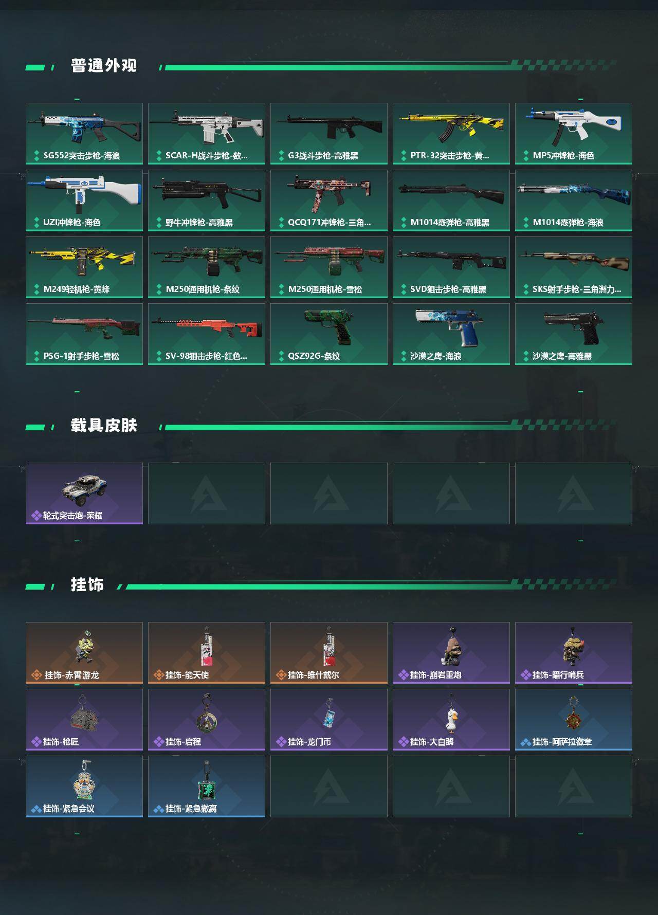 【稀有外观】:SV-98狙击步枪-花岗岩,M4A1突击步枪-零点,AKM突击步枪-肃杀,QBZ95-1突击步枪-医疗协议,QBZ95-1突击步枪-公平竞技,K416突击步枪-碳纤维,AUG突击步枪-前沿科技,M7战斗步枪-前沿科技,M7战斗步枪-捣蛋鬼,AK-12突击步枪-零点,SCAR-H战斗步枪-荣耀列队,CAR-15突击步枪-亚特兰蒂斯,腾龙突击步枪-冰天雪地,MP5冲锋枪-前沿科技,MP5冲锋枪-弄臣,MP5冲锋枪-哈夫克卫队,P90冲锋枪-黄昏,P90冲锋枪-捣蛋鬼,Vector冲锋枪-先锋,UZI冲锋枪-亚特兰蒂斯,野牛冲锋枪-前沿科技,野牛冲锋枪-公平竞技,SMG-45-行动开启,SMG-45冲锋枪-幻影结构,SR-3M紧凑突击步枪-前沿科技,勇士冲锋枪-冰天雪地,QJB201轻机枪-哈夫克卫队,Mini-14射手步枪-荣耀列队,SVD狙击步枪-战术行动,M14射手步枪-前沿科技,SKS射手步枪-弄臣,SR-25射手步枪-开拓,SV-98狙击步枪-星链科技,SV-98狙击步枪-哈夫克航天,SV-98狙击步枪-精英联盟,G18-星链科技,G18-哈夫克航天