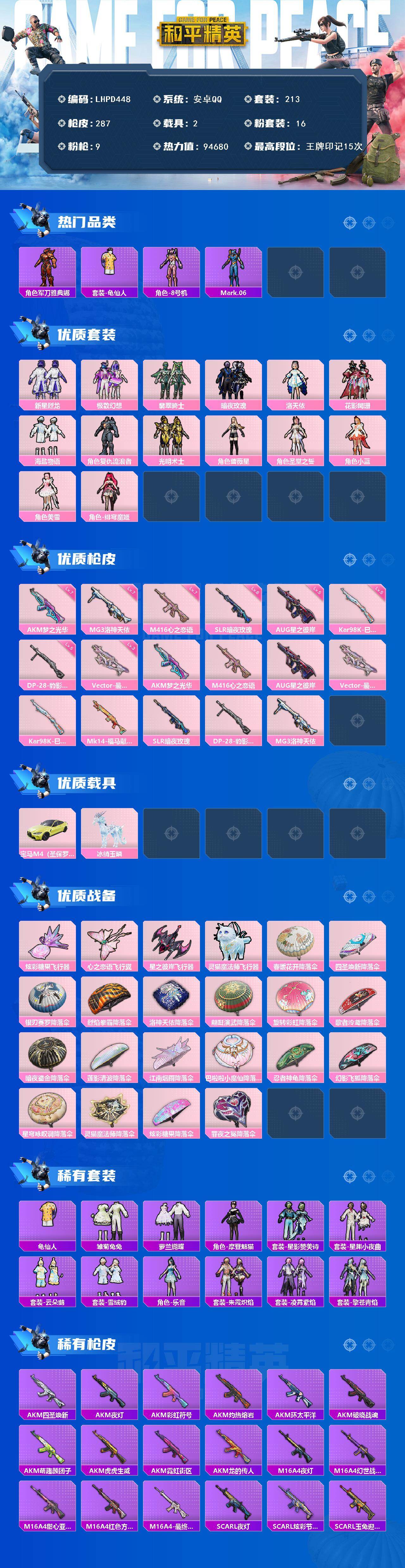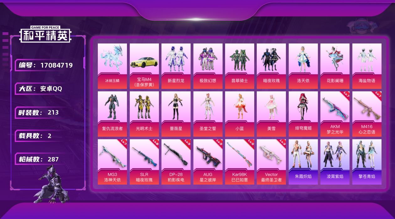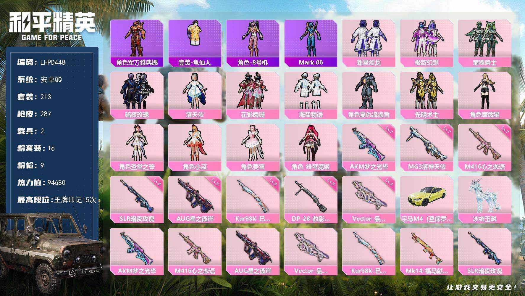 [17084719]【店主推荐捡漏号!可直接换绑】安卓 手Q-16粉装-9特效枪-2载具-4粉色飞行器-94680热力值-15王牌印记-213套装-287枪皮【热门品类】:角色-军刀雅典娜,套装-龟仙人,角色-8号机,角色-Mark.06【粉色套装】:粉装-新星烈龙,粉装-极致幻想,粉装-翡翠骑士,粉装-暗夜玫瑰,角色-洛天依,粉装-花影阑珊,粉装-海盐物语,角色-复仇流浪者,粉装-光明术士,角色-蔷薇星,角色-圣堂之誓,角色-小蓝,角色-美雪,角色-绯穹魔姬【粉色枪皮等级】:AKM-梦之光华(七级),M416-心之恋语(七级),AUG-星之彼岸(五级),Vector-最终圣卫者(三级),Kar98K-巳巳如意(五级),SLR-暗夜玫瑰(六级),DP-28-豹影疾电(五级),MG3-洛神天依(七级)【粉色载具】:宝马M4(圣保罗黄),冰绡玉鳞【粉色枪皮】:AKM-梦之光华,M416-心之恋语,AUG-星之彼岸,Vector-最终圣卫者,Kar98K-巳巳如意,Mk14-福马献瑞,SLR-暗夜玫瑰,DP-28-豹影疾电,MG3-洛神天依【粉色飞行器】:炫彩糖果飞行器,心之恋语飞行翼,星之彼岸飞行器,灵猫魔法师飞行器
