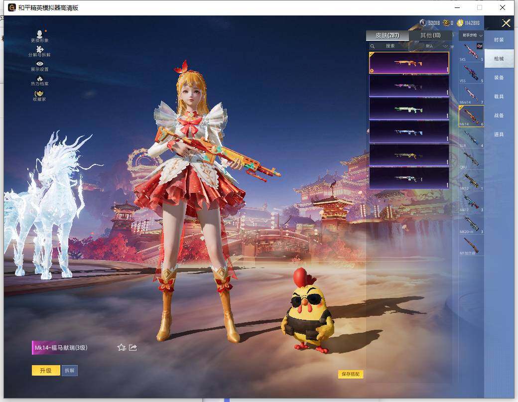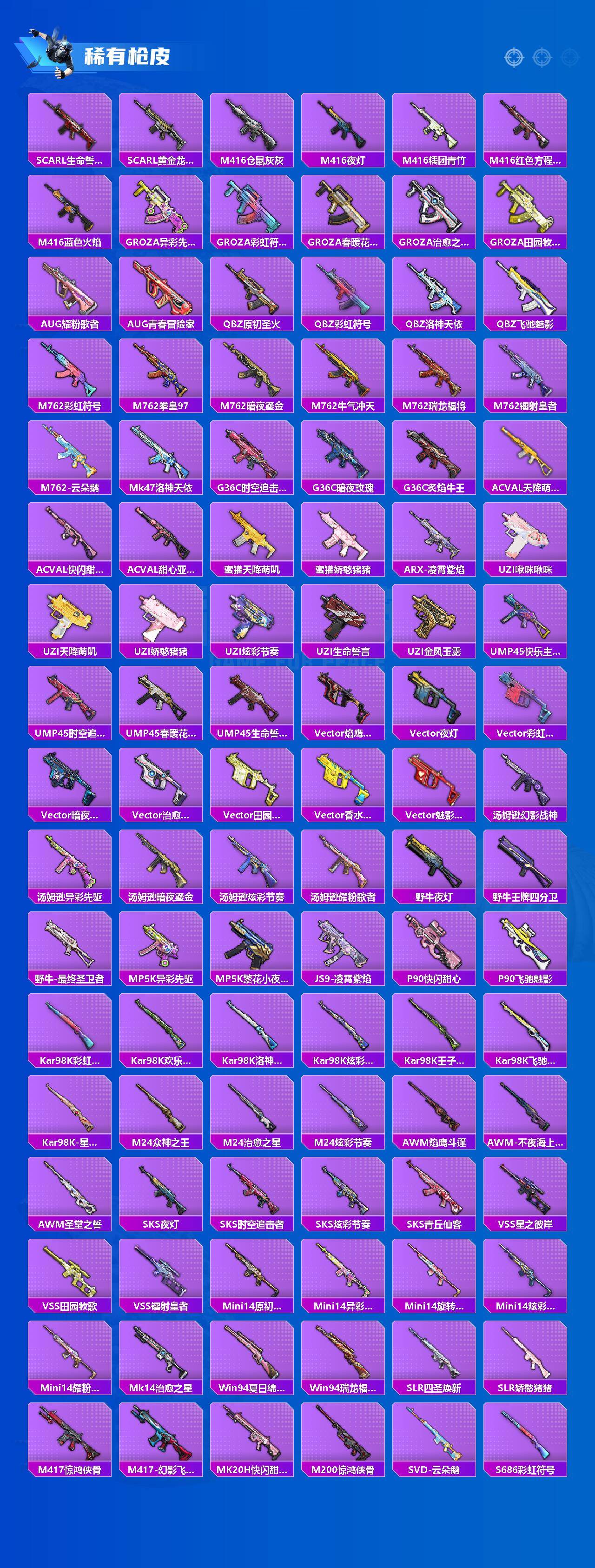 AKM-梦之光华,M416-心之恋语,AUG-星之彼岸,Kar98K-巳巳如意,SLR-暗夜玫瑰,MG3-洛神天依