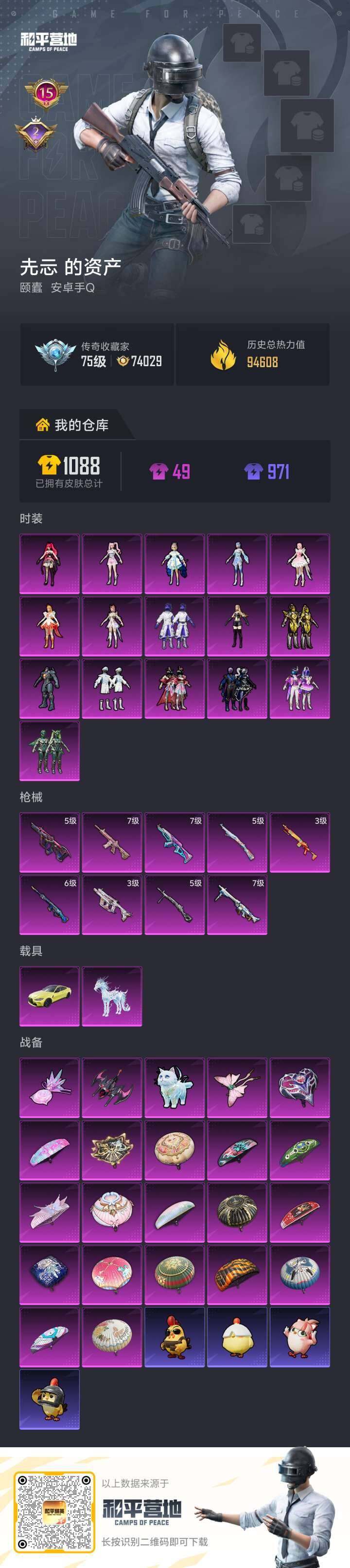 - [15142991]【店主推荐捡漏号!可直接换绑】 苹果 手Q-2粉装-4特效枪-1粉色飞行器-4.7w热力值-12王牌印记-117套装-173枪皮【热门品类】:套装-龟仙人,套装-粉红小猪【粉色套装】:角色-圣堂之誓,粉装-星穹咏叹调【粉色枪皮等级】:Kar98K-巳巳如意(五级),AMR-智耀战神(五级),MK20-H-海螺星光(六级),DP-28-千金淑猫(四级)【粉色飞行器】:星之彼岸飞行器