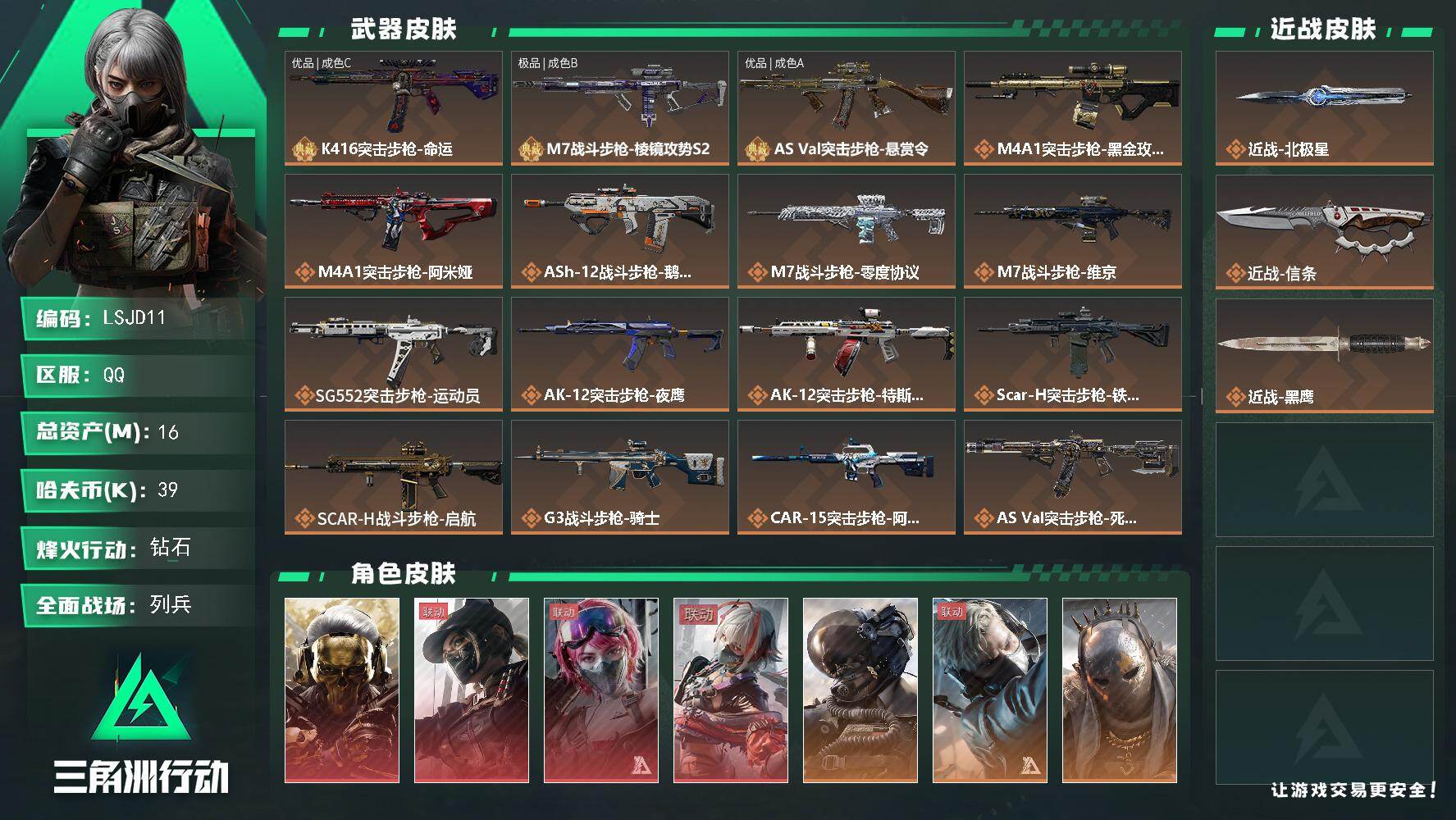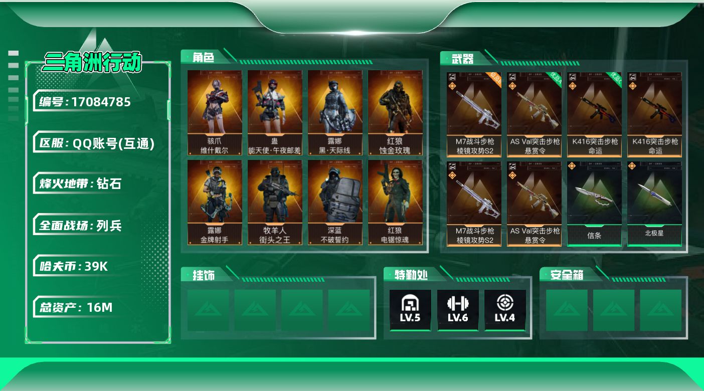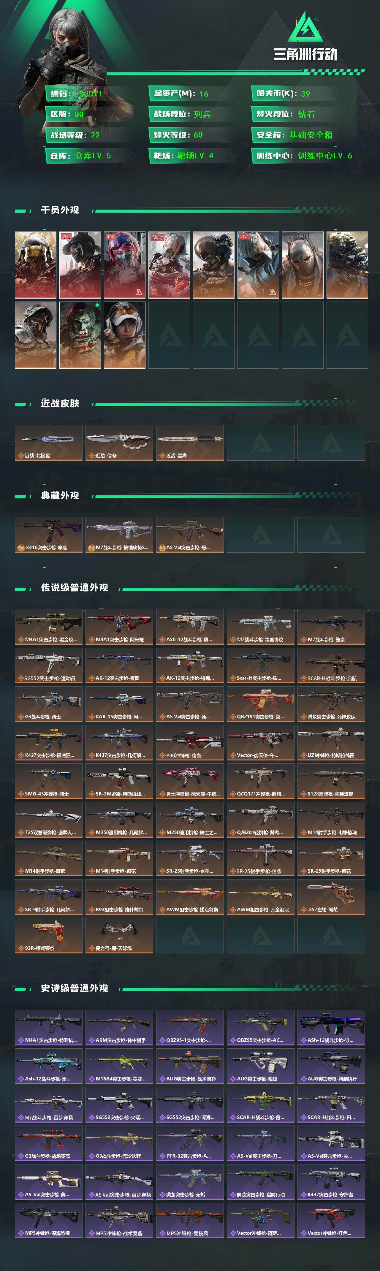 [17084785]三典藏枪皮一极品两优品【特价出售/店主推荐】16m总资产-39k哈伏币-60烽火等级-钻石-22战场等级-列兵 【干员外观】:红狼-蚀金玫瑰,露娜-黑·天际线,蛊-能天使午夜邮差,骇爪-维什戴尔,威龙-壮志凌云,蜂医-送葬人·无题密令,牧羊人-街头之王,无名-夜鹰,深蓝-不破誓约,红狼-电锯惊魂,露娜-金牌射手 【近战皮肤】:近战-北极星,近战-信条,近战-黑鹰 【典藏外观】:K416突击步枪-命运,M7战斗步枪-棱镜攻势S2,AS Val突击步枪-悬赏令 【典藏外观成色】:K416突击步枪-命运(优品C),M7战斗步枪-棱镜攻势S2(极品B),AS Val突击步枪-悬赏令(优品A) 【传说外观】:M4A1突击步枪-蚀金玫瑰,M4A1突击步枪-阿米娅,ASh-12战斗步枪-鹅鸭杀,M7战斗步枪-零度协议,M7战斗步枪-维京,SG552突击步枪-运动员,AK-12突击步枪-夜鹰,AK-12突击步枪-特斯拉线圈,SCAR-H战斗步枪-铁艺苍穹,SCAR-H战斗步枪-启航,G3战斗步枪-骑士,CAR-15突击步枪-阿米娅,AS Val突击步枪-死神玫瑰,腾龙突击步枪-捞点薯条,腾龙突击步枪-死神玫瑰,K437突击步枪-极速狂飙,K437突击步枪-几何解构,P90冲锋枪-信条,Vector冲锋枪-能天使-午夜邮差,UZI冲锋枪-特斯拉线圈,SMG-45冲锋枪-骑士,SR-3M紧凑突击步枪-特斯拉线圈,勇士冲锋枪-能天使-午夜邮差,QCQ171冲锋枪-鹅鸭杀,S12K霰弹枪-死神玫瑰,725双管霰弹枪-送葬人-无题密令,M250通用机枪-几何解构,M250通用机枪-骑士之心,QJB201轻机枪-鹅鸭杀,M14射手步枪-电锯惊魂,M14射手步枪-蛮荒,M14射手步枪-缄花,SR-25射手步枪-水墨云图,SR-25射手步枪-信条,SR-25射手步枪-缄花,SR-9射手步枪-几何解构,R93狙击步枪-维什戴尔,AWM狙击步枪-捞点薯条,AWM狙击步枪-万金泪冠,.357左轮-缄花,93R-捞点薯条,复合弓-黑·天际线 【史诗外观】:M4A1突击步枪-特勤执行,AKM突击步枪-林中猎手,QBZ95-1突击步枪-曙光,QBZ95-1突击步枪-ACE,ASh-12战斗步枪-守夜人,ASh-12战斗步枪-无极限,M16A4突击步枪-竞赛选手,AUG突击步枪-战术迷彩,AUG突击步枪-蝮蛇