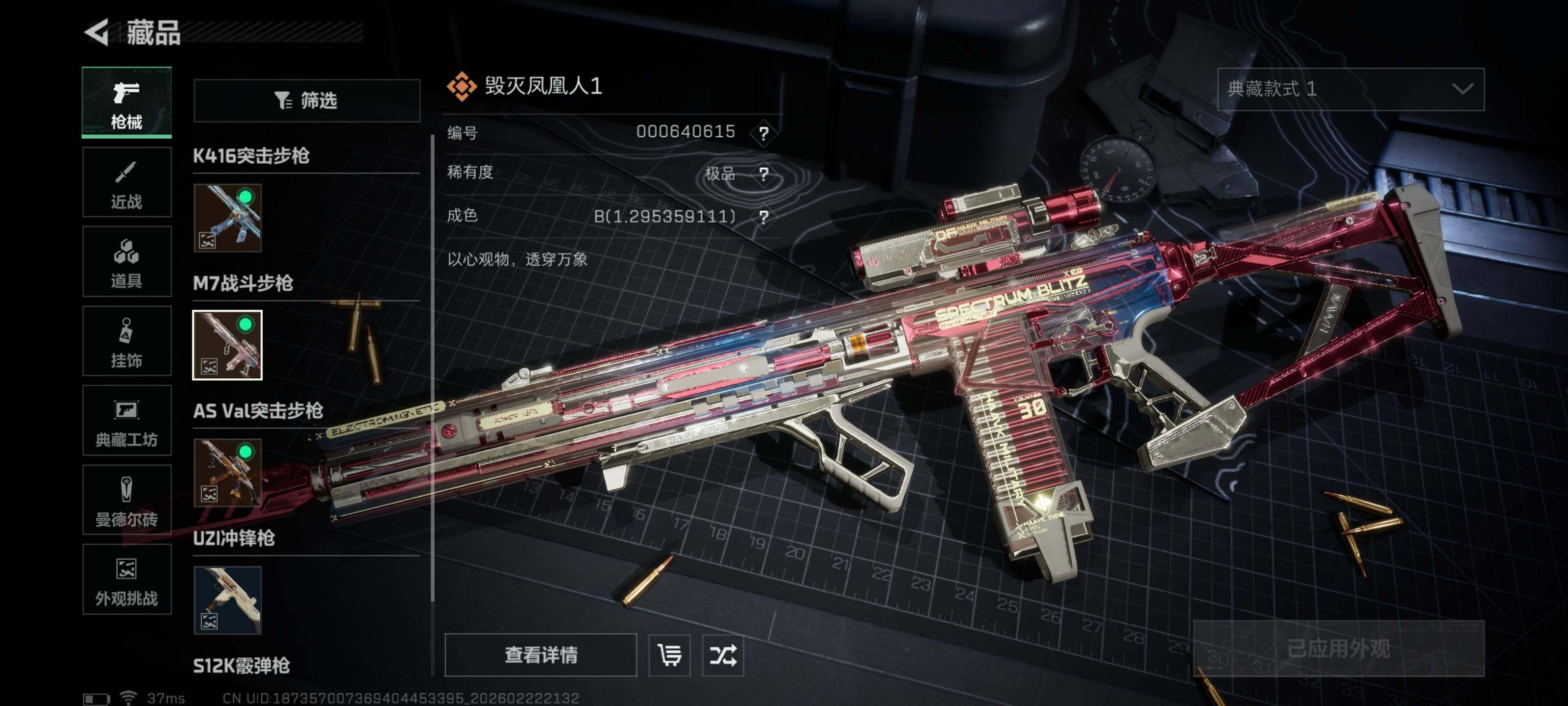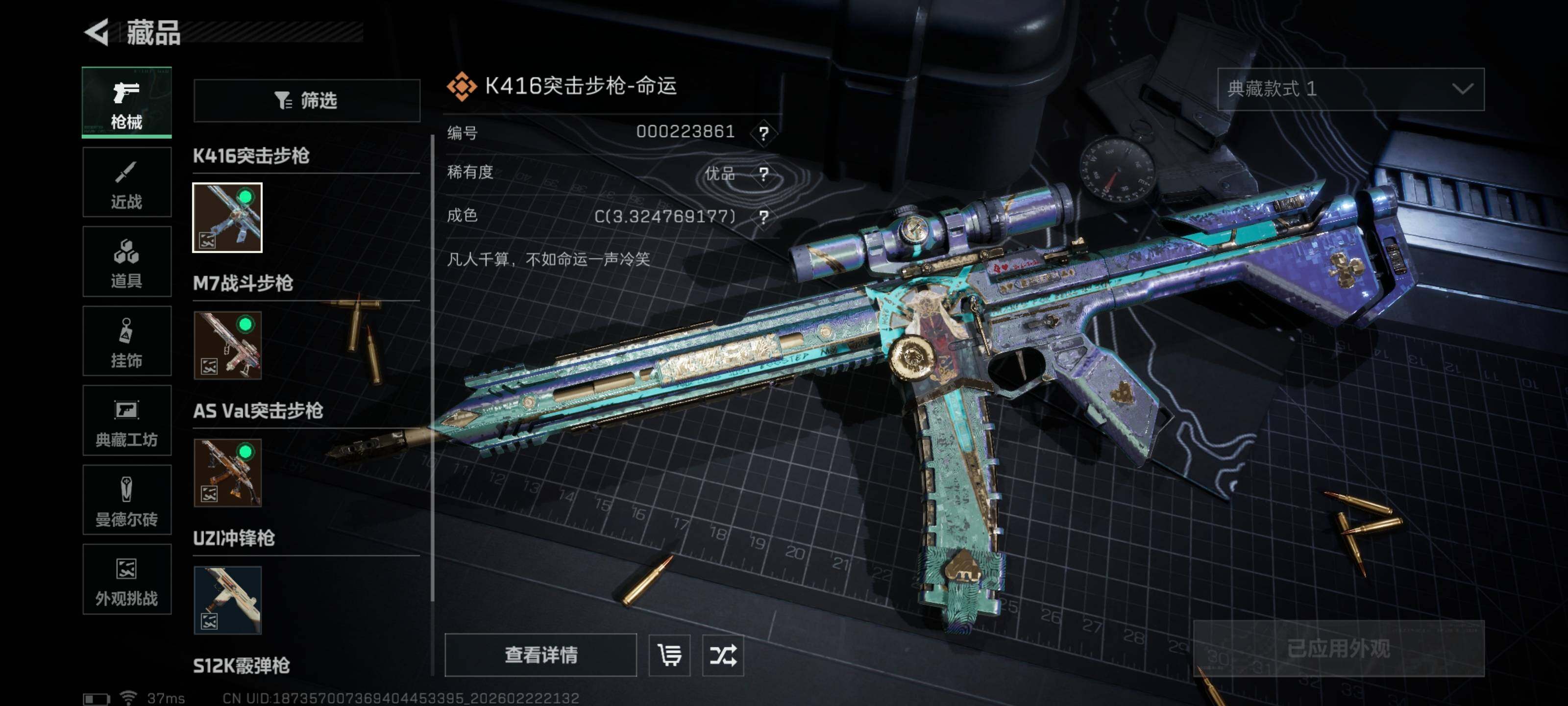 【典藏外观成色】:K416突击步枪-命运(优品C),M7战斗步枪-棱镜攻势S2(极品B),AS Val突击步枪-悬赏令(优品A)