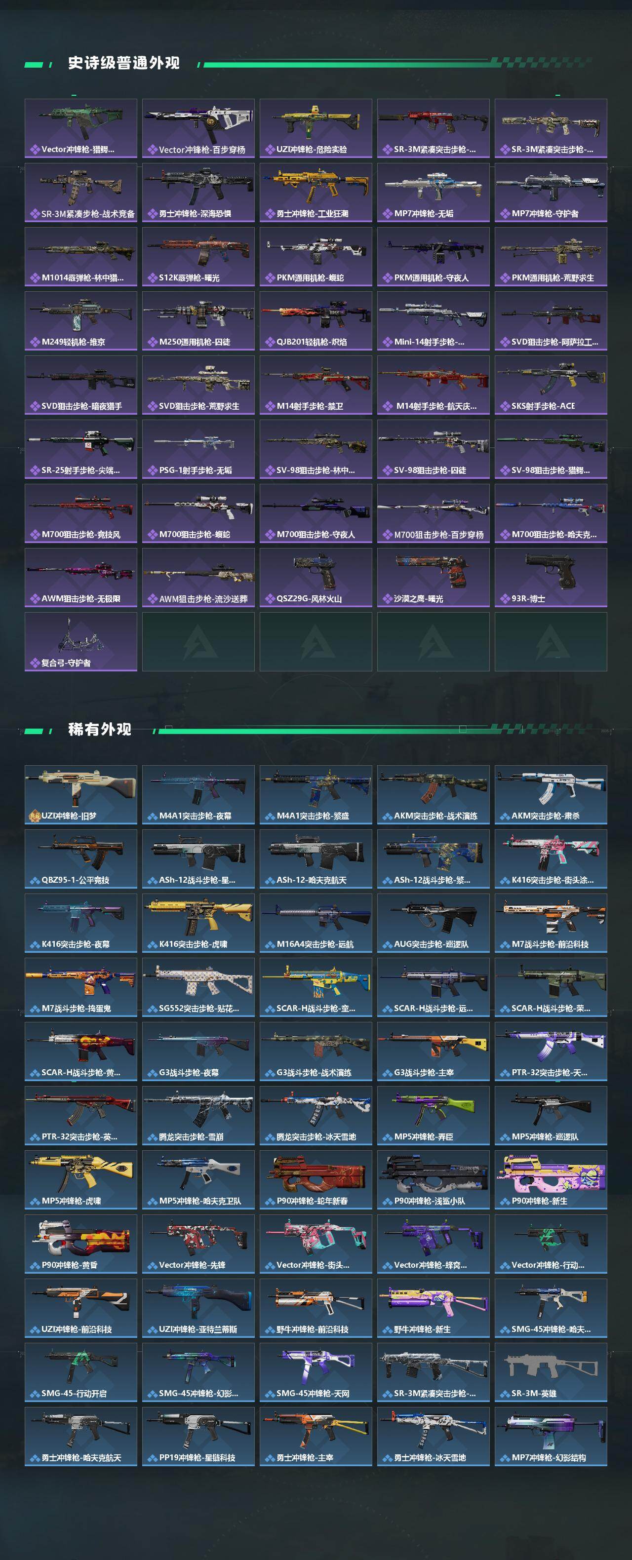 【史诗外观】:M4A1突击步枪-特勤执行,AKM突击步枪-林中猎手,QBZ95-1突击步枪-曙光,QBZ95-1突击步枪-ACE,ASh-12战斗步枪-守夜人,ASh-12战斗步枪-无极限,M16A4突击步枪-竞赛选手,AUG突击步枪-战术迷彩,AUG突击步枪-蝮蛇