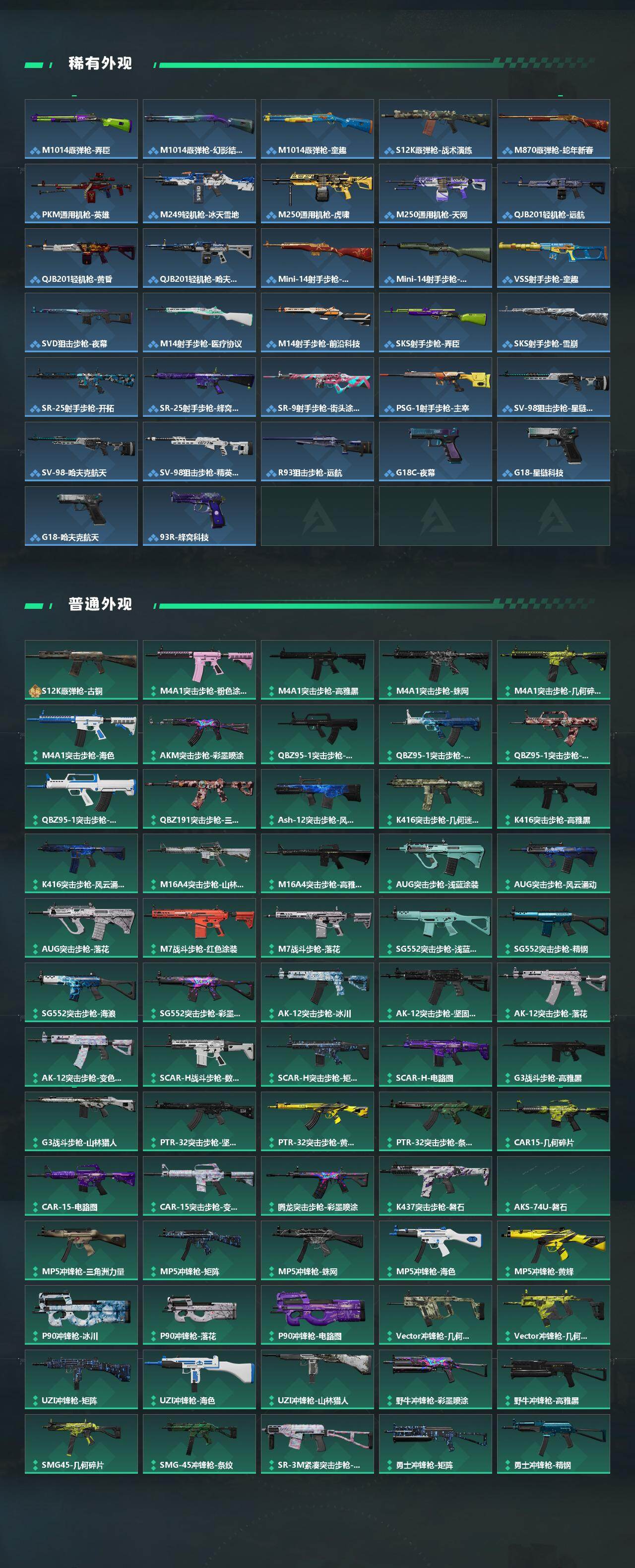 【传说外观】:M4A1突击步枪-蚀金玫瑰,M4A1突击步枪-阿米娅,ASh-12战斗步枪-鹅鸭杀,M7战斗步枪-零度协议,M7战斗步枪-维京,SG552突击步枪-运动员,AK-12突击步枪-夜鹰,AK-12突击步枪-特斯拉线圈,SCAR-H战斗步枪-铁艺苍穹,SCAR-H战斗步枪-启航,G3战斗步枪-骑士,CAR-15突击步枪-阿米娅,AS Val突击步枪-死神玫瑰,腾龙突击步枪-捞点薯条,腾龙突击步枪-死神玫瑰,K437突击步枪-极速狂飙,K437突击步枪-几何解构,P90冲锋枪-信条,Vector冲锋枪-能天使-午夜邮差,UZI冲锋枪-特斯拉线圈,SMG-45冲锋枪-骑士,SR-3M紧凑突击步枪-特斯拉线圈,勇士冲锋枪-能天使-午夜邮差,QCQ171冲锋枪-鹅鸭杀,S12K霰弹枪-死神玫瑰,725双管霰弹枪-送葬人-无题密令,M250通用机枪-几何解构,M250通用机枪-骑士之心,QJB201轻机枪-鹅鸭杀,M14射手步枪-电锯惊魂,M14射手步枪-蛮荒,M14射手步枪-缄花,SR-25射手步枪-水墨云图,SR-25射手步枪-信条,SR-25射手步枪-缄花,SR-9射手步枪-几何解构,R93狙击步枪-维什戴尔,AWM狙击步枪-捞点薯条,AWM狙击步枪-万金泪冠,.357左轮-缄花,93R-捞点薯条,复合弓-黑·天际线
