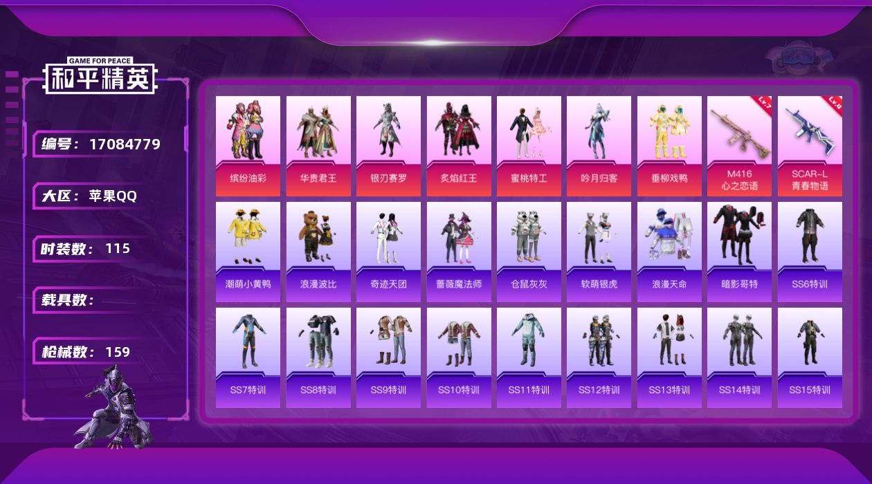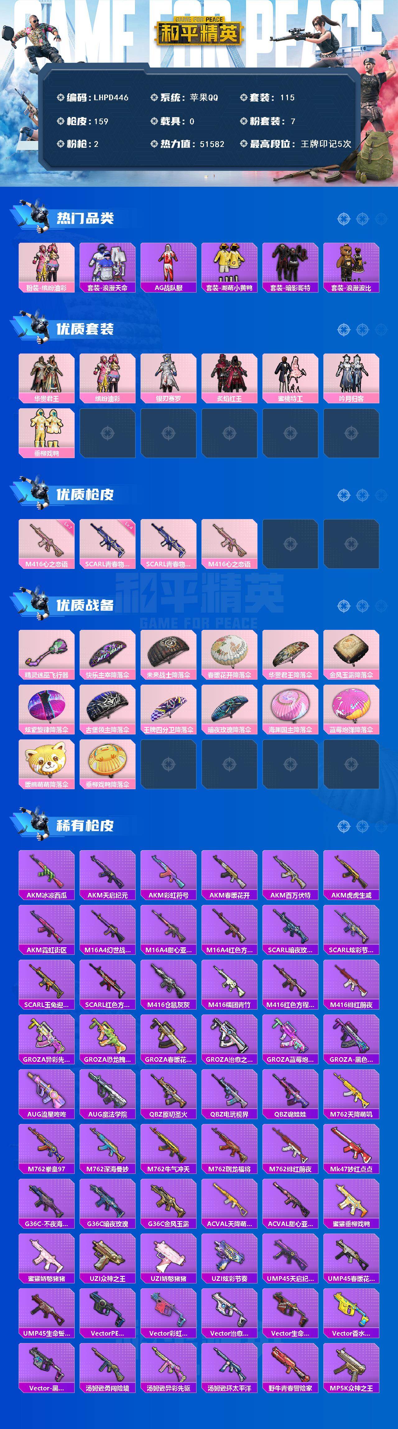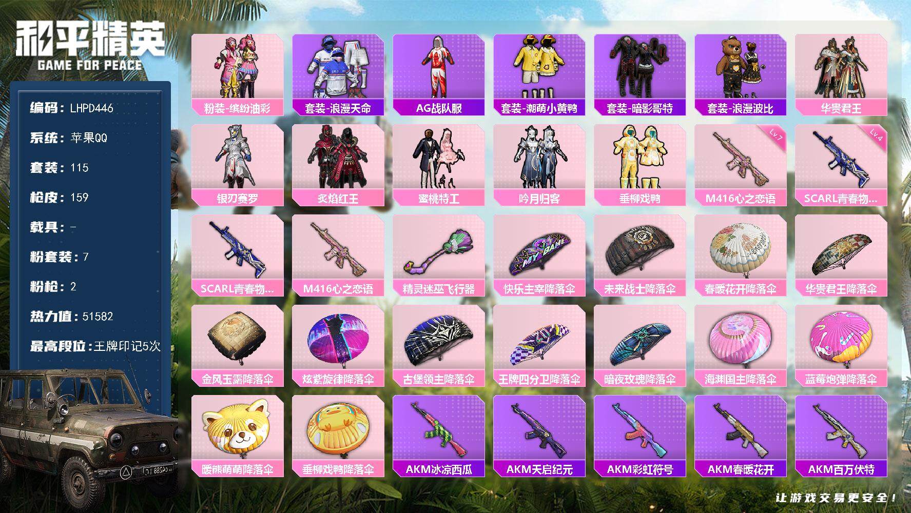 [17084779]【店主推荐捡漏号!可直接换绑】苹果 手Q-7粉装-2特效枪-0载具-1粉色飞行器-51582热力值-5王牌印记-115套装-159枪皮【热门品类】:粉装-缤纷油彩,套装-浪漫天命,套装-AG战队服,套装-潮萌小黄鸭,套装-暗影哥特,套装-浪漫波比【粉色套装】:粉装-华贵君王,粉装-缤纷油彩,粉装-银刃赛罗,粉装-炙焰红王,粉装-蜜桃特工,粉装-吟月归客,粉装-垂柳戏鸭【粉色枪皮等级】:SCAR-L-青春物语(四级),M416-心之恋语(七级)【粉色枪皮】:SCAR-L-青春物语,M416-心之恋语【粉色飞行器】:精灵迷巫飞行器