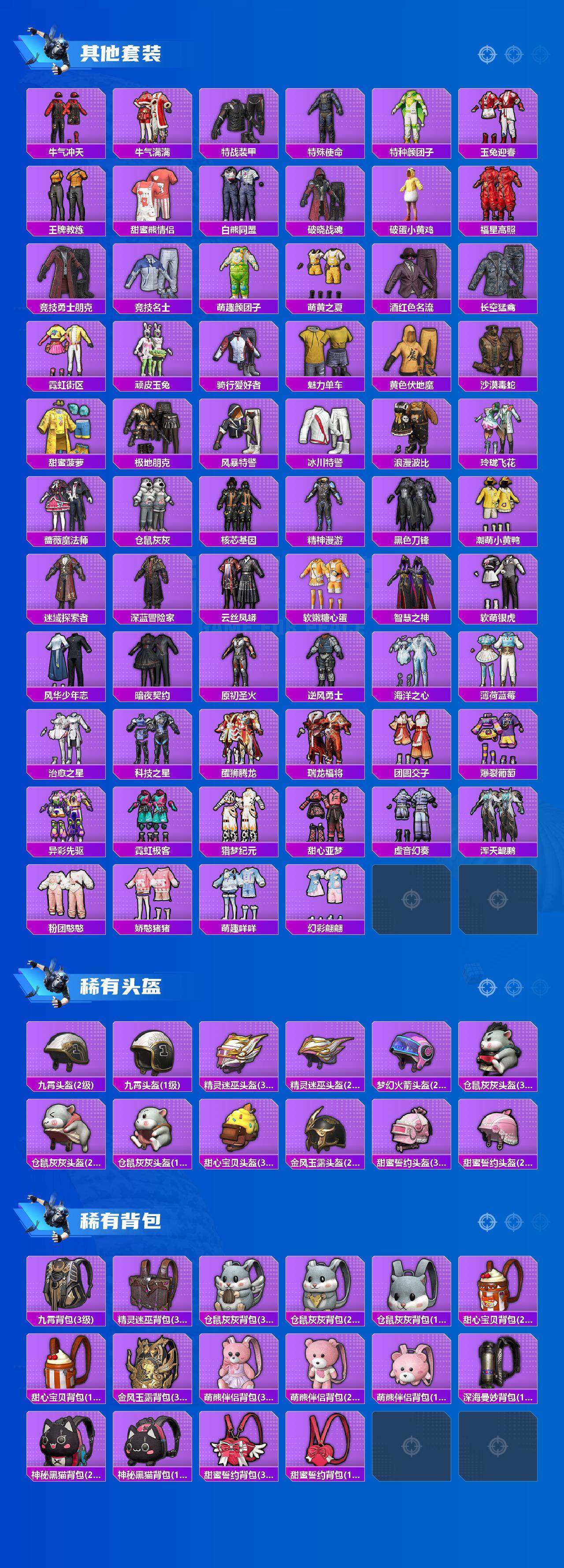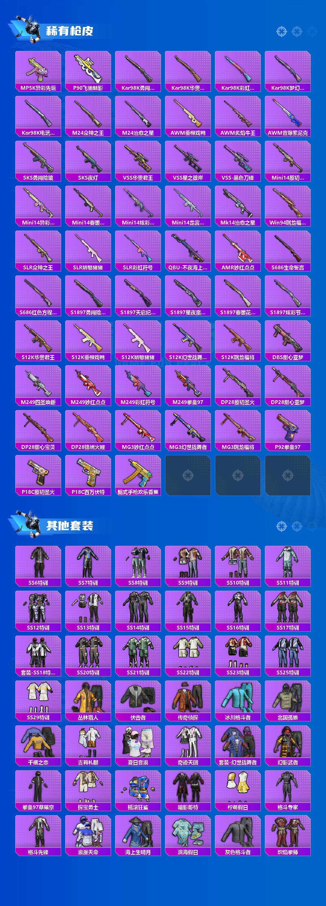 - [11601539]1粉装 6特效枪 1载具 4印记 可二次 可修改实名 优质装备:阿斯顿·马丁DBS(绿),Mini14龙虾霸霸,M762甜蜜誓约,AKM炫紫旋律,Kar98K伏魔团,M416心之恋语,天启纪元,七级M762-甜蜜誓约 热门装扮:奇迹天团,深海小丑鱼 稀有枪皮:DP-28-豹影疾电 五级特效枪:五级Kar98K-伏魔团 四级特效枪:四级M416-心之恋语 一级特效枪:一级Kar98K-伏魔团,一级Mini14-龙虾霸霸,一级DP-28-豹影疾电 紫色装扮:SS23特训,幻彩翩翩,妙红点点,娇憨猪猪,萌趣咩咩,SS21特训,SS5特训,冰原使者,,冰川特警,冰焰天使,凛冬战士,北国孤狼,梦起落英,青春冒险家,光影梦想家,潮流游乐家,SS15特训,SS16特训,星河入梦,银白舞王,SS13特训,治愈之星,科技之星,SS14特训,萌趣颜团子,SS19特训,吉莉礼服,瑞龙福将,团圆交子,SS17特训,都市漫游者,金鼠迎春,长空猛禽,雪山征服者,雪山精英,霓虹街区,翡翠奔狼,耀眼新星,蓝色守护者,虎虎生威吉莉,街头潮人,超能勇士,跃动心情,飞行日记,魅力单车,鹤鸣,龙的传人,格斗先锋,滨海假日,圣诞大吉,坚韧舞者,夏日音浪,夜莺强袭者,怒火燎原,滨海厨神,甜蜜菠萝,疯狂小兔子,破蛋小黄鸡,甜蜜告白,福星高照,竞技勇士朋克,甜蜜熊情侣,牛气冲天,灰色格斗者,热血青春,牛气满满,特战装甲,镭射皇者,玉兔迎春,竞技名士,SS25特训,金羽特工,精神漫游,炽焰拳师,格斗专家,SS6特训,闪耀星光,黑色刀锋,核芯基因,SS7特训,清香五月粽,软嫩糖心蛋,深蓝冒险家,迷域探索者,拳皇97草薙京,云纹魔法士,SS8特训,青龙圣者,原初圣火,逆风勇士,SS12特训,韶华初心,纯白誓言,众神之王,智慧之神,SS9特训,风华少年志,白月香洋装,SS10特训,暗夜契约,SS11特训,萌黄之夏,金耀舞者,装甲骑士,丛林猎人,传奇侦探,奇趣企鹅,海上生明月 优质战备:至尊龙雀降落伞,龙虾霸霸降落伞,炫紫旋律降落伞,马卡龙降落伞,阿狸红降落伞,四圣焕新降落伞,飞行器-绮梦青鸾,齐天大圣降落伞