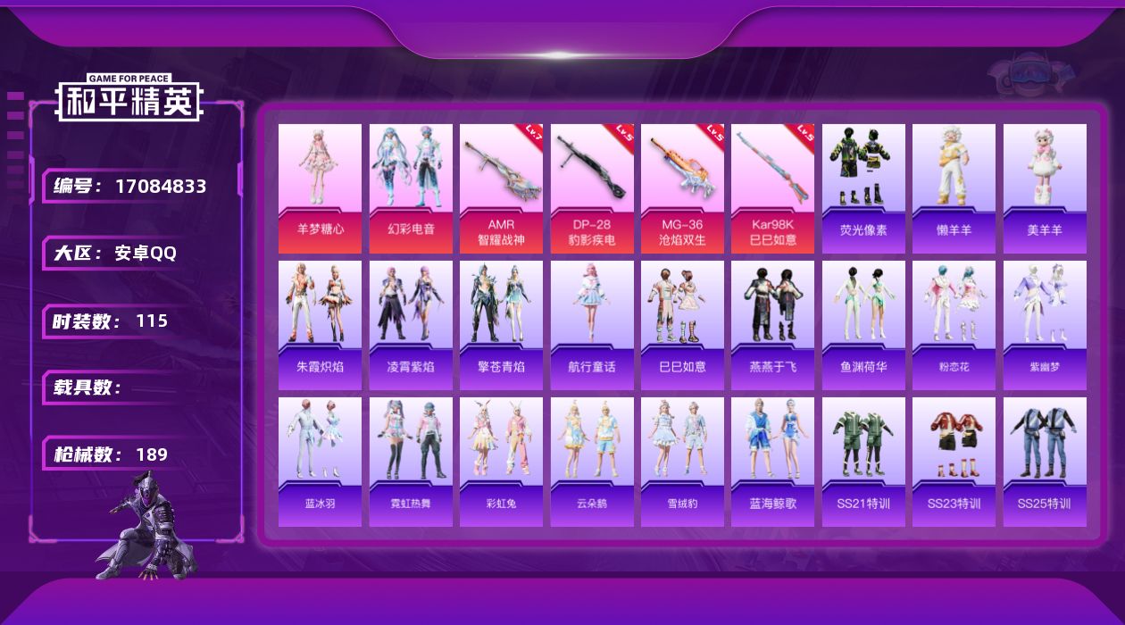 [17084833]安卓 手Q-3粉装-6特效枪-0载具-2粉色飞行器-49693热力值-7王牌印记-115套装-189枪皮 【粉色套装】:粉装-幻彩电音,角色-羊梦糖心,角色-虹云熊熊 【粉色枪皮等级】:Kar98K-巳巳如意(五级),AMR-智耀战神(七级),DP-28-豹影疾电(五级),MG-36-沧焰双生(五级) 【粉色枪皮】:ACE32-萌骑漫游,Kar98K-巳巳如意,Mk14-福马献瑞,AMR-智耀战神,DP-28-豹影疾电,MG-36-沧焰双生 【粉色飞行器】:炫彩糖果飞行器,极意拳锋飞行器 【粉色降落伞】:彩虹甜喵降落伞,江南烟雨降落伞,精灵梦叶罗丽降落伞,创世·救赎降落伞,金丰海韵降落伞,荧海星豚降落伞,极意拳锋降落伞,炫彩糖果降落伞,虹云熊熊降落伞 【稀有套装】:套装-航行童话,套装-巳巳如意,套装-荧光像素,套装-雪国风尚,套装-炫彩糖果,套装-马上来财,套装-燕燕于飞,套装-鱼渊荷华,套装-粉恋花,套装-紫幽梦,套装-蓝冰羽,套装-霓虹热舞,套装-彩虹兔,套装-云朵鹅,套装-雪绒豹,套装-蓝海鲸歌,套装-朱霞炽焰,套装-凌霄紫焰,套装-擎苍青焰,玩偶服-懒羊羊,玩偶服-美羊羊,角色-馥郁金蕊,套装-雨过天青,套装-红釉青花 【稀有枪皮】:AUG-冰晶雪宝,AKM-破晓战魂,AKM-龙的传人,M16A4-幻世战舞者,M16A4-红色方程式,M16A4-蓝色火焰,SCAR-L-夜灯,SCAR-L-炫彩节奏,SCAR-L-玉兔迎春,SCAR-L-红色方程式,M416-糯团青竹,M416-红色方程式,M416-蓝色火焰,GROZA-荧海星豚,AUG-天降萌叽,AUG-耀粉歌者,QBZ-彩虹符号,M762-天降萌叽,M762-彩虹符号,M762-云朵鹅,M762-登顶巅峰,G36C-星穹咏叹调,AC-VAL-闲梦青缨,蜜獾-天降萌叽,Famas-月下星之子,ARX-凌霄紫焰,UZI-啾咪啾咪,UZI-天降萌叽,UZI-红色方程式,UMP45-夜灯,UMP45-春暖花开,UMP45-生命誓言,UMP45-蓝色火焰,Vector-生命誓言,汤姆逊-天降萌叽,汤姆逊-暗夜鎏金,汤姆逊-炫彩节奏,汤姆逊-耀粉歌者,AKS-74U-荧光像素,JS9-凌霄紫焰,P90-巳巳如意,Kar98K-红色方程式,M24-炫彩节奏,M24-幻彩电音,VSS-彩虹符号,Mini14-春暖花开