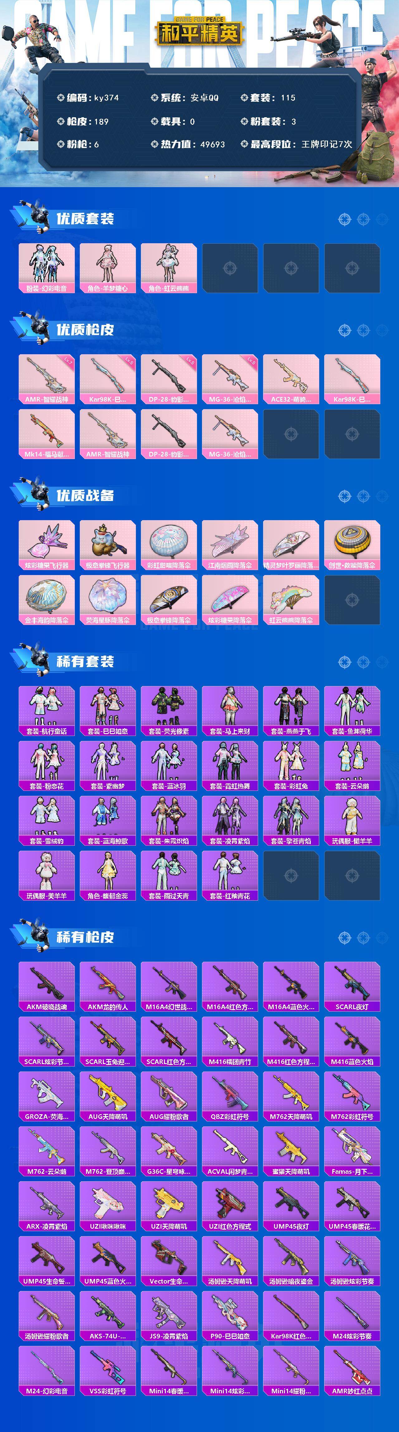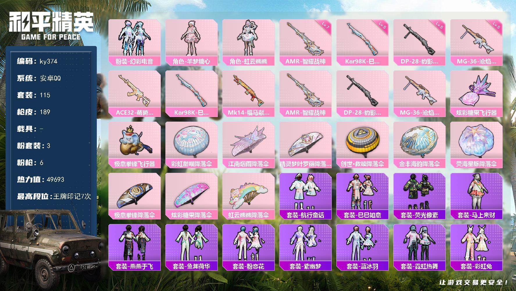 [17084833]安卓 手Q-3粉装-6特效枪-0载具-2粉色飞行器-49693热力值-7王牌印记-115套装-189枪皮