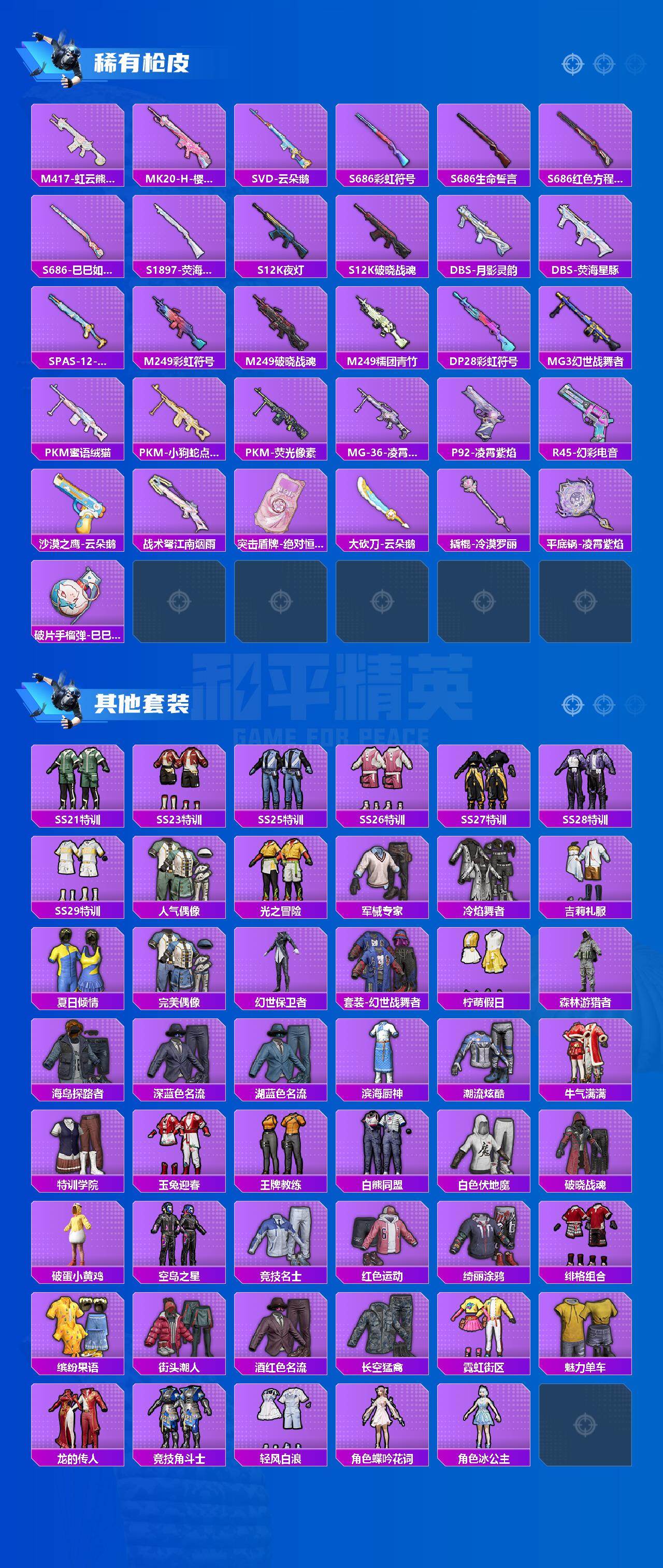 - [16181916]【特价出售/店主推荐】 111m总资产-693k哈伏币-60烽火等级-钻石-17战场等级-上等兵 【干员外观】:骇爪-水墨云图,露娜-黑·天际线,蜂医-送葬人·无题密令 【近战皮肤】:近战-北极星,近战-黑鹰 【传说外观】:M4A1突击步枪-阿米娅,ASh-12战斗步枪-鹅鸭杀,AK-12突击步枪-特斯拉线圈,SCAR-H战斗步枪-水墨云图,SCAR-H战斗步枪-启航,G3战斗步枪-骑士,CAR-15突击步枪-阿米娅,腾龙突击步枪-捞点薯条,K437突击步枪-北极星,UZI冲锋枪-特斯拉线圈,SR-3M紧凑突击步枪-特斯拉线圈,勇士冲锋枪-能天使-午夜邮差,QCQ171冲锋枪-北极星,QCQ171冲锋枪-鹅鸭杀,725双管霰弹枪-送葬人-无题密令,M250通用机枪-骑士之心,QJB201轻机枪-鹅鸭杀,AWM狙击步枪-捞点薯条,93R-捞点薯条,复合弓-黑·天际线 【史诗外观】:ASh-12战斗步枪-无极限,M16A4突击步枪-竞赛选手,AS Val突击步枪-典狱官,腾龙突击步枪-无垢,腾龙突击步枪-猎鳄行动,K437突击步枪-守护者,MP5冲锋枪-战术竞备,MP5冲锋枪-竞技风,Vector冲锋枪-猎鳄行动,SR-3M紧凑突击步枪-荒野求生,SR-3M紧凑突击步枪-战术竞备,勇士冲锋枪-工业狂潮,MP7冲锋枪-无垢,MP7冲锋枪-守护者,PKM通用机枪-蝮蛇,PKM通用机枪-荒野求生,M250通用机枪-囚徒,Mini-14射手步枪-守护者,SVD狙击步枪-阿萨拉工艺,SVD狙击步枪-荒野求生,PSG-1射手步枪-无垢,SV-98狙击步枪-林中猎手,AWM狙击步枪-无极限,沙漠之鹰-曙光,复合弓-守护者 【稀有外观】:M1014霰弹枪-花岗岩,SV-98狙击步枪-花岗岩,AS Val突击步枪-地平线,AKM突击步枪-战术演练,AKM突击步枪-肃杀,QBZ95-1突击步枪-医疗协议,QBZ95-1突击步枪-公平竞技,K416突击步枪-虎啸,M7战斗步枪-捣蛋鬼,SCAR-H战斗步枪-荣耀列队,SCAR-H战斗步枪-黄昏,G3战斗步枪-战术演练,G3战斗步枪-主宰,腾龙突击步枪-雪崩,K437突击步枪-天狼星,MP5冲锋枪-弄臣,MP5冲锋枪-虎啸,MP5冲锋枪-哈夫克卫队,P90冲锋枪-黄昏,Vector冲锋枪-先锋,UZI冲锋枪-亚特兰蒂斯,SMG-45-行动开启