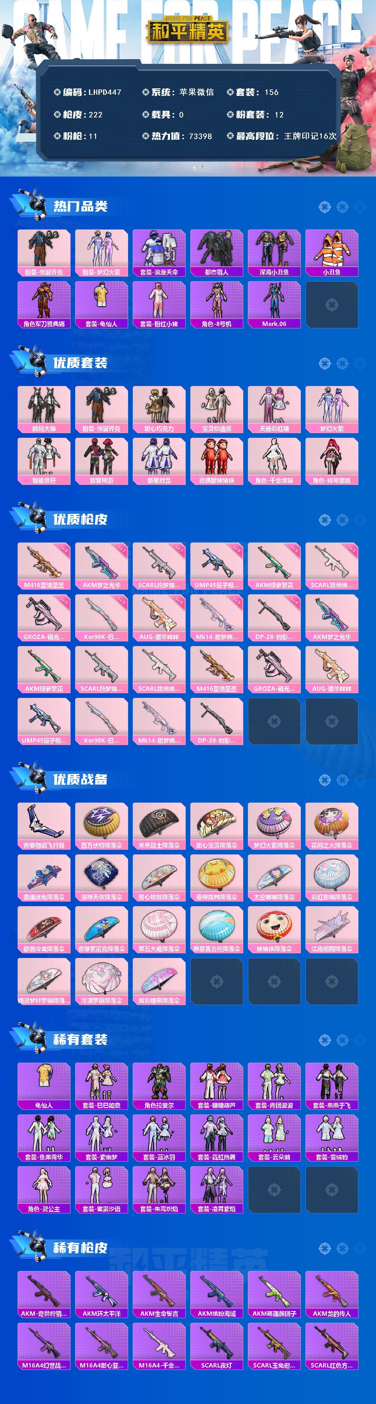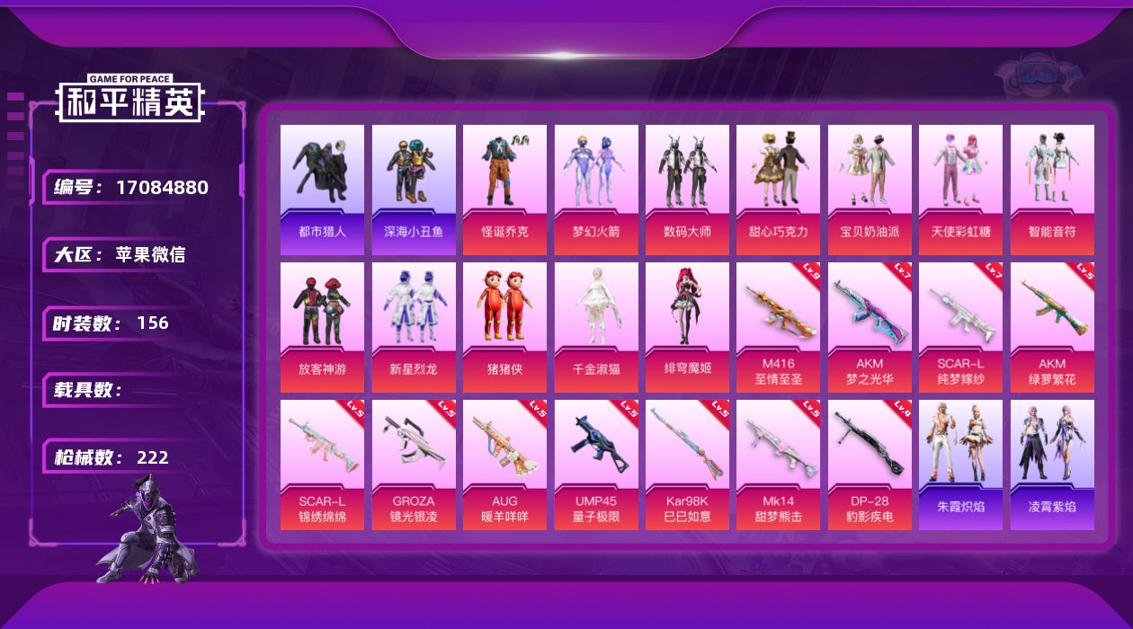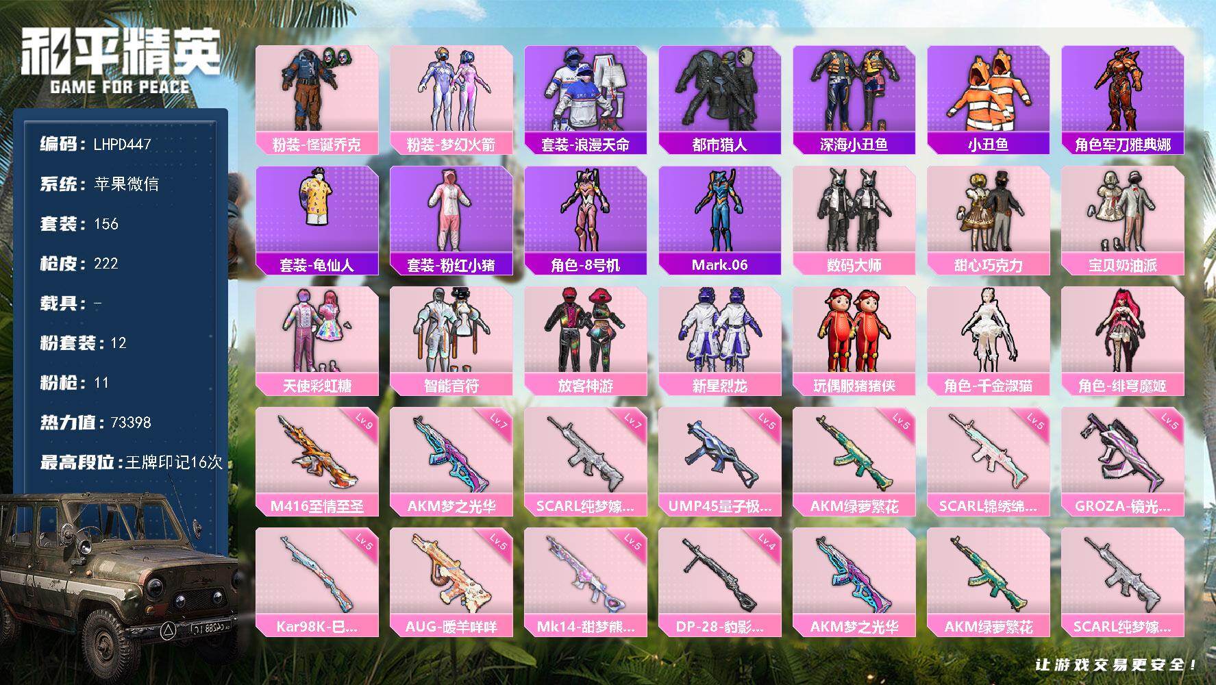 [17084880]【店主推荐捡漏号!可直接换绑】苹果 微信-12粉装-11特效枪-0载具-1粉色飞行器-73398热力值-16王牌印记-156套装-222枪皮【热门品类】:粉装-怪诞乔克,粉装-梦幻火箭,套装-浪漫天命,套装-都市猎人,套装-深海小丑鱼,套装-小丑鱼,角色-军刀雅典娜,套装-龟仙人,套装-粉红小猪,角色-8号机,角色-Mark.06【粉色套装】:粉装-数码大师,粉装-怪诞乔克,粉装-甜心巧克力,粉装-宝贝奶油派,粉装-天使彩虹糖,粉装-梦幻火箭,粉装-智能音符,粉装-放客神游,粉装-新星烈龙,玩偶服-猪猪侠,角色-千金淑猫,角色-绯穹魔姬【粉色枪皮等级】:AKM-梦之光华(七级),AKM-绿萝繁花(五级),SCAR-L-纯梦嫁纱(七级),SCAR-L-锦绣绵绵(五级),M416-至情至圣(九级),GROZA-镜光银凌(五级),AUG-暖羊咩咩(五级),UMP45-量子极限(五级),Kar98K-巳巳如意(五级),Mk14-甜梦熊击(五级),DP-28-豹影疾电(四级)【粉色枪皮】:AKM-梦之光华,AKM-绿萝繁花,SCAR-L-纯梦嫁纱,SCAR-L-锦绣绵绵,M416-至情至圣,GROZA-镜光银凌,AUG-暖羊咩咩,UMP45-量子极限,Kar98K-巳巳如意,Mk14-甜梦熊击,DP-28-豹影疾电【粉色飞行器】:青春物语飞行器