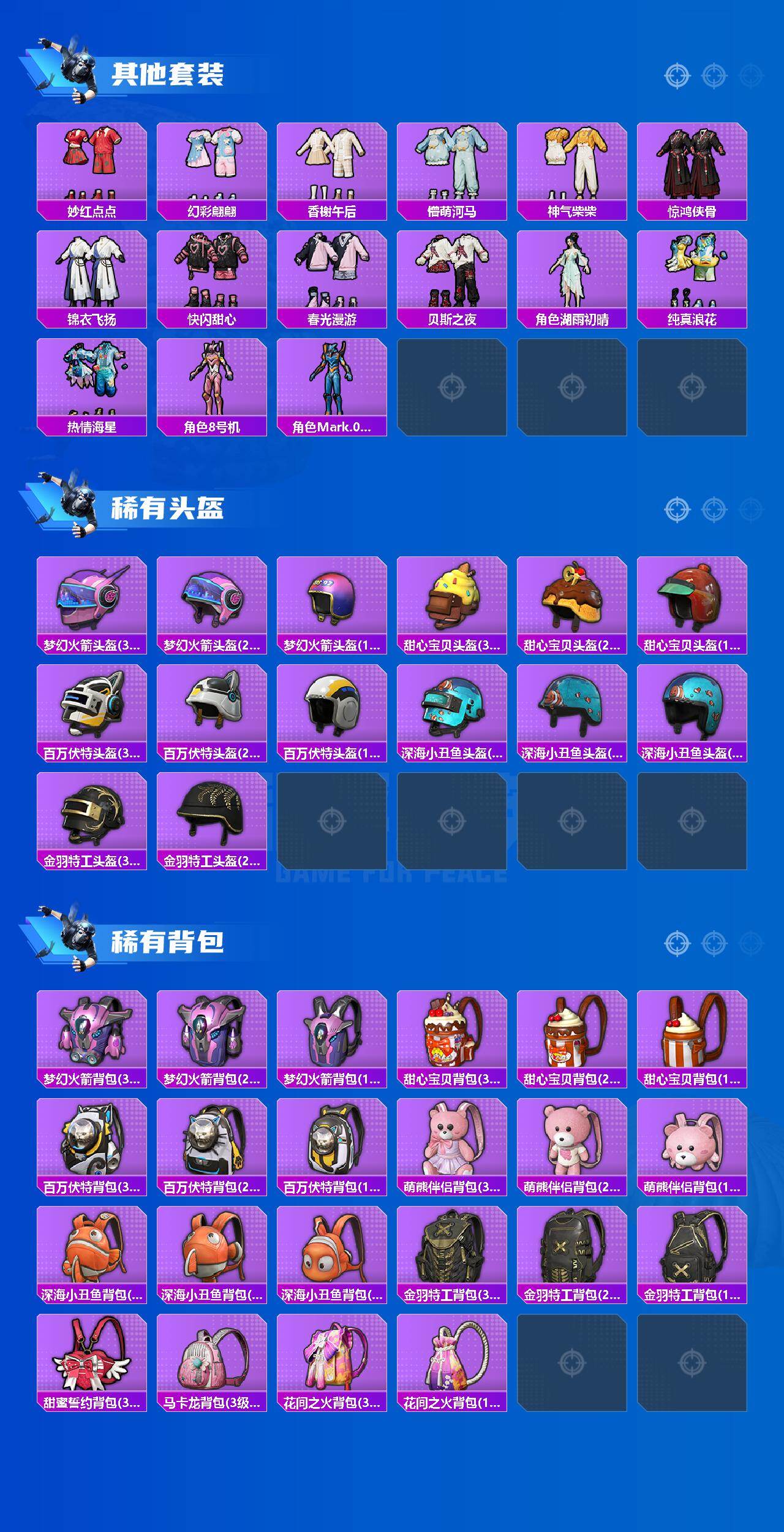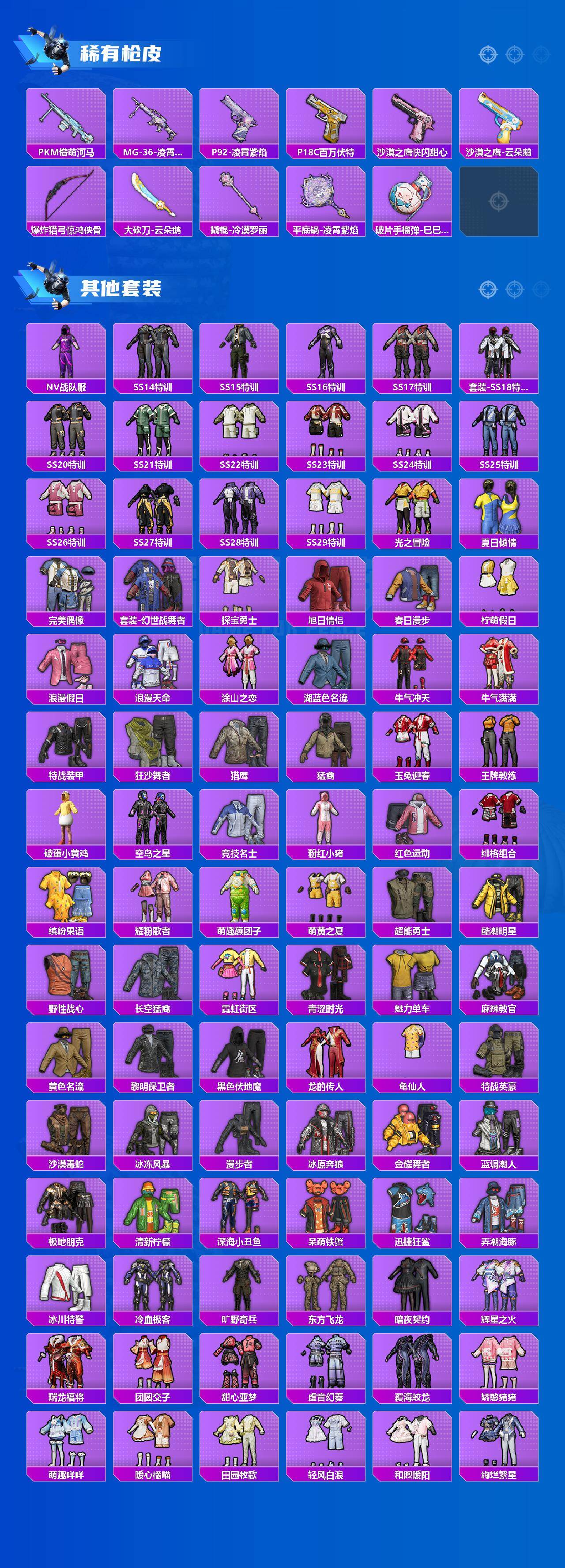 - [16335475]【店主推荐捡漏号!可直接换绑】安卓 手Q-18粉装-13特效枪-5载具-9粉色飞行器-7.7w热力值-10王牌印记-117套装-204枪皮 【热门品类】:角色-忠真马岱,角色-忠义严颜,套装-龟仙人,角色-8号机,角色-Mark.06,大砍刀-青龙偃月刀,撬棍-龙胆亮银枪 【粉色套装】:粉装-星之彼岸,角色-宙之时溯,角色-冰炎战车,角色-紫钛骑兵,角色-圣堂之誓,粉装-机械师花傲天,角色-小蓝,角色-美琪,角色-狂花道·不知火舞,角色-绯穹魔姬,角色-奇迹舞步 美琪,角色-奇迹舞步 美雪,角色-花灵,角色-冰魄,角色-星渊,角色-灵玺,角色-异瞳寒姬,角色-震天雷神 【粉色枪皮等级】:AKM-绿萝繁花(五级),SCAR-L-彩装战姬(五级),M416-电玩时刻(五级),GROZA-无垠阁(三级),AUG-暖羊咩咩(五级),蜜獾-异瞳寒姬(七级),ARX-无垠阁(七级),UMP45-量子极限(五级),JS9-奇迹舞步(七级),Kar98K-巳巳如意(五级),M24-镜域双华(三级),DP-28-圣堂之誓(七级),DP-28-豹影疾电(五级) 【粉色载具】:保时捷911 敞篷版(极速黄),保时捷Panamera(梦幻青),保时捷918 Spyder(沉静蓝),保时捷Cayenne(激情红),盛世惊鸿摩托车,僚机-萌兔起飞 【粉色枪皮】:AKM-绿萝繁花,SCAR-L-彩装战姬,M416-电玩时刻,GROZA-无垠阁,AUG-暖羊咩咩,蜜獾-异瞳寒姬,ARX-无垠阁,UMP45-量子极限,JS9-奇迹舞步,Kar98K-巳巳如意,M24-镜域双华,DP-28-圣堂之誓,DP-28-豹影疾电 【粉色飞行器】:天之羽翼飞行器,沙丘之主天马,繁龙极客飞行器,镜域双华-灵镜之阶,龙翔九天飞行器,奇迹舞步飞行器,无垠阁飞行器,天象三御飞行器 【粉色降落伞】:梦幻火箭降落伞,星之彼岸降落伞,闲梦青缨降落伞,莲影清波降落伞,沙丘之主降落伞,小叽联名款降落伞,繁龙极客降落伞,江南烟雨降落伞,巴啦啦小魔仙降落伞,霓虹漫游降落伞,精灵梦叶罗丽降落伞,鸢尾晶梦降落伞,忍者神龟降落伞,临安公主降落伞,鬼刀降落伞,智耀战神降落伞,冷漠罗丽降落伞,奇迹舞步降落伞,异瞳寒姬降落伞,天象三御降落伞,炫彩糖果降落伞 【稀有套装】:套装-龟仙人,套装-巳巳如意,套装-雏菊兔兔,套装-萝兰蝴蝶,套装-小熊