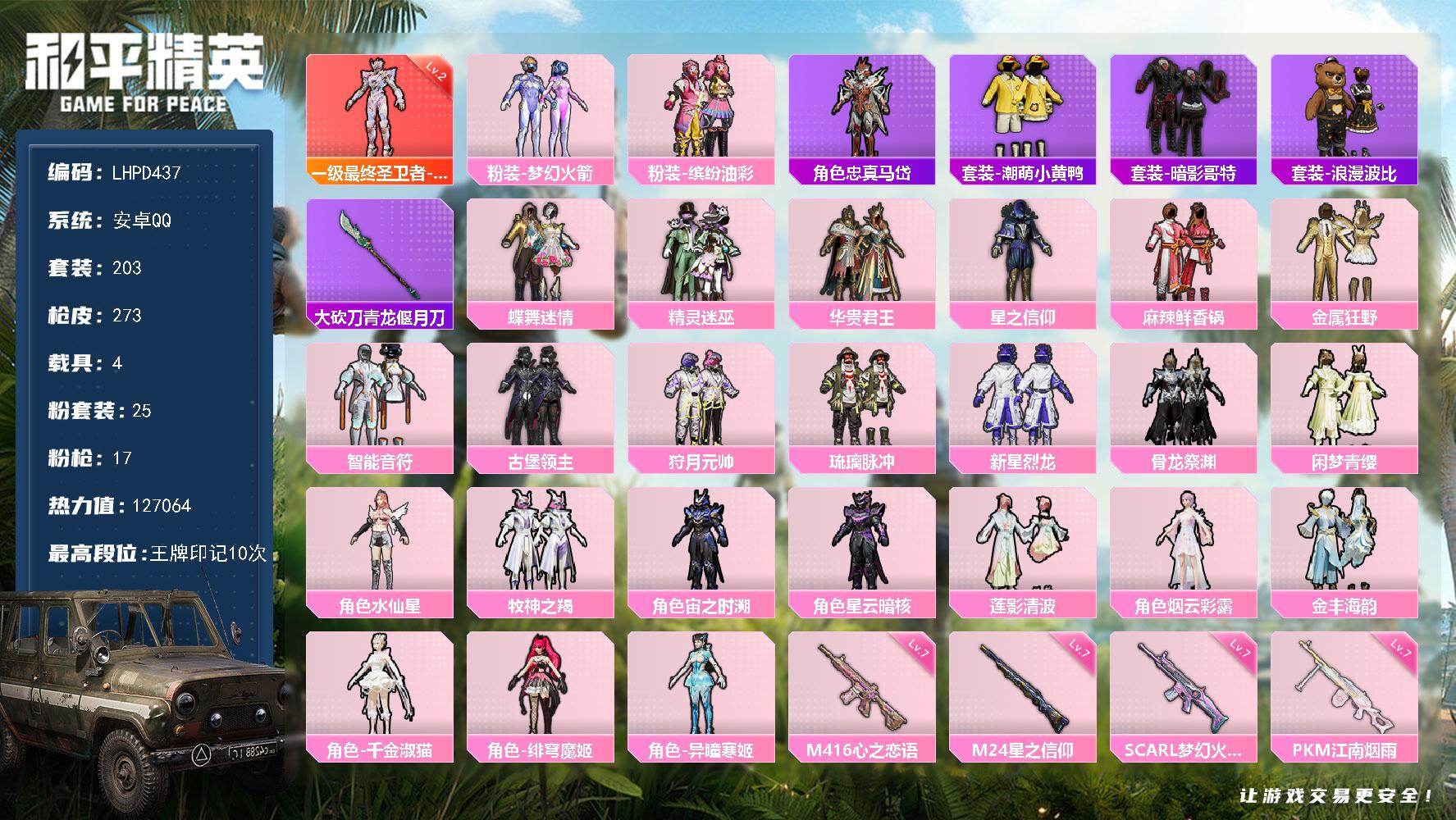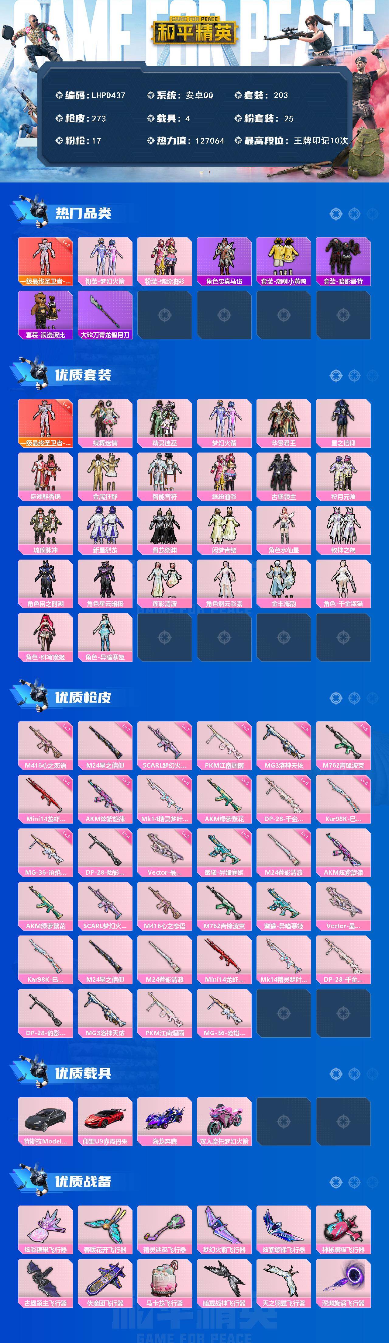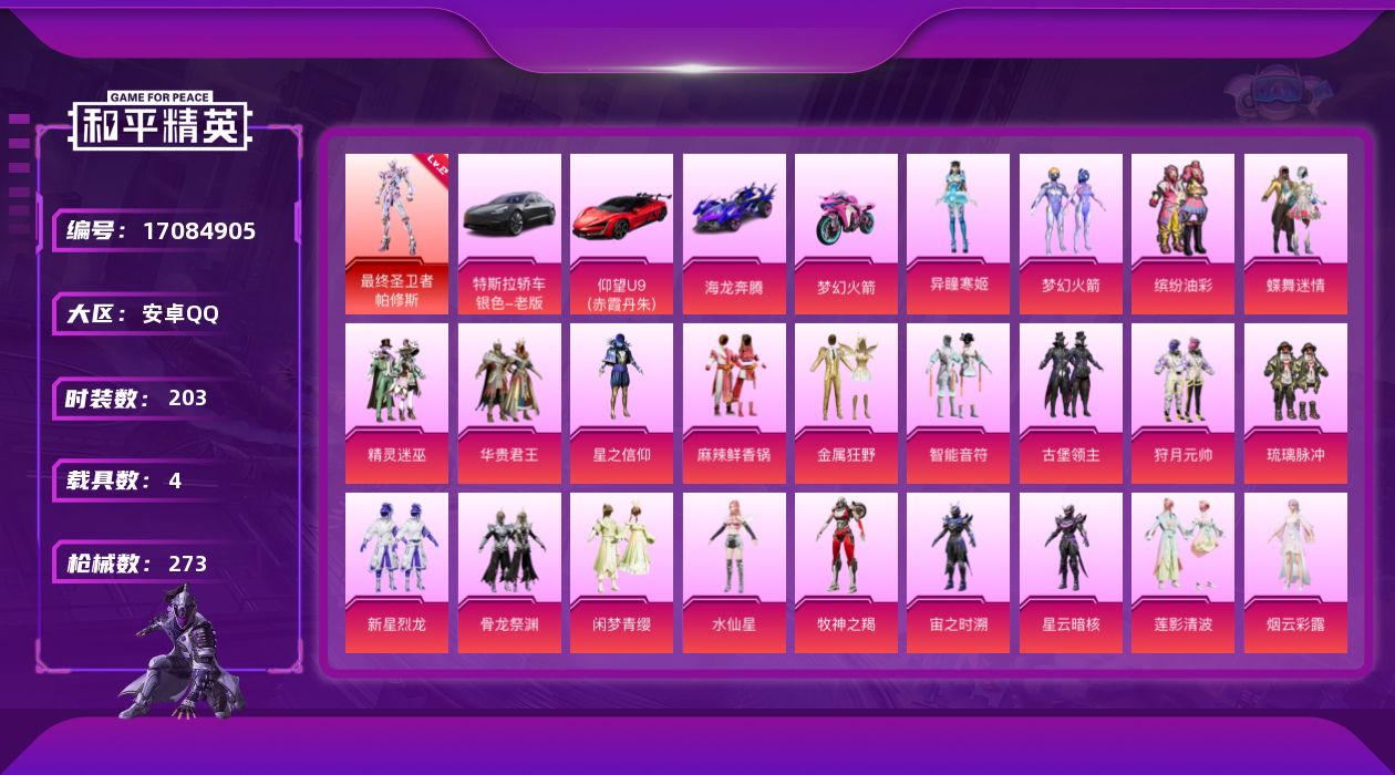 [17084905]【店主推荐捡漏号!可直接换绑】安卓 手Q-1神装-25粉装-17特效枪-4载具-16粉色飞行器-127064热力值-10王牌印记-203套装-273枪皮【红色神装等级】:最终圣卫者-帕修斯(二级)【红色角色神装】:最终圣卫者-帕修斯【热门品类】:粉装-梦幻火箭,粉装-缤纷油彩,角色-忠真马岱,套装-潮萌小黄鸭,套装-暗影哥特,套装-浪漫波比,大砍刀-青龙偃月刀【粉色套装】:粉装-蝶舞迷情,粉装-精灵迷巫,粉装-梦幻火箭,粉装-华贵君王,粉装-星之信仰,粉装-麻辣鲜香锅,粉装-金属狂野,粉装-智能音符,粉装-缤纷油彩,粉装-古堡领主,粉装-狩月元帅,粉装-琉璃脉冲,粉装-新星烈龙,粉装-骨龙祭渊,粉装-闲梦青缨,角色-水仙星,粉装-牧神之羯,角色-宙之时溯,角色-星云暗核,粉装-莲影清波,角色-烟云彩露,粉装-金丰海韵,角色-千金淑猫,角色-绯穹魔姬,角色-异瞳寒姬【粉色枪皮等级】:AKM-炫紫旋律(五级),AKM-绿萝繁花(五级),SCAR-L-梦幻火箭(七级),M416-心之恋语(七级),M762-青锋波束(五级),蜜獾-异瞳寒姬(二级),Vector-最终圣卫者(三级),Kar98K-巳巳如意(五级),M24-星之信仰(七级),M24-莲影清波(一级),Mini14-龙虾霸霸(五级),Mk14-精灵梦叶罗丽(五级),DP-28-千金淑猫(五级),DP-28-豹影疾电(四级),MG3-洛神天依(五级),PKM-江南烟雨(七级),MG-36-沧焰双生(五级)【粉色载具】:特斯拉Model 3(冷光银),仰望U9(赤霞丹朱),海龙奔腾,双人摩托-梦幻火箭【粉色枪皮】:AKM-炫紫旋律,AKM-绿萝繁花,SCAR-L-梦幻火箭,M416-心之恋语,M762-青锋波束,蜜獾-异瞳寒姬,Vector-最终圣卫者,Kar98K-巳巳如意,M24-星之信仰,M24-莲影清波,Mini14-龙虾霸霸,Mk14-精灵梦叶罗丽,DP-28-千金淑猫,DP-28-豹影疾电,MG3-洛神天依,PKM-江南烟雨,MG-36-沧焰双生【粉色飞行器】:炫彩糖果飞行器,春暖花开飞行器,精灵迷巫飞行器,梦幻火箭飞行器,炫紫旋律飞行器,神秘黑猫飞行器,古堡领主飞行器,伏魔团飞行器,马卡龙飞行器,暗翼战神飞行器,天之羽翼飞行器,深渊漩涡飞行器,时光之吻飞行器,时光之誓飞行器,终晖之翼飞行器