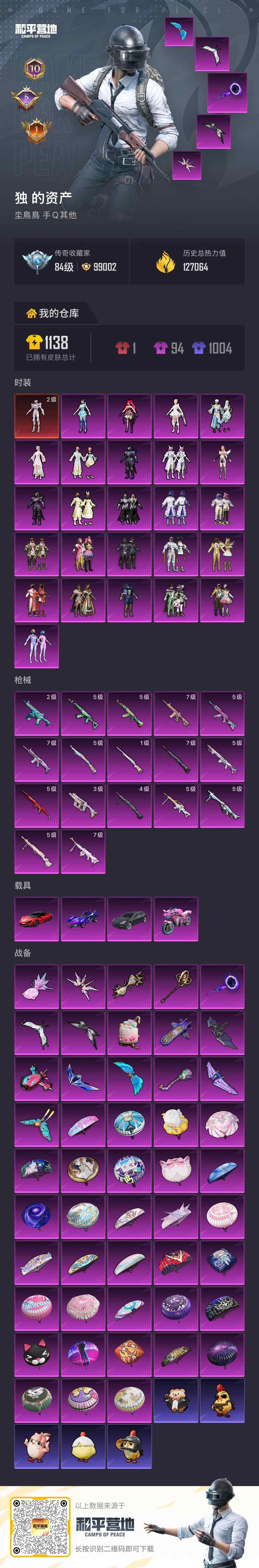 - PX_2101138-??/枪械13/装备457/载具2/战备230/王牌印记14/热力值119076/四级AKM-炫紫旋律/五级AKM-绿萝繁花/七级SCAR-L-纯梦嫁纱/七级M416-心之恋语/五级M416-电玩时刻/五级GROZA-镜光银凌/四级AUG-圣斗士星矢/六级M762-甜蜜誓约/七级UMP45-恐龙拽拽/四级Kar98K-巳巳如意/三级M417-第五大道/一级DP-28-千金淑猫