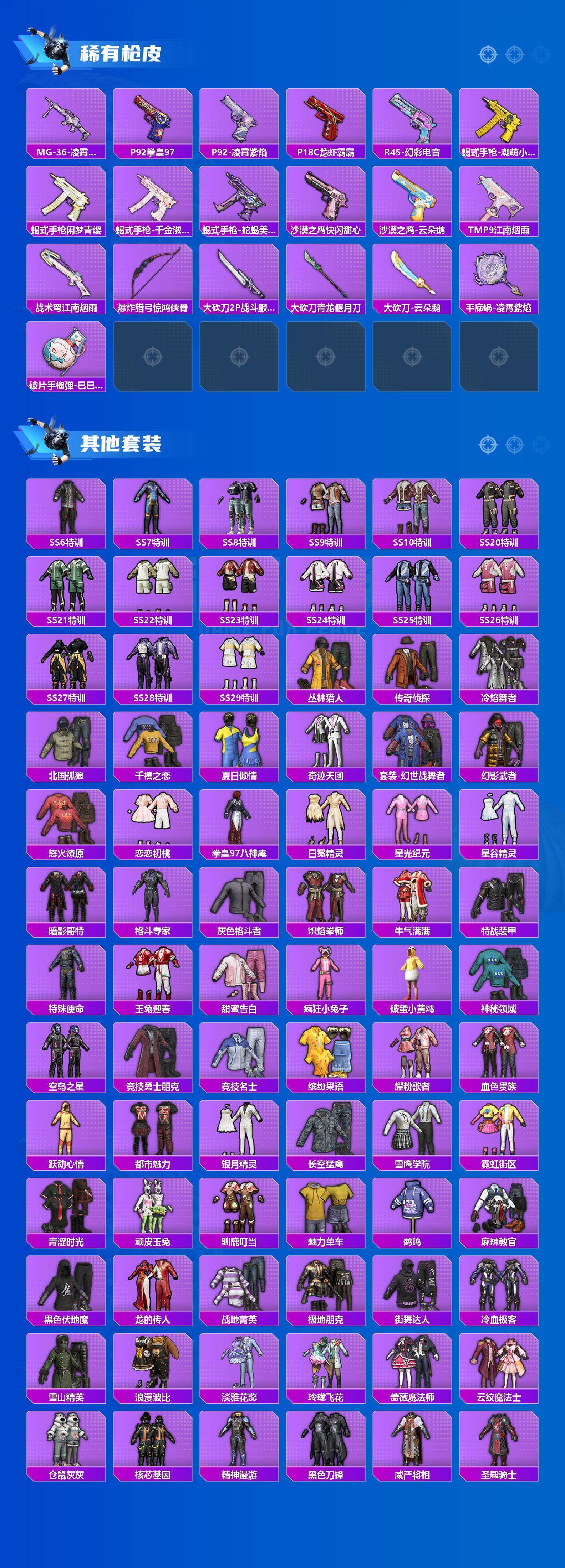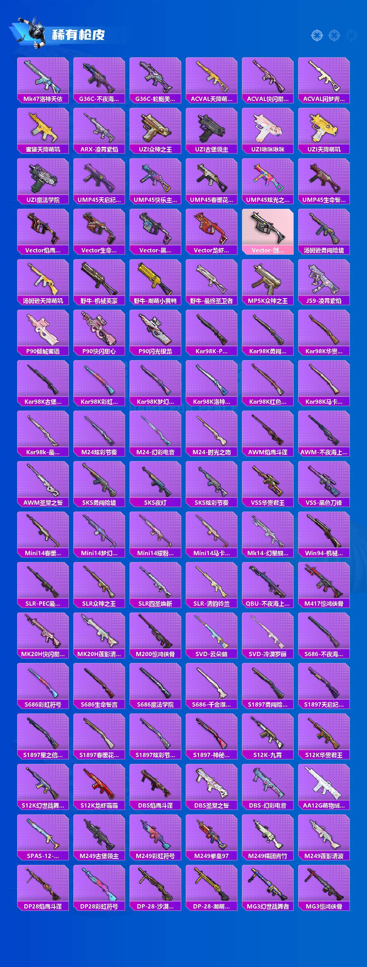 AKM-炫紫旋律,AKM-绿萝繁花,SCAR-L-梦幻火箭,M416-心之恋语,M762-青锋波束,Kar98K-巳巳如意,M24-星之信仰,M24-莲影清波,Mini14-龙虾霸霸,Mk14-精灵梦叶罗丽,DP-28-千金淑猫,MG3-洛神天依,PKM-江南烟雨