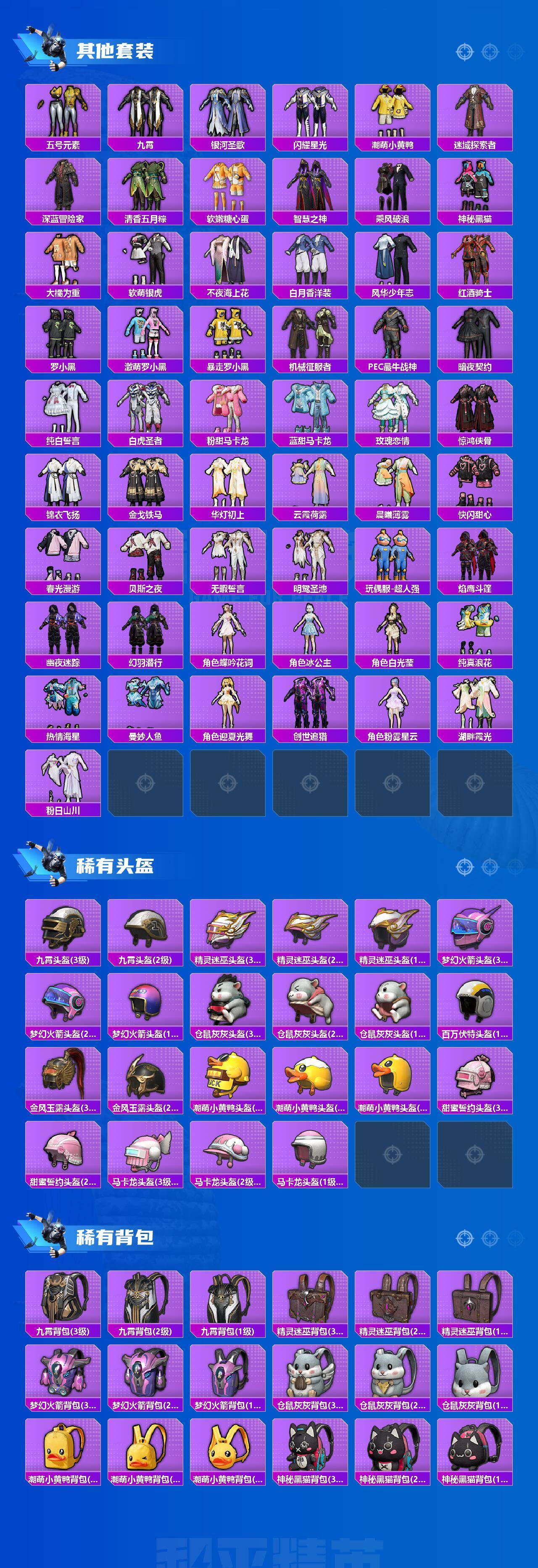 套装-梦幻火箭,套装-缤纷油彩,套装-潮萌小黄鸭,套装-浪漫波比,套装-蝶舞迷情,套装-精灵迷巫,套装-华贵君王,套装-星之信仰,套装-麻辣鲜香锅,套装-金属狂野,套装-智能音符,套装-古堡领主,套装-狩月元帅,套装-琉璃脉冲,套装-新星烈龙,套装-骨龙祭渊,套装-闲梦青缨,角色-水仙星,套装-牧神之羯,角色-宙之时溯,角色-星云暗核,套装-莲影清波,角色-烟云彩露,套装-金丰海韵,角色-千金淑猫,奇迹天团套装,套装-仓鼠灰灰,套装-神秘黑猫,套装-大橘为重,套装-软萌银虎,套装-罗小黑,套装-暴走罗小黑